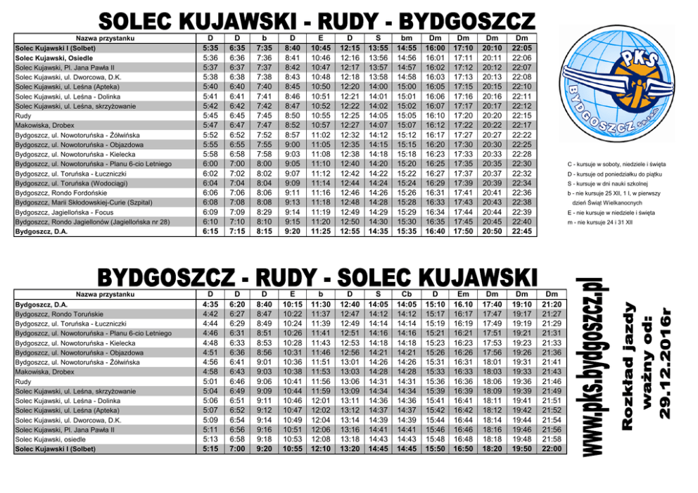 Nazwa przystanku Solec Kujawski I (Solbet) Solec Kujawski, Osiedle Solec Kujawski, Pl. Jana Pawła II Solec Kujawski, ul. Dworcowa, D.K. Solec Kujawski, ul. Leśna (Apteka) Solec Kujawski, ul. Leśna - Dolinka Solec Kujawski, ul. Leśna, skrzyżowanie Rudy Makowiska, Drobex Bydgoszcz, ul. Nowotoruńska - Żółwińska Bydgoszcz, ul. Nowotoruńska - Objazdowa Bydgoszcz, ul. Nowotoruńska - Kielecka Bydgoszcz, ul. Nowotoruńska - Planu 6-cio Letniego Bydgoszcz, ul. Toruńska - Łuczniczki Bydgoszcz, ul. Toruńska (Wodociągi) Bydgoszcz, Rondo Fordońskie Bydgoszcz, Marii Skłodowskiej-Curie (Szpital) Bydgoszcz, Jagiellońska - Focus Bydgoszcz, Rondo Jagiellonów (Jagiellońska nr 28) Bydgoszcz, D.A. D 5:35 5:36 5:37 5:38 5:40 5:41 5:42 5:45 5:47 5:52 5:55 5:58 6:00 6:02 6:04 6:06 6:08 6:09 6:10 6:15 D 6:35 6:36 6:37 6:38 6:40 6:41 6:42 6:45 6:47 6:52 6:55 6:58 7:00 7:02 7:04 7:06 7:08 7:09 7:10 7:15 b 7:35 7:36 7:37 7:38 7:40 7:41 7:42 7:45 7:47 7:52 7:55 7:58 8:00 8:02 8:04 8:06 8:08 8:29 8:10 8:15 D 8:40 8:41 8:42 8:43 8:45 8:46 8:47 8:50 8:52 8:57 9:00 9:03 9:05 9:07 9:09 9:11 9:13 9:14 9:15 9:20 E 10:45 10:46 10:47 10:48 10:50 10:51 10:52 10:55 10:57 11:02 11:05 11:08 11:10 11:12 11:14 11:16 11:18 11:19 11:20 11:25 D 12:15 12:16 12:17 12:18 12:20 12:21 12:22 12:25 12:27 12:32 12:35 12:38 12:40 12:42 12:44 12:46 12:48 12:49 12:50 12:55 S 13:55 13:56 13:57 13:58 14:00 14:01 14:02 14:05 14:07 14:12 14:15 14:18 14:20 14:22 14:24 14:26 14:28 14:29 14:30 14:35 bm 14:55 14:56 14:57 14:58 15:00 15:01 15:02 15:05 15:07 15:12 15:15 15:18 15:20 15:22 15:24 15:26 15:28 15:29 15:30 15:35 Dm 16:00 16:01 16:02 16:03 16:05 16:06 16:07 16:10 16:12 16:17 16:20 16:23 16:25 16:27 16:29 16:31 16:33 16:34 16:35 16:40 Dm 17:10 17:11 17:12 17:13 17:15 17:16 17:17 17:20 17:22 17:27 17:30 17:33 17:35 17:37 17:39 17:41 17:43 17:44 17:45 17:50 Dm 20:10 20:11 20:12 20:13 20:15 20:16 20:17 20:20 20:22 20:27 20:30 20:33 20:35 20:37 20:39 20:41 20:43 20:44 20:45 20:50 Dm 22:05 22:06 22:07 22:08 22:10 22:11 22:12 22:15 22:17 22:22 22:25 22:28 22:30 22:32 22:34 22:36 22:38 22:39 22:40 22:45 Nazwa przystanku Bydgoszcz, D.A. Bydgoszcz, Rondo Toruńskie Bydgoszcz, ul. Toruńska - Łuczniczki Bydgoszcz, ul. Nowotoruńska - Planu 6-cio Letniego Bydgoszcz, ul. Nowotoruńska - Kielecka Bydgoszcz, ul. Nowotoruńska - Objazdowa Bydgoszcz, ul. Nowotoruńska - Żółwińska Makowiska, Drobex Rudy Solec Kujawski, ul. Leśna, skrzyżowanie Solec Kujawski, ul. Leśna - Dolinka Solec Kujawski, ul. Leśna (Apteka) Solec Kujawski, ul. Dworcowa, D.K. Solec Kujawski, Pl. Jana Pawła II Solec Kujawski, osiedle Solec Kujawski I (Solbet) D 4:35 4:42 4:44 4:46 4:48 4:51 4:56 4:58 5:01 5:04 5:06 5:07 5:09 5:11 5:13 5:15 D 6:20 6:27 6:29 6:31 6:33 6:36 6:41 6:43 6:46 6:49 6:51 6:52 6:54 6:56 6:58 7:00 D 8:40 8:47 8:49 8:51 8:53 8:56 9:01 9:03 9:06 9:09 9:11 9:12 9:14 9:16 9:18 9:20 E 10:15 10:22 10:24 10:26 10:28 10:31 10:36 10:38 10:41 10:44 10:46 10:47 10:49 10:51 10:53 10:55 b 11:30 11:37 11:39 11:41 11:43 11:46 11:51 11:53 11:56 11:59 12:01 12:02 12:04 12:06 12:08 12:10 D 12:40 12:47 12:49 12:51 12:53 12:56 13:01 13:03 13:06 13:09 13:11 13:12 13:14 13:16 13:18 13:20 S 14:05 14:12 14:14 14:16 14:18 14:21 14:26 14:28 14:31 14:34 14:36 14:37 14:39 14:41 14:43 14:45 Cb 14:05 14:12 14:14 14:16 14:18 14:21 14:26 14:28 14:31 14:34 14:36 14:37 14:39 14:41 14:43 14:45 D 15:10 15:17 15:19 15:21 15:23 15:26 15:31 15:33 15:36 15:39 15:41 15:42 15:44 15:46 15:48 15:50 Em 16.10 16:17 16:19 16:21 16:23 16:26 16:31 16:33 16:36 16:39 16:41 16:42 16:44 16:46 16:48 16:50 Dm 17:40 17:47 17:49 17:51 17:53 17:56 18:01 18:03 18:06 18:09 18:11 18:12 18:14 18:16 18:18 18:20 Dm 19:10 19:17 19:19 19:21 19:23 19:26 19:31 19:33 19:36 19:39 19:41 19:42 19:44 19:46 19:48 19:50 C - kursuje w soboty, niedziele i święta D - kursuje od poniedziałku do piątku S - kursuje w dni nauki szkolnej b - nie kursuje 25 XII, 1 I, w pierwszy dzień Świąt Wielkanocnych E - nie kursuje w niedziele i święta m - nie kursuje 24 i 31 XII Dm 21:20 21:27 21:29 21:31 21:33 21:36 21:41 21:43 21:46 21:49 21:51 21:52 21:54 21:56 21:58 22:00