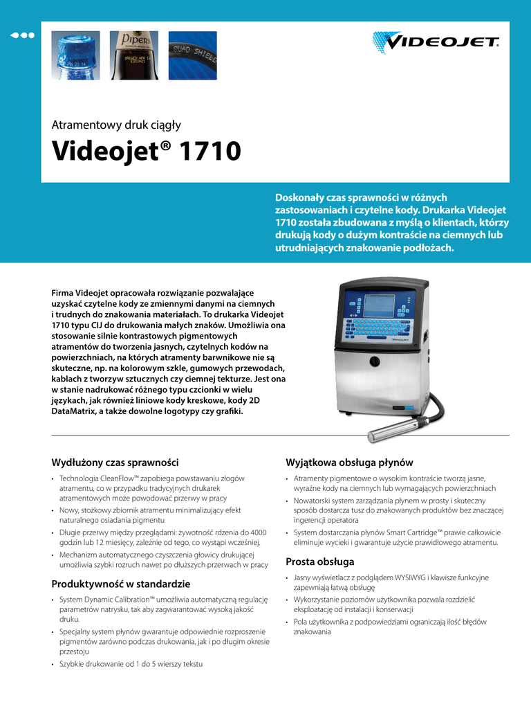 Atramentowy druk ciągły Videojet® 1710 Doskonały czas sprawności w różnych zastosowaniach i czytelne kody. Drukarka Videojet 1710 została zbudowana z myślą o klientach, którzy drukują kody o dużym kontraście na ciemnych lub utrudniających znakowanie podłożach. Firma Videojet opracowała rozwiązanie pozwalające uzyskać czytelne kody ze zmiennymi danymi na ciemnych i trudnych do znakowania materiałach. To drukarka Videojet 1710 typu CIJ do drukowania małych znaków. Umożliwia ona stosowanie silnie kontrastowych pigmentowych atramentów do tworzenia jasnych, czytelnych kodów na powierzchniach, na których atramenty barwnikowe nie są skuteczne, np. na kolorowym szkle, gumowych przewodach, kablach z tworzyw sztucznych czy ciemnej tekturze. Jest ona w stanie nadrukować różnego typu czcionki w wielu językach, jak również liniowe kody kreskowe, kody 2D DataMatrix, a także dowolne logotypy czy grafiki. Wydłużony czas sprawności Wyjątkowa obsługa płynów • Technologia CleanFlow™ zapobiega powstawaniu złogów atramentu, co w przypadku tradycyjnych drukarek atramentowych może powodować przerwy w pracy • Atramenty pigmentowe o wysokim kontraście tworzą jasne, wyraźne kody na ciemnych lub wymagających powierzchniach • Nowy, stożkowy zbiornik atramentu minimalizujący efekt naturalnego osiadania pigmentu • Nowatorski system zarządzania płynem w prosty i skuteczny sposób dostarcza tusz do znakowanych produktów bez znaczącej ingerencji operatora • Długie przerwy między przeglądami: żywotność rdzenia do 4000 godzin lub 12 miesięcy, zależnie od tego, co wystąpi wcześniej. • System dostarczania płynów Smart Cartridge™ prawie całkowicie eliminuje wycieki i gwarantuje użycie prawidłowego atramentu. • Mechanizm automatycznego czyszczenia głowicy drukującej umożliwia szybki rozruch nawet po dłuższych przerwach w pracy Prosta obsługa Produktywność w standardzie • Jasny wyświetlacz z podglądem WYSIWYG i klawisze funkcyjne zapewniają łatwą obsługę • System Dynamic Calibration™ umożliwia automatyczną regulację parametrów natrysku, tak aby zagwarantować wysoką jakość druku. • Wykorzystanie poziomów użytkownika pozwala rozdzielić eksploatację od instalacji i konserwacji • Specjalny system płynów gwarantuje odpowiednie rozproszenie pigmentów zarówno podczas drukowania, jak i po długim okresie przestoju • Szybkie drukowanie od 1 do 5 wierszy tekstu • Pola użytkownika z podpowiedziami ograniczają ilość błędów znakowania Videojet® 1710 Atramentowy druk ciągły Rdzeń skonstruowany specjalnie do atramentów pigmentowych Głowica drukująca zapewnia dłuższą pracę bez czyszczenia • inteligentne połączenie filtrów pigmentowych z podzespołami o zbliżonym czasie eksploatacji przekłada się na łatwość konserwacji i niezawodność • Nowy, stożkowy zbiornik atramentu minimalizuje efekt naturalnego osiadania pigmentu • Rdzeń pozwala uniknąć nieporządku związanego z wymianami filtra i pompy • Wysoko wydajna dysza precyzyjnie formuje i kieruje kropelki atramentu, zmniejszając zanieczyszczanie głowicy drukującej • Cyrkulacja płynów przez kolektor zapewnia czystość przy uruchamianiu i zatrzymywaniu • Przefiltrowane powietrze napływające przez perforowany panel przedni odsuwa od głowicy strumień tuszu i kurz, ograniczając tworzenie się złogów • Gładka powierzchnia ułatwia usuwanie atramentu pigmentowego Maksymalna szybkość linii Zintegrowany przewód głowicy drukującej 1–5 wierszy, do 888 st./min (271 m/min) przy 60 dpi (zobacz Próbne nadruki – przewodnik) Konfiguracja matrycy czcionki Długość 9,8’ (3 m), opcjonalnie 19,7’ (6 m), średnica 0,9” (23 mm), promień zagięcia 3” (76 mm) Zakres rozdzielczości; od 5x5 do 25x34, druk mozaikowy (zobacz Próbne nadruki – przewodnik) Pojemniki z płynem Liniowe kody kreskowe* Zakres temperatury/wilgotności Kody DataMatrix* W przypadku niektórych tuszów rzeczywista instalacja może wymagać dodatkowego sprzętu stosownie do warunków środowiska produkcyjnego. UPC-A/E, EAN-8/13, kod 128 A/B/C, UCC/EAN 128, kod 39, przeplatany 2 z 5, GS1 Od 10x10 do 32x32 i od 18x8 do 48x16 Znamionowa wysokość znaku Od 0,080” (2 mm) do 0,40” (10 mm), zależnie od czcionki Odległość natrysku Od 0,2” (5 mm) do 0,6” (15 mm), optymalna 0,5” (12 mm) Klawiatura Membranowa z potwierdzeniem dotykowym. 72 klawisze alfanumeryczne i klawisze funkcyjne. Układ przypominający typową klawiaturę komputera. Wyświetlacz Jasny ekran LCD z podświetleniem o rozdzielczości 320x240 i przekątnej 5,7” (14,5 cm) Własne logo/grafiki Tworzone przez użytkownika za pomocą drukarki lub komputera i importowane przez USB Wkłady: atrament 0,63 qt (600 ml), płyn uzupełniający 0.79 qt (750 ml) Od 41 ºF do 113 ºF (od 5 ºC do 45 ºC), 0-90% wilgotności względnej (bez kondensacji) Wymagania dotyczące instalacji elektrycznej Prąd przemienny 100–120 / 200-240 V przy 50/60 Hz, 120 W Masa w przybliżeniu 46 funtów (21 kg) Opcje IP65 ze stalą nierdzewną 316 (brak konieczności pobierania powietrza z fabryki) Osuszacz powietrza do wilgotnego środowiska (wymaga powietrza z fabryki) Dysza o rozmiarze 60 lub 70 mikronów Wersja dopuszczona do kontaktu z żywnością Głowica drukująca pod kątem 90 stopni Szeroka gama akcesoriów 14,21” (361 mm) 15,12” (384 mm) Zestawy znaków 9,80” (249,1 mm) Angielski, arabski, bułgarski, chiński, wschodnioeuropejski, grecki, hebrajski, kanji, koreański, rosyjski, skandynawski, turecki 8,23” (209,1 mm) Języki i opcje interfejsu 21,77” (553 mm) angielski, arabski, bułgarski, chiński uproszczony, chiński tradycyjny, czeski, duński, fiński, francuski, grecki, hebrajski, hiszpański, holenderski, japoński, koreański, niemiecki, norweski, polski, portugalski, rosyjski, szwedzki, tajski, turecki, węgierski, wietnamski i włoski Interfejs danych 10,62” 