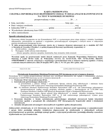 ......................................., dnia ...................... (pieczęć KM/P kierującej na test) KARTA SKIEROWANIA CZŁONKA OSP BIORĄCEGO BEZPOŚREDNI UDZIAŁ W DZIAŁANIACH RATOWNICZYCH NA TEST W KOMORZE DYMOWEJ przeprowadzany w dniu ……………….. 20 .. .. r. Imię, nazwisko ………………………………………………. Imię ojca ………………………………..... Data i miejsce urodzenia ……………………………………………….. , woj. ……….…………………. Jednostka OSP w …………………….…, gmina …………….……….., powiat ………………………... Wyszkolenie (ukończony kurs OSP) ................................................................... Adres zamieszkania ……………………………………...……….….….. , woj. …………………………. Sposób rekrutacji na test 1. Kierowany składa kierującemu na test Komendantowi M/P, w wyznaczonym przez niego miejscu i terminie, kserokopie dokumentów, potwierdzone za zgodność z oryginałem, poświadczających wymagania, o których mowa w załączonym poniżej oświadczeniu kierującego na test. 2. W dniu przeprowadzania testu kierowany stawia się w komorze dymowej mieszczącej się w siedzibie KP PSP w Sieradzu ul. Grzesika i Piwnika 1, w pełnej dyspozycji fizycznej i psychicznej, wyposażony w: a. dowód osobisty – oryginał, b. Wymagane: środki ochrony indywidualnej: ubranie specjalne, rękawice specjalne, kominiarka, buty strażackie, hełm strażacki Wyrażam zgodę na przetwarzanie moich danych osobowych przez Komendę Wojewódzką Państwowej Straży Pożarnej w Łodzi 90-521 Łódź, ul. Wólczańska 111/113, tel. 42 631-51-04, NIP: 727-01-34-501; REGON: 47006383500000 w zakresie związanym z organizacją i prowadzeniem testu w komorze dymowej zgodnie z Ustawą o ochronie danych osobowych z dnia 29 sierpnia 1997 r. (Dz. U. Nr 133, poz. 833 z późn. zm.) ………………………………… miejscowość, data ………………………………….. czytelny podpis kierowanego na test Oświadczenie Komendanta Miejskiego/Powiatowego PSP kierującego na test w komorze dymowej. Stwierdzam, że w wyniku przeprowadzonej rekrutacji oraz weryfikacji dokumentów (do wglądu w dokumentacji szkolenia prowadzonej w KM/P PSP) kierowany na test w komorze dymowej dh ……………………….…………….……….posiada: 1. Ukończone 18 lat i nie przekroczone 60 lat. 2. Zaświadczenie potwierdzające ukończenie: ** a) przeszkolenia z zakresu obsługi i użytkowania Sprzętu ochrony dróg oddechowych i minimum kursu Szeregowców OSP wydane przez właściwego Komendanta Miejskiego/Powiatowego PSP, lub - b) minimum Szkolenia Podstawowego Strażaków Ratowników OSP cz.II lub realizowanego jednoetapowo (przeprowadzonych według nowego programu szkolenia zgodnie z obowiązującym od 11.05.2006 roku Systemem Szkolenia Członków OSP Biorących Bezpośredni Udział w Działaniach Ratowniczych), lub - c) zrealizowanego tematu „Sprzęt ochrony dróg oddechowych” w ramach aktualnie trwającego Szkolenia Podstawowego Strażaków Ratowników OSP cz. II (lub realizowanego jednoetapowo), wydane przez właściwego Komendanta Miejskiego/Powiatowego PSP. 3. Orzeczenie lekarskie w formie zaświadczenia potwierdzające aktualność okresowych badań lekarskich wystawione zgodnie z przepisami dla członka(ków) OSP biorącego(cych) bezpośredni udział w działaniach ratowniczych. 4. Aktualne ubezpieczenie od następstw nieszczęśliwych wypadków (polisa ubezpieczenia). Jednocześnie oświadczam, że w/w kierowany na test w komorze dymowej został wyposażony w umundurowanie i sprzęt, które posiadają aktualne świadectwa dopuszczenia do użytkowania w jednostkach ochrony przeciwpożarowej, są sprawne, spełniają wymogi zgodne z wytycznymi producenta i posiadają aktualny czasookres użytkowania na czas trwania testu. ……………................................................. (kierujący na szkolenie Komendant Miejski/Powiatowy PSP) ** podkreślić właściwy dla kierowanego podpunkt – a lub b lub c.