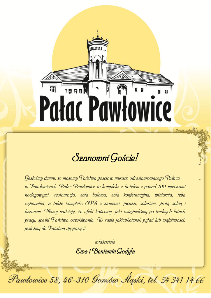 Szanowni Goście! Jesteśmy dumni, że możemy Państwa gościć w murach odrestaurowanego Pałacu w Pawłowicach. Pałac Pawłowice to kompleks z hotelem z ponad 100 miejscami noclegowymi, restauracja, sala balowa, sala konferencyjna, winiarnia, izba regionalna, a także kompleks SPA z saunami, jacuzzi, solarium, grotą solną i basenem. Mamy nadzieję, że efekt końcowy, jaki osiągnęliśmy po trudnych latach pracy, spełni Państwa oczekiwania. W razie jakichkolwiek pytań lub wątpliwości, jesteśmy do Państwa dyspozycji. właściciele Ewa i Beniamin Godyla Przekąski zimne Kalte Vorspeisen 1.Płat dobrego śledzika w śmietanie z jabłkiem lub w oliwie z cebulą Ein gutes Heringstück in Sahne mit Apfel oder in Olivenöl mit Zwiebel 10,00 2. Szlachetny tatar z woła z ogórkiem i cebulą podany z żółtkiem od jaja Edles Ochsentatar mit Gurke und Zwiebel serviert mit Eigelb 17,00 3. Siekane mięso z łososia z marynowanymi pieczarkami, cebulą, kaparami i grillowaną grzanką czosnkową. Gehacktes Lachsfleisch mit marinierten Champignons, Zwiebeln, Kapern und gegrillten Knoblauchtoast 14,00 4.Taca pałacowych wyrobów dla 2 osób: pieczyste, kiełbasy, pikle, smarowidła z żurawiną. Palastwarentablett für 2 Personen: Gebäck, Wurst, Mixedpickle Schmiermittel mit Moosbeere 28,00 Przekąski gorące Heiße Vorspeisen 10. Szpinak na oliwie z czosnkiem i płatkami parmezanu Spinat in Olivenöl mit Knoblauch und Parmesan 12,00 11. Duszone w śmietanie grzyby mieszane, podane z fasolką na masełku Gedünstete Mischpilze in Sahne, serviert mit Bohnen in Butter 15,00 12. Warzywa z pieca zapiekane w sosie serowym. Überbackenes Gemüse in Käsesoße 15,00 13. Pierogi hetmańskie z kartoflami, serem i cebulką smażone na blaszy podane z boczkiem lub śmietaną Hetmansmaultaschen mit Kartoffeln, Käse und Zwiebeln aus dem Blech, serviert mit Speck oder Sahne 13,00 14. Wątróbki drobiowe smażone z cebulą oraz jabłkiem Hühnerleber mit Zwiebel und Apfel 14,00 Zupy Suppen 20. Rosół tutejszy z makaronem Einheimische Hühnerbrühe mit Nudeln 6,00 21. Zupa z grzybów z naszych lasów trochę warzona do niej kluski zaparzone podługowate. Waldpilzensuppe mit den Pilzen aus unseren Wäldern, leicht gekocht mit Dampfnudeln 8,00 22. Flaki wołowe Rinderkutteln 8,00 23. Żurek nader posilny z jajem i kiełbasą. Überaus stärkende saure Mehlsuppe mit Ei und Wurst 7,00 24. Iście dworska zupa gulaszowa Wahrhaftig höfische Gulaschsuppe 8,00 Sałatki Salaten 70. Z tuńczykiem Mix sałat z pomidorem, ogórkiem, tuńczykiem i jajkiem sadzonym podana z grzanką czosnkowym. Mit Thunfisch. Salatmischung mit Tomaten, Gurken, Thunfisch und Spiegelei serviert mit Knoblauchtoast 17,00 71. Grecka Mix sałat, pomidor, ogórek, papryka, oliwki, cebula, ser feta z sosem winegret podana z grzanką czosnkową. Griechisch. Salatmischung, Tomate, Gurke, Paprika, Oliven, Zwiebel, Käse Feta mit Vinaigrette Sauce, serviert mit Knoblauchtoast 16,00 72. Cesarska Grillowany kurczak , sałaty, pomidor, ogórek, orzechy włoskie z sosem jogurtowym i grzanką czosnkową Keisersalat. Gegrilltes Hähnchen, Salate, Tomate, Gurke, Wallnüsse mit Joghurtsoße und Knoblauchtoast 18,00 Dania regionalne Landgerichte 30. Rolada śląska wieprzowa z kluskami i modrą kapustą Schlesische Roulade mit Klöße und Blaukraut 24,00 31. Rolada śląska wołowa z kluskami i modrą kapustą Rinderroulade mit Klöße und Blaukraut 29,00 32. Sznycel wiejski (schabowy) z frytkami i zestawem surówek Landschnitzel mit Pommes und Mischung von Salaten 19,00 33. Kawałek udźca pieczonego w całości w piecu z kapustą i kluskami Keulenstück mit Kraut und Klöße 25,00 34. Specjał tutejszej księżnej - grillowany filet z kurczaka podawany z ziemniakami pieczonymi i sałatką z pomidorów z dodatkiem cebuli Gegrillte Geflügelbrust serviert mit gebratenen Kartoffeln und Salat von Tomaten und Zwiebeln 20,00 Dania specjalne Sondergerichte 40. Pierś z kaczki na słodko w sosie żurawinowym z plackami ziemniaczanymi Entenbrust mit Cranberry-Sauce mit Kartoffelpuffer 39,00 41. Ulubiona polędwica Kasztelana w młotkowym pieprzu i ciemnym sosie, kartofle gniecione w ukropie Lieblingslande des Burgvogt Kastellan in Hammerpfeffer und dunkler Soße, Stampfkartoffeln aus siedendem Wasser 45,00 42. Udziec z dzika z sosem grzybowym, szyszkami ziemniaczanymi i zasmażaną kapustą Keulenstück vom Wildschwein mit Pilzsauce, Mehlschwitzekraut und Kartoffeln 28,00 . Półmisek rozmaitości Danie dla dwojga głodnych Platte für Zwei 43. Kark, schab, pieczyste z udźca, kartofle ze spyrką, kluchami, kapustą ciepłą, warzywami. Nacken, Schweinrücken, Keulenbraten, Kartoffeln mit Speck, Klöße, warmes Kraut und Gemüse 48,00 Dania główne Hauptgerichte 50. Polędwiczka wieprzowa szlachcica Wilhelma w sosie kurkowym z kartoflami, masełkiem i warzywami w migdałach. Schweinelandenbraten des Adeligen Wilhelm in Pfifferlingssoße mit Kartoffeln, Butter, Gemüse in Mandeln 26,00 51. Płat karku grillowany zapodany z frytkami i sosem słodko-kwaśnym Gegrillte Nackenscheibe serviert mit Pommes und süß-saurer Sauce 21,00 52. Placek ogrodnika z pikantnym gulaszem Gärtnerpuffer mit pikantem Gulasch 19,00 53. Kotlet gajowego- filet z kurczaka w sosie pieczarkowym lub szpinakowym z tłuczonymi kartoflami i warzywami na ciepło Hegemeisterkotelett - Hühnerfilet in Champignonsoße oder Spinatsoße 20,00 Dania główne Hauptgerichte 54. Przysmak dziedzica Rolada drobiowa w środku pieczarka, oscypek, szczypiorek zapodany z frytkami i surówką Leckerbissen des Gutsherrn Geflügelroulade gefüllt mit Champignons, Hartkäse aus Schafsmilch Schnittlauch, mit Pommes und Rohkost 22,00 55. Kotlet de Volai’le podawany z frytkami i surówką De Volai’le Kotelett serviert mit Pommes und Salad 20,00 56. Makaron Penne tricolore z kurczakiem i sosem serowym podany z sałatą Pasta Penne tricolore mit Hähnchen und Käse-Sauce serviert mit Salat 22,00 Ryby Fischgeri