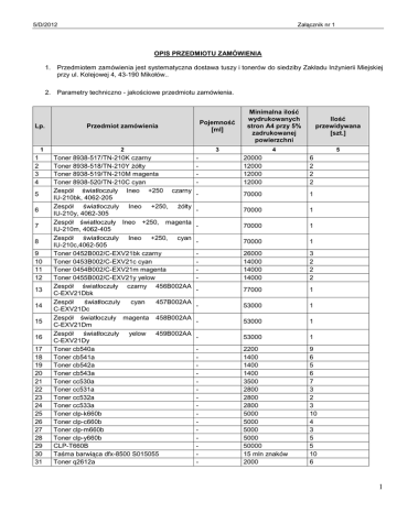 5/D/2012 Załącznik nr 1 OPIS PRZEDMIOTU ZAMÓWIENIA 1. Przedmiotem zamówienia jest systematyczna dostawa tuszy i tonerów do siedziby Zakładu Inżynierii Miejskiej przy ul. Kolejowej 4, 43-190 Mikołów.. 2. Parametry techniczno - jakościowe przedmiotu zamówienia. Lp. 1 1 2 3 4 5 6 7 8 9 10 11 12 13 14 15 16 17 18 19 20 21 22 23 24 25 26 27 28 29 30 31 Pojemność [ml] Przedmiot zamówienia 2 Toner 8938-517/TN-210K czarny Toner 8938-518/TN-210Y żółty Toner 8938-519/TN-210M magenta Toner 8938-520/TN-210C cyan Zespół światłoczuły Ineo +250 czarny IU-210bk, 4062-205 Zespół światłoczuły Ineo +250, żółty IU-210y, 4062-305 Zespół światłoczuły Ineo +250, magenta IU-210m, 4062-405 Zespół światłoczuły Ineo +250, cyan IU-210c,4062-505 Toner 0452B002/C-EXV21bk czarny Toner 0453B002/C-EXV21c cyan Toner 0454B002/C-EXV21m magenta Toner 0455B002/C-EXV21y yelow Zespół światłoczuły czarny 456B002AA C-EXV21Dbk Zespół światłoczuły cyan 457B002AA C-EXV21Dc Zespół światłoczuły magenta 458B002AA C-EXV21Dm Zespół światłoczuły yelow 459B002AA C-EXV21Dy Toner cb540a Toner cb541a Toner cb542a Toner cb543a Toner cc530a Toner cc531a Toner cc532a Toner cc533a Toner clp-k660b Toner clp-c660b Toner clp-m660b Toner clp-y660b CLP-T660B Taśma barwiąca dfx-8500 S015055 Toner q2612a Minimalna ilość wydrukowanych stron A4 przy 5% zadrukowanej powierzchni 3 Ilość przewidywana [szt.] 4 5 - 20000 12000 12000 12000 6 2 2 2 - 70000 1 - 70000 1 - 70000 1 - 70000 1 - 26000 14000 14000 14000 3 2 2 2 - 77000 1 - 53000 1 - 53000 1 - 53000 1 - 2200 1400 1400 1400 3500 2800 2800 2800 5000 5000 5000 5000 50000 15 mln znaków 2000 9 6 5 6 7 3 2 3 10 4 3 5 5 10 6 1 5/D/2012 Załącznik nr 1 32 33 34 35 36 37 38 39 Toner c7115x Toner q5949x Toner q7553x Toner MLT-D2092L Toner q3960a Toner q3961a Toner q3962a Toner q3963a - 40 Bęben światłoczuły q3964a - 41 42 43 44 45 46 47 48 49 50 51 52 53 54 55 56 57 58 59 60 61 62 63 64 65 66 67 68 69 Toner q6000a Toner q6001a Toner q6002a Toner q6003a Toner scx-4521d3 Toner ce278a Toner clt-k4092s Toner clt-y4092s Toner clt-m4092s Toner clt-c4092s Rolka utrwalająca JC96-05491B pojemnik na zużyty toner clt-w409 bęben światłoczuły clt-r409 Toner clt-k4072s Toner clt-y4072s Toner clt-m4072s Toner clt-c4072s bęben światłoczuły clt-r407 Tusz pgi-5bk Tusz cli-8bk Tusz cli-8c Tusz cli-8m Tusz cli-8y Tusz c6656ae Tusz c6657ae Tusz cd975ae Tusz cd972ae Tusz cd973ae Tusz cd974ae papier termoczuły: (max) 216mm*50m kx-f600 Toner kx-fa83 Bęben kx-fa84x 70 71 72 6 2 5 2 2 2 2 2 26 13 13 13 13 19 17 49 23 23 23 3500 6000 7000 5000 5000 4000 4000 4000 20000 w czerni 5000 w kolorze 2500 2000 2000 2000 3000 2100 1500 1000 1000 1000 5000 24000 1500 1000 1000 1000 24000 - - - 2 2500 2 2 1 6 4 4 6 2 11 2 1 1 1 1 2 1 2 1 1 1 1 6 2 2 2 2 5 2 10 5 6 6 3. Wszystkie oferowane materiały muszą być nie starsze niż 6 miesięcy, fabrycznie nowe, bez śladów używania i uszkodzenia, pełnowartościowe, nieregenerowane, nierefabrykowane. Za fabrycznie nowe nie uznaje się wyrobów, gdzie pojemnik został jedynie wyczyszczony i ponownie napełniony (regenerowany). 4. Wymaga się, aby oferowane materiały eksploatacyjne posiadały gwarancję na minimum 12 miesięcy od dnia dostawy. 2 5/D/2012 Załącznik nr 1 5. Dostarczone materiały eksploatacyjne muszą posiadać na opakowaniach zewnętrznych logo producenta, nazwę (typ, symbol) materiału, numer katalogowy, opis zawartości, termin przydatności do użycia. 6. Zamawiający nie dopuszcza zaoferowania tonerów i tuszy nieoryginalnych lub zamienników. 7. Dostawy będą realizowane, zgodnie z zapotrzebowaniem wysłanym przez zamawiającego faksem lub pocztą elektroniczną. 8. Termin realizacji zamówienia to max. 3 dni robocze od momentu wysłania zamówienia. 9. Zapłata wynagrodzenia nastąpi na podstawie protokołu odbioru podpisanego obustronnie oraz faktury VAT uwzględniającej ilość dostarczoną x cena podana w formularzu oferty. 10. Ceny jednostkowe podane w ofercie Wykonawcy będą niezmienne do końca obowiązywania umowy. 3