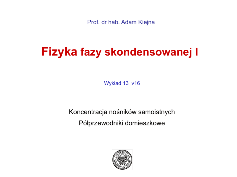 Prof. dr hab. Adam Kiejna Fizyka fazy skondensowanej I Wykład 13 v16 Koncentracja nośników samoistnych Półprzewodniki domieszkowe Przewodnictwo samoistne Bardzo czysty półprzewodnik (w niezbyt niskich temp.) => przewodnictwo samoistne W samoistnym przedziale temperatur właściwości półprzewodnika nie są modyfikowane przez domieszki w T = 0, puste pasmo przewodnictwa Przerwa energetyczna = najniższy punkt pasma przewodnictwa – najwyższy punkt pasma walencyjnego Ze wzrostem T => elektrony wzbudzane z pasma walencyjnego do pasma przewodnictwa W przewodnictwie elektrycznym biorą udział elektrony ( z pasma przewodnictwa), jak również stany nieobsadzone => dziury pozostałe w paśmie walencyjnym Nośniki samoistne Nośniki samoistne – elektrony i dziury. Dziura – nieobsadzony stan (orbital) w zapełnionym paśmie. W przyłożonym polu elektrycznym i magnetycznym dziura zachowuje się tak jak by była obdarzona dodatnim ładunkiem +e Ruch elektronów w paśmie przewodnictwa i dziur w paśmie walencyjnym w polu E Prędkości dryfu elektronów i dziur są przeciwne ale ich prądy elektryczne są w tym samym kierunku (pola elektrycznego) Masa efektywna elektronu w krysztale Krzywizna funkcji E(k) zmienia się bardzo w pobliżu granicy strefy. Im przerwa energetyczna jest mniejsza tym bardziej wzrasta krzywizna 1/m* i tym mniejsza jest masa efektywna │m*│ w pobliżu przerwy Eg Daleko od przerwy Eg krzywizny są zbliżone do krzywizny E(k) dla elektronów swobodnych (masa efektywna jest równa masie spoczynkowej). 4 Koncentracja nośników samoistnych Jak zależy koncentracja nośników samoistnych od Eg? Obliczamy liczbę elektronów, które w temperaturze T zostały wzbudzone do pasma przewodnictwa w zależności od potencjału chemicznego μ (poziomu Fermiego). Koncentracja nośników samoistnych W fizyce półprzewodników μ = poziom Fermiego ( f << 1) masa efektywna elektronu Koncentracja nośników samoistnych ε ε pasmo przewodnictwa Ec μ Skala energii użyta w obliczeniach. Eg = Ec – E v Poziom Fermiego Funkcja rozkładu Fermiego-Diraca jest pokazana w tej samej skali dla temperatury kBT << Eg Ev 0 pasmo walencyjne Przyjęto, że poziom Fermiego μ f (ε) leży w przerwie energetycznej (tak jak dla półprzewodnika samoistnego). Koncentracja nośników samoistnych () bo dziura to brak elektronu () Koncentracja dziur w paśmie walencyjnym Koncentracja nośników samoistnych nie zależy od poziomu Fermiego μ Iloczyn koncentracji ma wartość stałą w danej temperaturze (niezależną od koncentracji domieszek). Koncentracja nośników samoistnych Przy wyprowadzaniu, nie zakładaliśmy, że materiał jest samoistny. Jedynym założeniem było to, że energia krawędzi obydwu pasm jest duża w porównaniu do kBT W temperaturze 300 K iloczyn koncentracji n·p wynosi: 2,19 x 1019 [1/cm6 ] dla Si 2,89 x 1026 Ge 6,55 x 1012 GaAs Ponieważ iloczyn koncentracji elektronów i dziur ma wartość stałą w danej temperaturze wprowadzenie w niewielkiej proporcji domieszek, żeby zwiększyć n musi obniżyć p. Ten wynik ma duże znaczenie praktyczne – możemy obniżyć całkowitą koncentrację nośników n + p w domieszkowanym krysztale, wprowadzając w sposób kontrolowany odpowiednie domieszki. Redukcja taka jest nazywana kompensacją . Koncentracja nośników samoistnych i – intrinsic (samoistny) Z porównania () () Poziom Fermiego leży w połowie przerwy energet. Ruchliwość nośników w obszarze samoistnym Ruchliwość nośników W doskonałym półprzewodniku ruchliwość jest określona przez rozproszenia na drganiach sieci krystalicznej (zderzenia elektron-fonon). Wartości ruchliwości nośników w temp. pokojowej (cm2/ V·s) Kryształ Elektrony Dziury Kryształ Elektrony Dziury Diament 1800 1200 GaAs 8000 300 Si 1350 480 PbS 550 600 Ge 3600 1800 PbTe 2500 1000 InSb 800 450 AgCl 50 - InAs 30000 450 SiC 100 10-20 Kryształy o wąskiej przerwie energetycznej mają najczęściej dużą wartość ruchliwości. Powodem są ich małe masy efektywne. Przewodnictwo domieszkowe Domieszki i niedoskonałości sieci krystalicznej silnie wpływają na właściwości elektryczne półprzewodników. Dodatek 1 atomu boru na 105 atomów Si zwiększa 1000-krotnie przewodnictwo Si. Półprzewodniki takie nazywamy niedomiarowymi. Zjonizowane atomy domieszkowe, dostarczające 1 elektron nazywamy donorami. Donorowe stany domieszkowe w Si: Przewodnictwo domieszkowe Donorowe stany domieszkowe w Si: Energia jonizacji Ed 5. wartościowych domieszek w Si i Ge (meV) P As Sb Si 45 49 39 Ge 12,0 12,7 9,6 Nadmiarowy elektron porusza się w polu kulombowskim e/r jonu domieszki. Przewodnictwo domieszkowe Oszacowanie energii jonizacji domieszki: rn ≃ 30 Å dla Si, Energia jonizacji atomu wodoru = 13,6 eV ! εSi = 11,7, m* =0,2m, Ed ≈ 20 meV wartość dokładna Ed ≈ 30 meV Stany akceptorowe Akceptor – domieszka zabierająca elektron z pasma walencyjnego i pozostawiająca w nim dziurę. Krzem typu p dodatkowy ładunek - Si Si 3 wartościowy Bor może utworzyć wiązanie tetraedryczne tylko biorąc elektrony z wiązania Si-Si Si Si B + Si Si Si dodatnia dziura po usunięciu elektronu z wiązania Eg Energia jonizacji akceptorów Ed 3-wartościowych domieszek w Si i Ge (meV) B Al Ga In Si 45 57 65 157 Ge 10,4 10,2 10,8 11,2 poziom akceptorowy 0 Ea Półprzewodniki typu n i p Jeżeli przewodnictwo jest kontrolowane przez elektrony to mówimy, że materiał jest typu n. Jeżeli przeważają akceptory, przewodnictwo jest kontrolowane przez dziury – materiał jest typu p. Przewodnictwo różnego typu można wytworzyć w tym samym krysztale. Zastosowanie: złącza typu p-n Złącze p-n Tworzone w monokrysztale zmodyfikowanym w dwóch sąsiednich rejonach. Warstwa rozdzielająca obszary typu p i n na złączu. Rejon p Domieszki akceptorowe. Nośniki prądu – dziury Rejon n Domieszki donorowe. Nośniki prądu – elektrony Koncentracja dziur Koncentracja elektronów Zjonizowane (-) domiesz