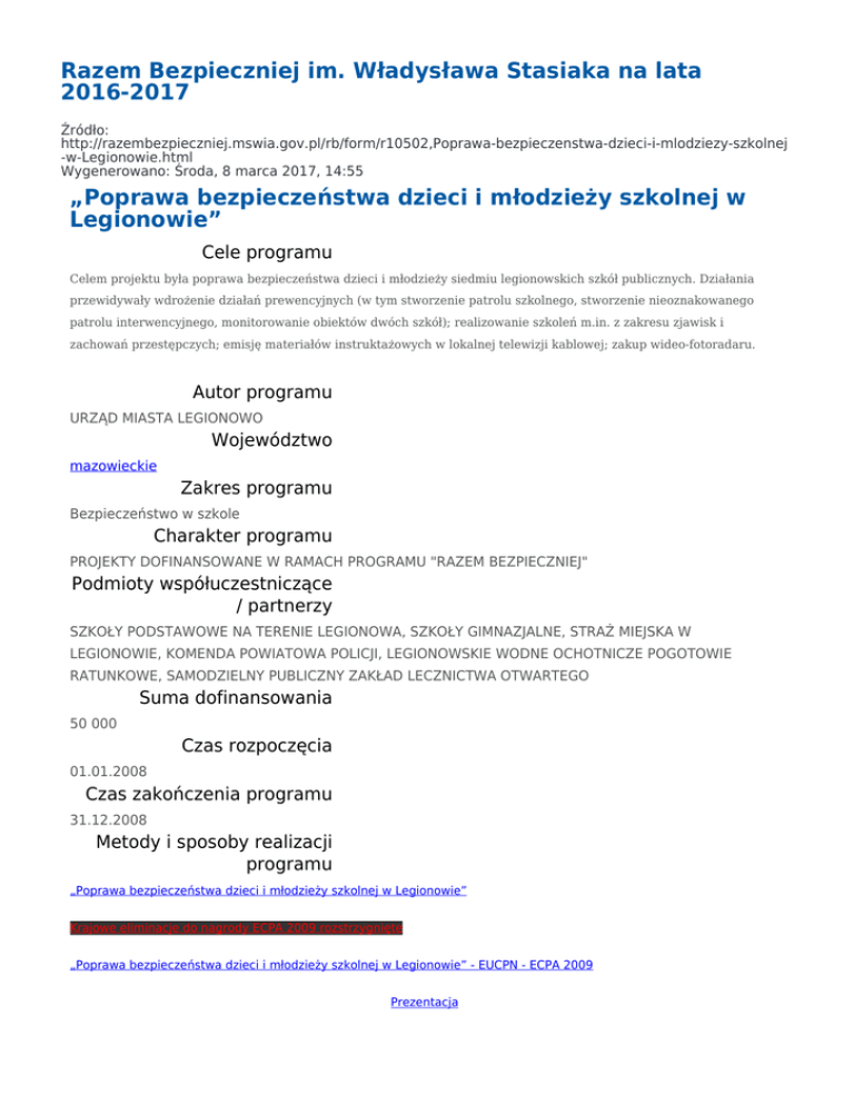 Razem Bezpieczniej im. Władysława Stasiaka na lata 2016-2017 Źródło: http://razembezpieczniej.mswia.gov.pl/rb/form/r10502,Poprawa-bezpieczenstwa-dzieci-i-mlodziezy-szkolnej -w-Legionowie.html Wygenerowano: Środa, 8 marca 2017, 14:55 „Poprawa bezpieczeństwa dzieci i młodzieży szkolnej w Legionowie” Cele programu Celem projektu była poprawa bezpieczeństwa dzieci i młodzieży siedmiu legionowskich szkół publicznych. Działania przewidywały wdrożenie działań prewencyjnych (w tym stworzenie patrolu szkolnego, stworzenie nieoznakowanego patrolu interwencyjnego, monitorowanie obiektów dwóch szkół); realizowanie szkoleń m.in. z zakresu zjawisk i zachowań przestępczych; emisję materiałów instruktażowych w lokalnej telewizji kablowej; zakup wideo-fotoradaru. Autor programu URZĄD MIASTA LEGIONOWO Województwo mazowieckie Zakres programu Bezpieczeństwo w szkole Charakter programu PROJEKTY DOFINANSOWANE W RAMACH PROGRAMU "RAZEM BEZPIECZNIEJ" Podmioty współuczestniczące / partnerzy SZKOŁY PODSTAWOWE NA TERENIE LEGIONOWA, SZKOŁY GIMNAZJALNE, STRAŻ MIEJSKA W LEGIONOWIE, KOMENDA POWIATOWA POLICJI, LEGIONOWSKIE WODNE OCHOTNICZE POGOTOWIE RATUNKOWE, SAMODZIELNY PUBLICZNY ZAKŁAD LECZNICTWA OTWARTEGO Suma dofinansowania 50 000 Czas rozpoczęcia 01.01.2008 Czas zakończenia programu 31.12.2008 Metody i sposoby realizacji programu „Poprawa bezpieczeństwa dzieci i młodzieży szkolnej w Legionowie” Krajowe eliminacje do nagrody ECPA 2009 rozstrzygnięte „Poprawa bezpieczeństwa dzieci i młodzieży szkolnej w Legionowie” - EUCPN - ECPA 2009 Prezentacja Zakres działania / zakres przeciwdziałania nieletni