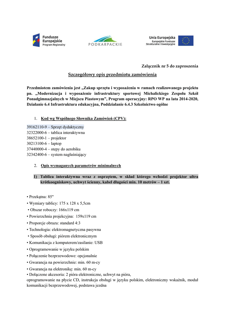 Załącznik nr 5 do zaproszenia Szczegółowy opis przedmiotu zamówienia Przedmiotem zamówienia jest ,,Zakup sprzętu i wyposażenia enia w ramach realizowanego projektu pn. ,,Modernizacja i wyposażenie wyposażenie infrastruktury sportowej Michalickiego Zespołu Szkół Ponadgimnazjalnych w Miejscu Piastowym”, Program operacyjny: RPO WP na lata 2014-2020, 2014 Działanie 6.4 Infrastruktura edukacyjna, Poddziałanie 6.4.3 Szkolnictwo ogólne 1. Kod wg Wspólnego Słownika Zamówień Zamówie (CPV): 39162110-9 – Sprzętt dydaktyczny 32322000-6 – tablica interaktywna 38652100-1 – projektor 30213100-6 – laptop 37440000-4 – stepy do aerobiku 32342400-6 – system nagłaśniają śniający 2. Opis wymaganych parametrów minimalnych 1) Tablica interaktywna wraz z osprzętem, osprz tem, w skład którego wchodzi projektor ultra krótkoogniskowy, uchwyt ścienny, kabel długości min. 10 metrów – 1 szt. • Przekątna: 85" • Wymiary tablicy: 175 x 128 x 5,5cm • Obszar roboczy: 166x119 cm • Powierzchnia projekcyjna: 159x119 59x119 cm • Proporcje obrazu: standard 4:3 • Technologia: elektromagnetyczna ktromagnetyczna pasywna • Sposób obsługi: piórem elektronicznym • Komunikacja z komputerem/zasilanie: USB • Oprogramowanie w języku polskim • Połączenie bezprzewodowe: opcjonalnie • Gwarancja na powierzchnie: min. 60 m-cy m • Gwarancja na elektronikę: ę: min. 60 m-cy • Dołączone akcesoria: 2 pióra elektroniczne, uchwyt na pióra, oprogramowanie na płycie CD, instrukcja obsługi w języku zyku polskim, elektroniczny wska wskaźnik, moduł komunikacji bezprzewodowej, ezprzewodowej, podstawa jezdna 2)Projektor ultra krótkoogniskowy – 1 szt. • Technologia 3LCD • Rozdzielczość podstawowa 1024 x 768 • Maksymalna rozdzielczość projektowa wynosi 1024 x 768 pikseli • Rozdzielczość natywna to 1024x768 piksel • Lampa moc 215W • Żywotność lampy (eco) 10000 h • Złącza RGB, HDMI, USB2.0.S-Video, inne złącza RS232 (kabel RS232-USB długości min. 10 m) • Dołączone akcesoria: uchwyt ścienny projektora, torba, pilot • Minimalna gwarancja 24 -mce 3)Laptop – 1 szt. • Typ: komputer przenośny • Procesor wielordzeniowy(minimum 4 rdzenie) . • Pamięć Operacyjna Min. 8 GBDDR3 lub DDR4 • Parametry Pamięci masowej: Min. 240 GB SSD • Grafika Zintegrowana w procesorze lub dedykowana • BIOS Koniecznie z możliwością bootowania przez sieć LAN PXE • Matryca: Ekran ciekłokrystaliczny z aktywną matrycą o przekątnej ekranu 15,6" Rozdzielczość FullHD Matowa powłoka powierzchni ekranu Podświetlenie LED Czas reakcji matrycy maksymalnie 6ms • Napęd optyczny DVD • Kolor czarny lub srebrny • Klawiatura numeryczna • Dołączona przewodowa mysz optyczna • System operacyjny Windows, dopasowany do architektury procesora • Gniazda zewnętrzne VGA HDMI RJ45 SD-card Min. 2xUSB 3.0 Audio Gwarancja: min. 24 m-ce 4) Stepy do aerobiku 3 –stopniowe – 15 szt. •szerokość 27 cm • długość 79 cm • regulowana wysokość • 3-stopniowy • Gwarancja: min. 12 m-cy 5) Przenośny system nagłaśniający – 1 szt. • Przenośny system PA z łącznością Bluetooth; • Moc 40W; • Możliwość bezprzewodowego łączenia poprzez Bluetooth z urządzeniami typu iPod,iPhone, iPad; • W zestawie mikrofon dynamiczny z kablem; • Gotowy do podłączenia cyfrowego systemu bezprzewodowego ULTRALlNK ULM (dostępnego osobno) • Zasilanie z sieci lub akumulatora - maksymalny czas pracy ciągłej po naładowaniu: 12 godzin; • 2 wejścia mikrofonowe z indywidualną regulacją głośności; • Dodatkowe wejście Aux do podłączenia odtwarzacza CD; • Wydajny głośnik 8" i wysokiej jakości tweeter zasilane wzmacniaczem pracującym w klasie D; • Zestaw wyposażony w kółka transportowe; • Min. 2 lata gwarancji. Powyższy sprzęt ma spełniać definicje nowoczesnego sprzętu ICT lub materiału dydaktycznego przeznaczonego do celów dydaktycznych i jest niezbędny do realizacji programu nauczania z przedmiotu wychowanie fizyczne. Tam, gdzie zostało wskazane pochodzenie (marka, znak towarowy, producent, dostawca) materiałów lub normy, aprobaty, specyfikacje i systemy, o których mowa w art. 30 ust. 1-3 Ustawy Prawo zamówień publicznych, Zamawiający dopuszcza oferowanie materiałów lub rozwiązań równoważnych pod warunkiem, że zapewnią uzyskanie parametrów technicznych nie gorszych od założonych.