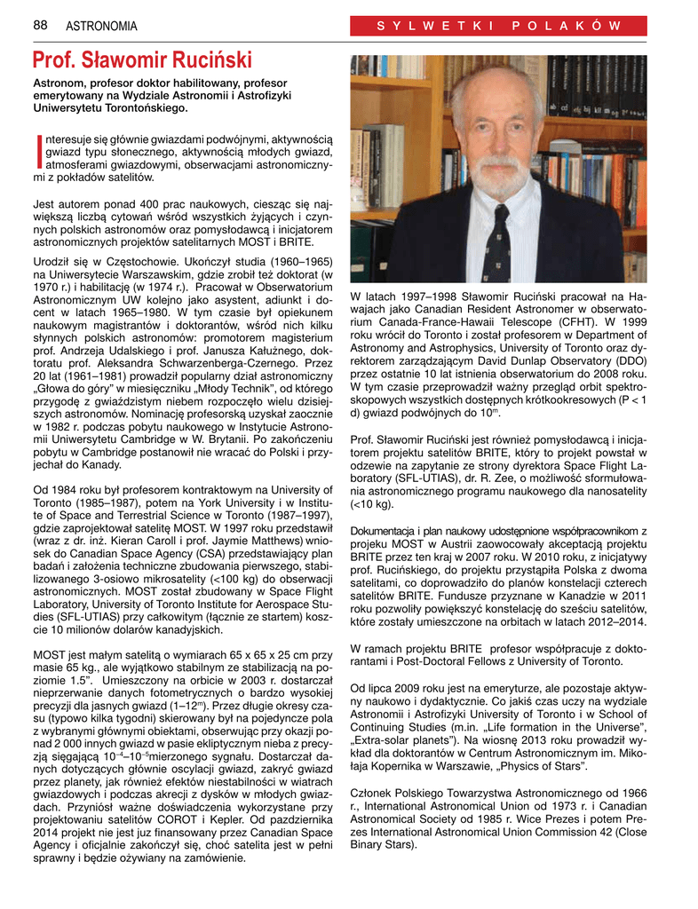 88 ASTRONOMIA S Y L W E T K I P O L A K Ó W Prof. Sławomir Ruciński Astronom, profesor doktor habilitowany, profesor emerytowany na Wydziale Astronomii i Astrofizyki Uniwersytetu Torontońskiego. I nteresuje się głównie gwiazdami podwójnymi, aktywnością gwiazd typu słonecznego, aktywnością młodych gwiazd, atmosferami gwiazdowymi, obserwacjami astronomicznymi z pokładów satelitów. Jest autorem ponad 400 prac naukowych, ciesząc się największą liczbą cytowań wśród wszystkich żyjących i czyn nych polskich astronomów oraz pomysłodawcą i inicjatorem astronomicznych projektów satelitarnych MOST i BRITE. Urodził się w Częstochowie. Ukończył studia (1960–1965) na Uniwersytecie Warszawskim, gdzie zrobił też doktorat (w 1970 r.) i habilitację (w 1974 r.). Pracował w Obserwatorium Astronomicznym UW kolejno jako asystent, adiunkt i docent w latach 1965–1980. W tym czasie był opiekunem naukowym magistrantów i doktorantów, wśród nich kilku słynnych polskich astronomów: promotorem magisterium prof. Andrzeja Udalskiego i prof. Janusza Kałużnego, doktoratu prof. Aleksandra Schwarzenberga-Czernego. Przez 20 lat (1961–1981) prowadził popularny dział astronomiczny „Głowa do góry” w miesięczniku „Młody Technik”, od którego przygodę z gwiaździstym niebem rozpoczęło wielu dzisiej szych astronomów. Nominację profesorską uzyskał zaocznie w 1982 r. podczas pobytu naukowego w Instytucie Astronomii Uniwersytetu Cambridge w W. Brytanii. Po zakończeniu pobytu w Cambridge postanowił nie wracać do Polski i przyjechał do Kanady. Od 1984 roku był profesorem kontraktowym na University of Toronto (1985–1987), potem na York University i w Institute of Space and Terrestrial Science w Toronto (1987–1997), gdzie zaprojektował satelitę MOST. W 1997 roku przedstawił (wraz z dr. inż. Kieran Caroll i prof. Jaymie Matthews) wniosek do Canadian Space Agency (CSA) przedstawiający plan badań i założenia techniczne zbudowania pierwszego, stabilizowanego 3-osiowo mikrosatelity (<100 kg) do obserwacji astronomicznych. MOST został zbudowany w Space Flight Laboratory, University of Toronto Institute for Aerospace Studies (SFL-UTIAS) przy całkowitym (łącznie ze startem) koszcie 10 milionów dolarów kanadyjskich. MOST jest małym satelitą o wymiarach 65 x 65 x 25 cm przy masie 65 kg., ale wyjątkowo stabilnym ze stabilizacją na poziomie 1.5”. Umieszczony na orbicie w 2003 r. dostarczał nieprzerwanie danych fotometrycznych o bardzo wysokiej precyzji dla jasnych gwiazd (1–12m). Przez długie okresy czasu (typowo kilka tygodni) skierowany był na pojedyncze pola z wybranymi głównymi obiektami, obserwując przy okazji ponad 2 000 innych gwiazd w pasie ekliptycznym nieba z precy zją sięgającą 10−4–10−5mierzonego sygnału. Dostarczał danych dotyczących głównie oscylacji gwiazd, zakryć gwiazd przez planety, jak również efektów niestabilności w wiatrach gwiazdowych i podczas akrecji z dysków w młodych gwiazdach. Przyniósł ważne doświadczenia wykorzystane przy projektowaniu satelitów COROT i Kepler. Od pazdziernika 2014 projekt nie jest juz finansowany przez Canadian Space Agency i oficjalnie zakończył się, choć satelita jest w pełni sprawny i będzie ożywiany na zamówienie. W latach 1997–1998 Sławomir Ruciński pracował na Hawajach jako Canadian Resident Astronomer w obserwatorium Canada-France-Hawaii Telescope (CFHT). W 1999 roku wrócił do Toronto i został profesorem w Department of Astronomy and Astrophysics, University of Toronto oraz dyrektorem zarządzającym David Dunlap Observatory (DDO) przez ostatnie 10 lat istnienia obserwatorium do 2008 roku. W tym czasie przeprowadził ważny przegląd orbit spektroskopowych wszystkich dostępnych krótkookresowych (P < 1 d) gwiazd podwójnych do 10m. Prof. Sławomir Ruciński jest również pomysłodawcą i inicjatorem projektu satelitów BRITE, który to projekt powstał w odzewie na zapytanie ze strony dyrektora Space Flight Laboratory (SFL-UTIAS), dr. R. Zee, o możliwość sformułowania astronomicznego programu naukowego dla nanosatelity (<10 kg). Dokumentacja i plan naukowy udostępnione współpracownikom z projeku MOST w Austrii zaowocowały akceptacją projektu BRITE przez ten kraj w 2007 roku. W 2010 roku, z inicjatywy prof. Rucińskiego, do projektu przystąpiła Polska z dwoma satelitami, co doprowadziło do planów konstelacji czterech satelitów BRITE. Fundusze przyznane w Kanadzie w 2011 roku pozwoliły powiększyć konstelację do sześciu satelitów, które zostały umieszczone na orbitach w latach 2012–2014. W ramach projektu BRITE profesor współpracuje z doktorantami i Post-Doctoral Fellows z University of Toronto. Od lipca 2009 roku jest na emeryturze, ale pozostaje aktywny naukowo i dydaktycznie. Co jakiś czas uczy na wydziale Astronomii i Astrofizyki University of Toronto i w School of Continuing Studies (m.in. „Life formation in the Universe”, „Extra-solar planets”). Na wiosnę 2013 roku prowadził wykład dla doktorantów w Centrum Astronomicznym im. Mikołaja Kopernika w Warszawie, „Physics of Stars”. Członek Polskiego Towarzystwa Astronomicznego od 1966 r., International Astronomical Union od 1973 r. i Canadian Astronomical Society od 1985 r. Wice Prezes i potem Prezes International Astronomical Union Commission 42 (Close Binary Stars).