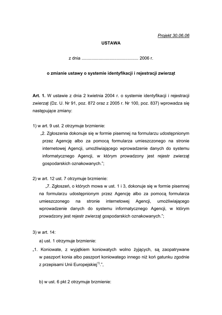 Projekt 30.06.06 USTAWA z dnia ............................................... 2006 r. o zmianie ustawy o systemie identyfikacji i rejestracji zwierząt Art. 1. W ustawie z dnia 2 kwietnia 2004 r. o systemie identyfikacji i rejestracji zwierząt (Dz. U. Nr 91, poz. 872 oraz z 2005 r. Nr 100, poz. 837) wprowadza się następujące zmiany: 1) w art. 9 ust. 2 otrzymuje brzmienie: „2. Zgłoszenia dokonuje się w formie pisemnej na formularzu udostępnionym przez Agencję albo za pomocą formularza umieszczonego na stronie internetowej Agencji, umożliwiającego wprowadzenie danych do systemu informatycznego Agencji, w którym prowadzony jest rejestr zwierząt gospodarskich oznakowanych.”; 2) w art. 12 ust. 7 otrzymuje brzmienie: „7. Zgłoszeń, o których mowa w ust. 1 i 3, dokonuje się w formie pisemnej na formularzu udostępnionym przez Agencję albo za pomocą formularza umieszczonego na stronie internetowej Agencji, umożliwiającego wprowadzenie danych do systemu informatycznego Agencji, w którym prowadzony jest rejestr zwierząt gospodarskich oznakowanych.”; 3) w art. 14: a) ust. 1 otrzymuje brzmienie: „1. Koniowate, z wyjątkiem koniowatych wolno żyjących, są zaopatrywane w paszport konia albo paszport koniowatego innego niż koń gatunku zgodnie z przepisami Unii Europejskiej1).”, b) w ust. 6 pkt 2 otrzymuje brzmienie: 2 „2) dla pozostałych koni – zgłoszenie posiadacza konia zawierające numery identyfikacyjne rodziców konia, z zastrzeżeniem ust. 6a.”, c) po ust. 6 dodaje się ust. 6a w brzmieniu: „6a. W przypadku, gdy nie jest znany numer identyfikacyjny ojca konia, posiadacz konia dołącza do zgłoszenia, zawierającego numer identyfikacyjny matki konia, wyniki badań tego konia na nosicielstwo następujących chorób: nosacizna (Glanders), niedokrwistość zakaźna koni ( Equine infectious anaemia) i zaraza stadnicza (Dourine).”, d) dodaje się ust. 8 w brzmieniu: „8. Posiadacz koniowatego odbiera paszport koniowatego lub jego duplikat osobiście, chyba że złoży oświadczenie podmiotowi prowadzącemu rejestr koniowatych, wyrażające zgodę na doręczenie mu tego paszportu lub jego duplikatu za pośrednictwem poczty listem poleconym za potwierdzeniem odbioru.”; 4) w art. 15: a) ust. 1 otrzymuje brzmienie: „1. Za czynności związane z dokonywaniem opisu koniowatych, rejestrowaniem i wydawaniem paszportów konia i paszportów koniowatego innego niż koń gatunku i ich duplikatów oraz dokonywaniem zmian w tych rejestrach podmioty wymienione w art. 5 pobierają opłaty, z tym że opłaty nie pobiera się za czynności związane ze zmianą w rejestrze koniowatych dotyczącą podania daty uboju koniowatego w rzeźni.”, b) w ust. 2 uchyla się pkt 1, c) w ust. 2 pkt 2 otrzymuje brzmienie: „2) wysokość i sposób pobrania opłat za: a) dokonanie opisu słownego i graficznego konia, a w przypadku koni pełnej krwi angielskiej, koni czystej krwi arabskiej, koni rasy kłusak oraz kuców szetlandzkich – zidentyfikowanie konia, 3 b) zarejestrowanie konia, c) wydanie paszportu konia lub jego duplikatu, d) dokonanie zmian w rejestrze koniowatych, e) doręczenie paszportu konia lub jego duplikatu, w sposób określony w art. 14 ust. 8 - uwzględniając koszty ponoszone przez podmioty, o których mowa w art. 5.”; 5) w art. 17: a) w ust. 2 w pkt 2 lit. a otrzymuje brzmienie: „a) założeniu na prawą małżowinę uszną kolczyka z numerem identyfikacyjnym zwierzęcia gospodarskiego albo duplikatu kolczyka,”, b) w ust. 2 w pkt 2 uchyla się lit. b i c, c) ust. 2a otrzymuje brzmienie: „2a. Termin dotyczący oznakowania owiec i kóz, o którym mowa w art. 4 ust. 1 rozporządzenia nr 21/2004, wynosi 180 dni od dnia urodzenia zwierzęcia.”; 6) w art. 18 ust. 5 otrzymuje brzmienie: „5. Wniosek, o którym mowa w ust. 2, składany jest w formie pisemnej na formularzu udostępnionym przez Agencję albo za pomocą formularza umieszczonego na stronie internetowej Agencji, umożliwiającego wprowadzenie danych do systemu informatycznego Agencji, w którym prowadzony jest rejestr zwierząt gospodarskich oznakowanych.”; 7) w art. 19: a) ust. 1 otrzymuje brzmienie: „1. Posiadacz bydła zgłasza kierownikowi biura fakt oznakowania zwierzęcia, zgodnie z art. 4 ust. 2 rozporządzenia nr 1760/2000, nie później niż w terminie 20 dni od dnia urodzenia tego zwierzęcia.”, 4 b) uchyla się ust. 3, c) po ust. 5 dodaje się ust. 5a w brzmieniu: „5a. Posiadacz bydła odbiera paszport bydła lub jego duplikat osobiście, chyba że złoży oświadczenie podmiotowi prowadzącemu rejestr zwierząt gospodarskich oznakowanych, wyrażające zgodę na doręczenie mu tego paszportu lub jego duplikatu za pośrednictwem poczty listem poleconym za potwierdzeniem odbioru.”; d) ust. 8 otrzymuje brzmienie: „8. Minister właściwy do spraw rolnictwa, w porozumieniu z ministrem właściwym do spraw finasów publicznych, określi, w drodze rozporządzenia, wysokość i sposób pobrania opłat za czynności związane z wydawaniem paszportów bydła lub ich duplikatów oraz ich doręczenie, w sposób określony w ust. 5a, uwzględniając koszty druku oraz wysyłki ponoszone przez Agencję.”; 8) w art. 20 ust. 1 otrzymuje brzmienie: „1. Posiadacz owcy lub kozy zgłasza kierownikowi biura fakt oznakowania zwierzęcia, zgodnie z art. 4 ust. 1 rozporządzenia nr 21/2004, przed opuszczeniem przez to zwierzę siedziby stada, w której się urodziło, nie później niż w terminie 180 dni od dnia urodzenia tego zwierzęcia, z zastrzeżeniem art. 22.”; 9) w art. 21 ust. 2 otrzymuje brzmienie: „2. Posiadacz zwierzęcia gospodarskiego składa zamówienie na duplikaty kolczyków za pośrednictwem kierownika biura w formie pisemnej na formularzu udostępnionym przez Agencję albo za pomocą formularza umieszczonego na stronie internetowej Agencji, umożliwiającego wprowadzenie danych do systemu informatycznego Agencji, w którym prowadzony gospodarskich oznakowanych.”