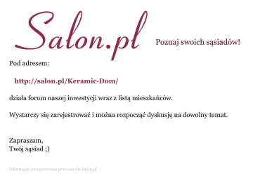 Salon.pl Poznaj swoich sąsiadów! Pod adresem: http://salon.pl/Keramic-Dom/ działa forum naszej inwestycji wraz z listą mieszkańców. Wystarczy się zarejestrować i można rozpocząć dyskusję na dowolny temat. Zapraszam, Twój sąsiad ;) Informacja przygotowana przez serwis Salon.pl