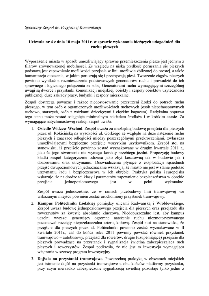 Społeczny Zespół ds. Przyjaznej Komunikacji Uchwała nr 4 z dnia 10 maja 2011r. w sprawie wykonania bieŜących udogodnień dla ruchu pieszych WyposaŜenie miasta w sposób umoŜliwiający sprawne przemieszczenia piesze jest jednym z filarów zrównowaŜonej mobilności. Ze względu na niską prędkość poruszania się pieszych podstawą jest zapewnienie moŜliwości przejścia w linii moŜliwie zbliŜonej do prostej, a takŜe humanizacja otoczenia, w jakim poruszają się i przebywają piesi. Tworzenie ciągów pieszych powinno wynikać z rozmieszczenia podstawowych generatorów ruchu i prowadzić do ich sprawnego i logicznego połączenia ze sobą. Generatorami ruchu wymagającymi szczególnej uwagi są dworce i przystanki komunikacji miejskiej, obiekty i zespoły obiektów uŜyteczności publicznej, duŜe zakłady pracy, budynki i zespoły mieszkalne. Zespół dostrzega powaŜne i raŜące niedostosowanie przestrzeni Łodzi do potrzeb ruchu pieszego, w tym osób o ograniczonych moŜliwościach ruchowych (osób niepełnosprawnych ruchowo, starszych, osób z wózkami dziecięcymi i cięŜkim bagaŜem). Radykalna poprawa tego stanu moŜe zostać osiągnięta minimalnym nakładem środków i w krótkim czasie. Za wymagające natychmiastowej reakcji zespół uwaŜa: 1. Osiedle Widzew Wschód. Zespół uwaŜa za niezbędną budowę przejścia dla pieszych przez ul. Rokicińską na wysokości ul. Gorkiego ze względu na duŜe natęŜenie ruchu pieszych i znaczące odległości miedzy poszczególnymi przekroczeniami, zwłaszcza umoŜliwiającymi bezpieczne przejście wszystkim uŜytkownikom. Zespół stoi na stanowisku, iŜ przejście powinno zostać wyznakowane w drugim kwartale 2011 r., jako Ŝe jego stworzenie nie wymaga korekty przebiegu jezdni. Propozycję budowy kładki zespół kategorycznie odrzuca jako zbyt kosztowną tak w budowie jak i dozorowaniu oraz utrzymaniu. Doświadczenia płynące z eksploatacji sąsiednich przejść dwupoziomowych jednoznacznie wskazują, Ŝe miasto nie jest w stanie podołać utrzymaniu ładu i bezpieczeństwa w ich obrębie. Praktyka polska i europejska wskazuje, Ŝe na drodze tej klasy i parametrów zapewnienie bezpieczeństwa w obrębie przejścia jednopoziomowego jest w pełni wykonalne. Zespół uwaŜa jednocześnie, Ŝe w ramach przebudowy linii tramwajowej we wskazanym miejscu powinien zostać uruchomiony przystanek tramwajowy. 2. Kampus Politechniki Łódzkiej pomiędzy ulicami Radwańską i Wróblewskiego. Zespół uwaŜa budowę jednopoziomowego przejścia dla pieszych oraz przejazdu dla rowerzystów za kwestię absolutnie kluczową. Niedopuszczalne jest, aby kampus uczelni wyŜszej generujący ogromne natęŜenie ruchu niezmotoryzowanego pozostawał rozcięty nieprzekraczalna arterią kołową. Zespół stoi na stanowisku, Ŝe przejście dla pieszych przez al. Politechniki powinno zostać wyznakowane w II kwartale 2011r., zaś do końca roku 2011 powinny powstać równieŜ przystanek tramwajowo – autobusowy, przejazd dla rowerów, drugie (uzupełniające) przejście dla pieszych prowadzące na przystanek i sygnalizacja świetlna zabezpieczająca ruch pieszych i rowerzystów. Zespół podkreśla, Ŝe nie jest to inwestycja wymagająca włączania w szerszy program inwestycyjny. 3. Dojścia na przystanki tramwajowe. Powszechną praktyką w obszarach miejskich jest istnienie dojść na przystanki tramwajowe z obu końców platformy przystanku, przy czym nierzadko zabezpieczone sygnalizacją świetlną pozostaje tylko jedno z przejść, względnie instalowana jest sygnalizacja współpracująca. Takie rozwiązanie nie tylko skraca drogę dojścia na przystanek, ale takŜe rozładowuje tłok na dojściu do przystanku i na samej platformie przystankowej. W związku z powyŜszym zespół stoi na stanowisku, Ŝe tego typu przejścia dla pieszych powinny zostać wyznakowane w ciągu ul. Kościuszki – Zachodniej, Narutowicza (tam, gdzie wysepki przystankowe są wydzielone) i na pl. Niepodległości. Zespół zwraca uwagę na fakt, Ŝe przejścia te i tak intensywnie funkcjonują, tyle Ŝe nielegalnie. Przejścia winny być wykonane w II i III kwartale 2011r. NaleŜy takŜe podjąć działania na rzecz pełnego udostępnienia przystanków dostępnych obecnie jedynie poprzez przejścia podziemne. Dostosowanie przestrzeni pieszych do potrzeb osób niepełnosprawnych ruchowo i o ograniczonych moŜliwościach ruchowych to jeden z wymogów cywilizacyjnych, zwłaszcza gdy nie niesie to za sobą Ŝadnych kosztów ani utrudnień. Zespół stoi na stanowisku, Ŝe naleŜy wyznaczyć przejścia naziemne prowadzące do wszystkich przystanków tramwajowych w ciągu ul. Pabianickiej, do przystanków zlokalizowanych w ul. śeromskiego przy Szpitalu im. WAM oraz al. Mickiewicza przy ul. Piotrkowskiej. Zespół zwraca uwagę na fakt, Ŝe przystanki te znajdują się przy skrzyŜowaniach zabezpieczonych sygnalizacją świetlną, a w przypadku skrzyŜowania z ul. Rudzką istnieje nawet przejście dla pieszych zlokalizowane po drugiej stronie skrzyŜowania. Zespół zwraca szczególną uwagę na przystanek zlokalizowany przy ul. Piotrkowskiej, stanowiący „bramę” do głównej łódzkiej przestrzeni pieszej. Przejścia powinny zostać wykonane w II i III kwartale. Przejście przy ul. Piotrkowskiej, ze względu na konieczność dokonania korekty platform przystankowych moŜe powstać do końca 2011r. NaleŜy umoŜliwić dojście w jednym poziomie z dworca kolejowego Łódź Kaliska do przystanków tramwajowych obsługujących dworzec. Trasy przejścia między dworcami a komunikacją publiczną, ze względu na wzmoŜony ruch osób z duŜymi bagaŜami, reprezentacyjny charakter a takŜe konieczność obsługi osób niepełnosprawnych ruchowo wymagają najwyŜszego poziomu projektowania i wykonawstwa. Niedopuszczalne jest, aby przystanki obsługujące dworce dostępne były tylko poprzez przejścia dwupoziomowe, w dodatku pozbawione wind i schodów ruchomych. Zespó