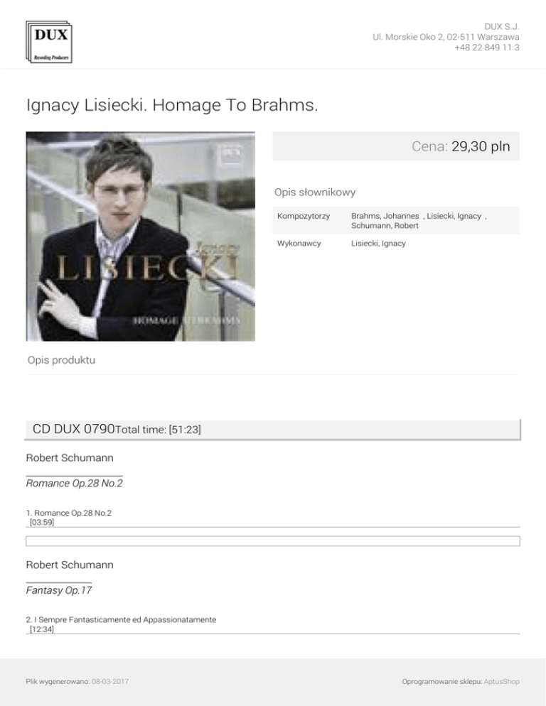 DUX S.J. Ul. Morskie Oko 2, 02-511 Warszawa +48 22 849 11 3 Ignacy Lisiecki. Homage To Brahms. Cena: 29,30 pln Opis słownikowy Kompozytorzy Brahms, Johannes ∎, Lisiecki, Ignacy ∎, Schumann, Robert ∎ Wykonawcy Lisiecki, Ignacy ∎ Opis produktu CD DUX 0790Total time: [51:23] Robert Schumann Romance Op.28 No.2 1. Romance Op.28 No.2 [03:59] Robert Schumann Fantasy Op.17 2. I Sempre Fantasticamente ed Appassionatamente [12:34] Plik wygenerowano: 08-03-2017 Oprogramowanie sklepu: AptusShop DUX S.J. Ul. Morskie Oko 2, 02-511 Warszawa +48 22 849 11 3 3. II Moderato, Sempre energico [07:06] 4. III Lento sostenuto – Sempre piano [09:43] Johannes Brahms Rhapsody in B minor Op.79 No.1 5. Rhapsody in B minor Op.79 No.1 [07:21] Johannes Brahms Rhapsody in G minor Op.79 No.2 6. Rhapsody in G minor Op.79 No.2 [04:10] Ignacy Lisiecki Fantasy on a theme from Chorale Prelude by Brahms Op.122 No.2 7. Fantasy on a theme from Chorale Prelude by Brahms Op.122 No.2 [06:29] Wykonawcy: Ignacy Lisiecki /fortepian/ Plik wygenerowano: 08-03-2017 Powered by TCPDF (www.tcpdf.org) Oprogramowanie sklepu: AptusShop