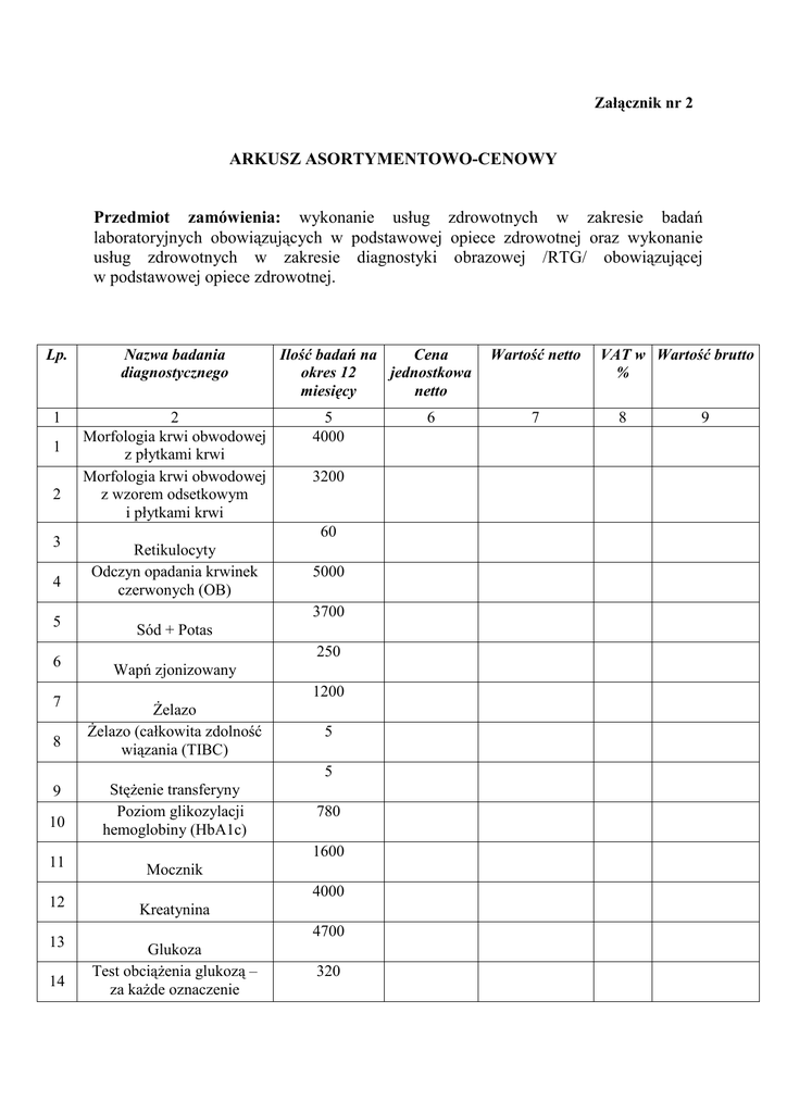 Załącznik nr 2 ARKUSZ ASORTYMENTOWO-CENOWY Przedmiot zamówienia: wykonanie usług zdrowotnych w zakresie badań laboratoryjnych obowiązujących w podstawowej opiece zdrowotnej oraz wykonanie usług zdrowotnych w zakresie diagnostyki obrazowej /RTG/ obowiązującej w podstawowej opiece zdrowotnej. Lp. Nazwa badania diagnostycznego 1 2 Morfologia krwi obwodowej z płytkami krwi Morfologia krwi obwodowej z wzorem odsetkowym i płytkami krwi 1 2 3 4 Retikulocyty Odczyn opadania krwinek czerwonych (OB) 3200 5000 3700 Sód + Potas 6 Wapń zjonizowany 8 5 4000 60 5 7 Cena Ilość badań na okres 12 jednostkowa netto miesięcy 250 1200 Żelazo Żelazo (całkowita zdolność wiązania (TIBC) 5 5 10 Stężenie transferyny Poziom glikozylacji hemoglobiny (HbA1c) 11 Mocznik 9 1600 4000 12 Kreatynina 13 Glukoza Test obciążenia glukozą – za każde oznaczenie 14 780 4700 320 6 Wartość netto 7 VAT w Wartość brutto % 8 9 Lp. Nazwa badania diagnostycznego 15 Białko całkowite 16 Proteinogram, Albuminy Ilość badań na Cena okres 12 jednostkowa miesięcy netto 70 40 1700 17 Białko C-reaktywne-CRP 18 Kwas moczowy 1500 4000 19 Cholesterol całkowity 20 Cholesterol – HDL 3200 2500 21 Cholesterol – LDL (wyliczany) 22 Triglicerydy (TG) 3600 800 23 Bilirubina całkowita 24 Bilirubina bezpośrednia 25 140 25 Fosfataza alkaliczna (ALP) Aminotransferaza 26 asparaginianowa (AST) Aminotransferaza alaninowa 27 (ALT) Gammaglutamylotranspeptyd 28 aza (GGTP) 29 30 31 32 33 34 35 2050 3580 1300 300 Amylaza 250 Kinaza kreatynowa (CK) Fosfotaza kwaśna całkowita (ACP) Czynnik reumatoidalny (RF) 600 Miano antystreptolizyn (ASO) 450 Hormon tyreotropowy (TSH) 3500 5 60 Antygen HBS-AGHBS Wartość netto VAT w Wartość brutto % Lp. Nazwa badania diagnostycznego 36 VDRL 37 FT 3 10 550 1000 38 FT 4 PSA-Antygen swoisty dla 39 stercza (całkowity) Ogólne badanie moczu z oceną właściwości 40 fizycznych,chemicznych oraz oceną mikroskopową osadu Ilościowe oznaczenie białka 41 42 43 44 45 46 47 48 49 50 51 52 53 54 55 Ilość badań na Cena okres 12 jednostkowa miesięcy netto 500 5800 5 Ilościowe oznaczenie glukozy 5 Ilościowe oznaczenie wapnia 5 Ilościowe oznaczenie amylazy 100 Badanie ogólne kału 5 2800 Pasożyty Krew utajona-metodą immunochemiczną Wskaźnik protrombinowy (INR) Czas kaolinowo-kefalinowy (APTT) Fibrynogen Posiew moczu z antybiogramem Posiew wymazu z gardła z antybiogramem RTG klatki piersiowej w projekcji AP / bocznej RTG kręgosłupa w projekcji AP / bocznej (cały kręgosłup) RTG kręgosłupa w projekcji AP / bocznej(odcinkowe): V szyjny, V piersiowy, V lędźwiowo- krzyżowy 200 1900 170 20 550 280 1200 5 550 Wartość netto VAT w Wartość brutto % Lp. Nazwa badania diagnostycznego Ilość badań na Cena okres 12 jednostkowa miesięcy netto 57 RTG kończyn w projekcji AP/bocznej: (barku, kości ramieniowej, st. łokciowego, przedramienia, nadgarstka, kości udowej, st. kolanowy, kości podudzia, stóp i dłoni, st. skokowy) RTG miednicy w projekcji AP /bocznej 58 RTG czaszki 56 Wartość netto VAT w Wartość brutto % 300 80 10 59 RTG zatok RTG przeglądowe jamy 60 brzusznej RAZEM 60 5 WARUNKI GRANICZNE LP graniczne Warunki gra niczne wymagane Potwierdzenie spełnienia TAK / NIE 1. Minimum dwa punkty pobrań na terenie miasta Busko-Zdrój. 2. Dostępność do punktu pobrań w Przychodni Nr 1 w Busku-Zdroju od poniedziałku do piątku w godzinach od 7.00 do 10.15 z wyłączeniem dni ustawowo wolnych od pracy. 3. Punkt wykonywania pacjentom prześwietlenia /RTG/ zlokalizowany na terenie miasta Busko-Zdrój i dostępny od poniedziałku do piątku w godzinach od 7.30 do 18.00 z wyłączeniem dni wolnych od pracy. 4. Dostępność wyników badań laboratoryjnych w tym samym dniu do godz. 15.00 w formie elektronicznej i pisemnej z wyjątkiem wyników badań mikrobiologicznych i proteinogramu, które dostępne będą do 4 dni od momentu pobrania materiału. 5. Dostępność wyników badań RTG w raz z opisem lekarza radiologa do 3 dni pracujących od momentu wykonania. 6. Transport materiałów do badań laboratoryjnych i dostarczenie wyników badań na koszt oferenta 7. Przygotowanie przez oferenta procedur i zasad przygotowania pacjenta do badan laboratoryjnych i RTG, wykonania tych badań oraz transportu materiału do badań laboratoryjnych. 8. Zabezpieczenie w druki „zlecenia na badania laboratoryjne” przez okres obowiązywania umowy 9. Wymagane certyfikaty 10. Dysponowanie potencjałem kadrowym i sprzętowym zgodnie z obowiązującymi przepisami i standardami 11. Dysponowanie wykwalifikowaną kadrą diagnostów do weryfikacji wyników 12. Dysponowanie wykwalifikowaną kadrą radiologów w celu realizacji badań RTG ............................................................................... (data i podpis osoby uprawnionej do reprezentowania Wykonawcy)