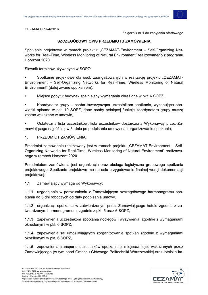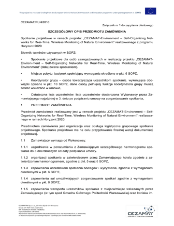 ! ! ! This!project!has!received!funding!from!the!European!Union’s!Horizon!2020!research!and!innovation!programme!under!grant!agreement!n.!664470!! !! ! CEZAMAT/PU/4/2016 Załącznik nr 1 do zapytania ofertowego SZCZEGÓŁOWY OPIS PRZEDMIOTU ZAMÓWIENIA Spotkanie projektowe w ramach projektu: „CEZAMAT-Environment – Self-Organizing Networks for Real-Time, Wireless Monitoring of Natural Environment” realizowanego z programu Horyzont 2020 Słownik terminów używanych w SOPZ: • Spotkanie projektowe dla osób zaangażowanych w realizację projektu „CEZAMATEnviron-ment – Self-Organizing Networks for Real-Time, Wireless Monitoring of Natural Environment” (dalej zwane spotkaniem). • Miejsce pobytu: budynek spełniający wymagania określone w pkt. 6 SOPZ, • Koordynator grupy – osoba towarzysząca uczestnikom spotkania, wykonująca obowiązki opisane w pkt. 10 SOPZ, dane osoby pełniącej funkcje koordynatora grupy muszą zostać wskazane w umowie, • Ostateczna lista uczestników: lista uczestników dostarczona Wykonawcy przez Zamawiającego najpóźniej w 3. dniu po podpisaniu umowy na zorganizowanie spotkania, 1. PRZEDMIOT ZAMÓWIENIA. Przedmiot zamówienia realizowany jest w ramach projektu „CEZAMAT-Environment – SelfOrganizing Networks for Real-Time, Wireless Monitoring of Natural Environment” realizowanego w ramach Horyzont 2020. Przedmiotem zamówienia jest organizacja oraz obsługa logistyczna grupowego spotkania projektowego. Spotkanie projektowe ma na celu przygotowanie finalnej wersji dokumentacji projektowej. 1.1 Zamawiający wymaga od Wykonawcy: 1.1.1 uzgodnienia w porozumieniu z Zamawiającym szczegółowego harmonogramu spotkania do 3 dni roboczych od daty podpisania umowy. 1.1.2 organizacji spotkania w zatwierdzonym przez Zamawiającego hotelu zgodnie z zatwierdzonym harmonogramem, zgodnie z pkt. 5 oraz 6 SOPZ, 1.1.3 zapewnienia uczestnikom spotkania noclegów i wyżywienia, zgodnie z wymaganiami określonymi w pkt. 6 SOPZ, 1.1.4 zapewnienia sal umożliwiających zorganizowanie spotkań zgodnie z wymaganiami określonymi w pkt. 6 SOPZ, 1.1.5 zapewnienia transportu uczestników spotkania z miejsca/miejsc wskazanych przez Zamawiającego (w tym spod Gmachu Głównego Politechniki Warszawskiej oraz lotniska im. ! ! ! CEZAMAT!PW!Sp.!z!o.o.,!Ul.!Polna!50,!00J644!Warszawa! tel.!22!234!7157!www.cezamat.eu! NIP!7010346175!REGON!146180411! Kapitał!zakładowy!100!000!zł! Wpisana!do!rejestru!przedsiębiorców!prowadzonego!przez!Sąd!Rejonowy!dla!m,.st.!Warszawy,! XII!Wydział!Gospodarczy!Krajowego!Rejestru!Sądowego!pod!numerem!KRS!0000424841 ! !!!!!!!!!!!!!!!!!!!!!!!!!!!!!!!!!!!!!!!!!!!!!! ! ! ! ! ! ! This!project!has!received!funding!from!the!European!Union’s!Horizon!2020!research!and!innovation!programme!under!grant!agreement!n.!664470!! !! ! F. Chopina i lotniska w Modlinie) na miejsce spotkania oraz z powrotem w miejsce/miejsca wskazane przez Zmawiającego; 1.1.6 zapewnienia transportu „na żądanie” dla wszystkich uczestników spotkania; w rozliczeniu Zamawiający zapłaci za faktycznie zrealizowane przejazdy według ustalonej stawki kilometrowej; 1.1.7 zapewnienia każdego dnia kontaktu telefonicznego i mailowego z koordynatorem grupy, zgodnie z pkt. 10 SOPZ. 2. UCZESTNICY SPOTKANIA PROJEKTOWEGO. 2.1 Uczestnikami spotkania będą osoby zatrudnione w ramach projektu „CEZAMATEnvironment – Self-Organizing Networks for Real-Time, Wireless Monitoring of Natural Environment 2.2 Liczba uczestników spotkania wynosić będzie co najmniej 10, ale nie więcej niż 25 osób. 3. TERMIN WYKONANIA ZAMÓWIENIA. Wykonawca zorganizuje spotkanie wraz z transportem zgodnie z pkt 8 SOPZ w terminie 1013 maja 2016 roku. 5. HARMONOGRAM SPOTKANIA PROJEKTOWEGO. 5.1 Szczegółowy harmonogram spotkania Wykonawca uzgodni z Zamawiającym w terminie do 3 dni roboczych od daty podpisania umowy. 5.2 Wykonawca otrzyma od Zamawiającego drogą elektroniczną akceptację ostatecznej wersji harmonogramu. 5.3 Za zgodą Zamawiającego dopuszcza się zmiany w realizacji zatwierdzonego harmonogramu spotkania, wynikające z przyczyn niezależnych od stron lub powodujących bardziej korzystną i efektywną realizację spotkania, z zastrzeżeniem realizacji pełnego harmonogramu nierzutującego na jakość spotkania. 6. MIEJSCE SPOTKANIA PROJEKTOWEGO. 6.1 Spotkanie odbędzie się w odległości nie większej niż 150 km od Warszawy. 6.2 Miejsce zakwaterowania dla zgłoszonej przez Zamawiającego liczby uczestników musi spełniać poniższe wymagania: 6.2.1 hotel nie powinien znajdować się bezpośrednio przy trasie szybkiego ruchu lub w miejscu o natężonym hałasie, 6.2.2 zakwaterowanie wszystkich uczestników spotkania w jednym hotelu spełniającym standardy hotelu minimum czterogwiazdkowego, 6.2.3 każdy z uczestników spotkania będzie zakwaterowany w osobnym pokoju, ! ! ! CEZAMAT!PW!Sp.!z!o.o.,!Ul.!Polna!50,!00J644!Warszawa! tel.!22!234!7157!www.cezamat.eu! NIP!7010346175!REGON!146180411! Kapitał!zakładowy!100!000!zł! Wpisana!do!rejestru!przedsiębiorców!prowadzonego!przez!Sąd!Rejonowy!dla!m,.st.!Warszawy,! XII!Wydział!Gospodarczy!Krajowego!Rejestru!Sądowego!pod!numerem!KRS!0000424841 ! !!!!!!!!!!!!!!!!!!!!!!!!!!!!!!!!!!!!!!!!!!!!!! ! ! ! ! ! ! This!project!has!received!funding!from!the!European!Union’s!Horizon!2020!research!and!innovation!programme!under!grant!agreement!n.!664470!! !! 6.2.4 ! w hotelu zapewnione będą uczestnikom spotkania posiłki: 6.2.4.1 śniadania w dn. 11-13 maja 2016 roku; 6.2.4.2 obiady w dn. 11-12 maja 2016 roku; 6.2.4.3 kolacje w dn. 10-13 maja 2016 roku, w tym uroczysta kolacja oraz kolacja plenerowa, 6.2.5 preferowany hotel w miejscowości turystycznej w miejscu odznaczającym się walorami przyrodniczymi (w pobliżu jeziora, parku, itp.), 6.2.6 w dn. 11-12.05.2016 r. sale szkoleniowe (w liczbie 3) usytuowane będą w hotelu, w którym zakwaterowani będą uczestnicy spotkania, o wielkości adekwatnej do liczby uczestników spotkania, zapew