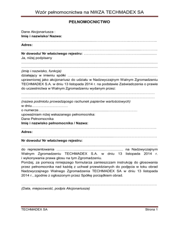 Wzór pełnomocnictwa na NWZA TECHMADEX SA