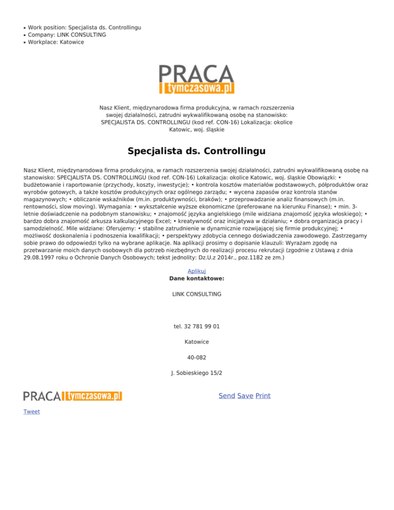 Praca-tymczasowa.pl - Specjalista ds. Controllingu