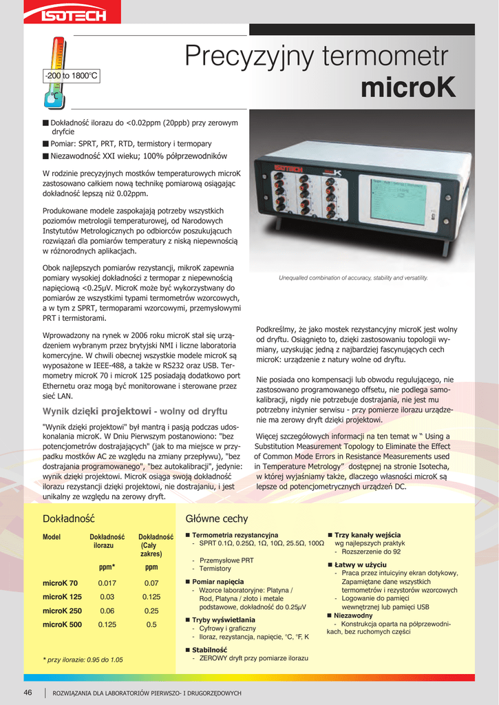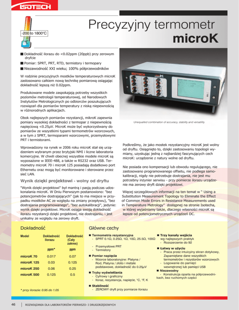 Precyzyjny termometr microK -200 to 1800°C g Dokładność ilorazu do <0.02ppm (20ppb) przy zerowym dryfcie g Pomiar: SPRT, PRT, RTD, termistory i termopary g Niezawodność XXI wieku; 100% półprzewodników W rodzinie precyzyjnych mostków temperaturowych microK zastosowano całkiem nową technikę pomiarową osiągając dokładność lepszą niż 0.02ppm. Produkowane modele zaspokajają potrzeby wszystkich poziomów metrologii temperaturowej, od Narodowych Instytutów Metrologicznych po odbiorców poszukującuch rozwiązań dla pomiarów temperatury z niską niepewnością w różnorodnych aplikacjach. Obok najlepszych pomiarów rezystancji, mikroK zapewnia pomiary wysokiej dokładności z termopar z niepewnością napięciową <0.25µV. MicroK może być wykorzystwany do pomiarów ze wszystkimi typami termometrów wzorcowych, a w tym z SPRT, termoparami wzorcowymi, przemysłowymi PRT i termistorami. Wprowadzony na rynek w 2006 roku microK stał się urządzeniem wybranym przez brytyjski NMI i liczne laboratoria komercyjne. W chwili obecnej wszystkie modele microK są wyposażone w IEEE-488, a także w RS232 oraz USB. Termometry microK 70 i microK 125 posiadają dodatkowo port Ethernetu oraz mogą być monitorowane i sterowane przez sieć LAN. Wynik dzięki projektowi - wolny od dryftu "Wynik dzięki projektowi" był mantrą i pasją podczas udoskonalania microK. W Dniu Pierwszym postanowiono: "bez potencjometrów dostrajających" (jak to ma miejsce w przypadku mostków AC ze względu na zmiany przepływu), "bez dostrajania programowanego", "bez autokalibracji", jedynie: wynik dzięki projektowi. MicroK osiąga swoją dokładność ilorazu rezystancji dzięki projektowi, nie dostrajaniu, i jest unikalny ze względu na zerowy dryft. Unequalled combination of accuracy, stability and versatility. Podkreślmy, że jako mostek rezystancyjny microK jest wolny od dryftu. Osiągnięto to, dzięki zastosowaniu topologii wymiany, uzyskując jedną z najbardziej fascynujących cech microK: urządzenie z natury wolne od dryftu. Nie posiada ono kompensacji lub obwodu regulującego, nie zastosowano programowanego offsetu, nie podlega samokalibracji, nigdy nie potrzebuje dostrajania, nie jest mu potrzebny inżynier serwisu - przy pomierze ilorazu urządzenie ma zerowy dryft dzięki projektowi. Więcej szczegółowych informacji na ten temat w “Using a Substitution Measurement Topology to Eliminate the Effect of Common Mode Errors in Resistance Measurements used in Temperature Metrology” dostępnej na stronie Isotecha, w której wyjaśniamy także, dlaczego własności microK są lepsze od potencjometrycznych urządzeń DC. Główne cechy Model Dokładność ilorazu Dokładność (Cały zakres) ppm* ppm microK 70 0.017 0.07 microK 125 0.03 0.125 microK 250 0.06 0.25 microK 500 0.125 0.5 n Trzy kanały wejścia n Termometria rezystancyjna wg najlepszych praktyk - SPRT 0.1Ω, 0.25Ω, 1Ω, 10Ω, 25.5Ω, 100Ω - Rozszerzenie do 92 - Przemysłowe PRT n Łatwy w użyciu - Termistory - Praca przez intuicyiny ekran dotykowy, Zapamiętane dane wszystkich n Pomiar napięcia - Wzorce laboratoryjne: Platyna / termometrów i rezystorów wzorcowych - Logowanie do pamięci Rod, Platyna / złoto i metale wewnętrznej lub pamięci USB podstawowe, dokładność do 0.25µV n Niezawodny n Tryby wyświetlania - Konstrukcja oparta na półprzewodni- Cyfrowy i graficzny kach, bez ruchomych części - Iloraz, rezystancja, napięcie, °C, °F, K Dokładność * przy ilorazie: 0.95 do 1.05 46 | n Stabilność - ZEROWY dryft przy pomiarze ilorazu ROZWIĄZANIA DLA LABORATORIÓW PIERWSZO- I DRUGORZĘDOWYCH Wynik dzięki projektowi - inne korzyści Prąd podgrzewania Wykonując pomiary ilorazowe - dzięki projektowi osiągamy dodatkowe korzyści: microK posiada źródło prądu podgrzewania do zasilania PRT kiedy ten nie podlega pomiarowi. Eliminuje to niepewność wynikającą ze współczynnika mocy. Każdy z kanałów, zarówno w microK jak i w microsKannerze może zostać indywidualnie zaprogramowany. Zerowa histereza Ze względu na projekt - brak histerezy Zerowe odczylenie między kanałami Nawet zastosowanie microsKannera, jako rozszerzenia ilości kanałów, następuje dla każdego wejścia bardziej jako powielenie kanałów podstawowych niż zastosowanie przełącznika Zerowy współczynnik temperaturowy Dzięki technologii substytucji, współczynnik temperaturowy wynosi 0ppm/°C. Nie ma potrzeby nagrzewania lub czasu stabilizacji. Całkowita odporność na częstotliwość linii Całkowita odporność na częstotliwość linii 50 i 60Hz Pomiary termopar Przy zastosowaniu zerostatu odniesienia (0°C) lub przy pomiarze temperatury złącza przez PRT na jednym z kanałów, microK może być używany do precyzyjnych pomiarów z termopar o niskiej niepewności. MicroK jest zaprojektowany do WSZYSTKICH typów termometrów wykorzystywanych w laboratoriach, a w tym termopar wzorcowych. Niepewność napięciowa wynosi 0.25µV, odpowiadając 0.01°C dla termopary platyna / złoto w 1000°C. ADC microK realizuje doskonałą liniowość i niskie szumy dzięki licznym nowatorskim zabiegom, a wśród nich nową technikę redukcji szumów, nowe przełączniki półprzewodnikowe, nowe rozwiązania ochronne i wyszukaną technikę substytucji w celu osiągnięcia zerowego dryftu. Rezystancja prądu zerowego microK był pierwszym mostkiem posiadającym możliwość automatycznego obliczenia i wyświetlenia rezystancji prądu zerowego bez ręcznych poprawek. Własność ta dostępna jest w modelach microK 70 and 125. Niskie szumy Nowy konwerter AC, wraz z niskoszumowym przedwzmacniaczem zastosowanym w microK, powodują, że osiągniesz niższą niepewność pomiarową w krótszym czasie. Technologia równoległego przetwarzania microK 70 i 125 oferują dodatkową technologię (w porównaniu z microK 250 i 500) dającą lepsze parametry istotne dla Laboratoriów Pierwszorzędowych. Zastosowano w nich nową technikę Analogowego Przetw