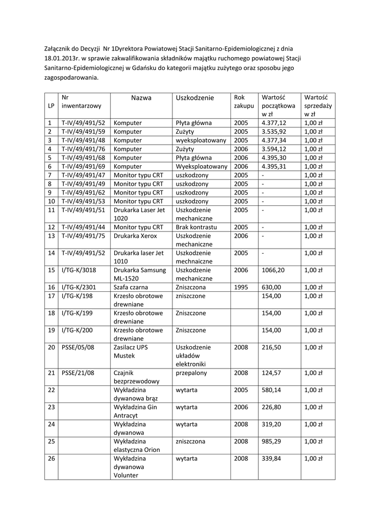 Załącznik do Decyzji Nr 1Dyrektora Powiatowej Stacji Sanitarno-Epidemiologicznej z dnia 18.01.2013r. w sprawie zakwalifikowania składników majątku ruchomego powiatowej Stacji Sanitarno-Epidemiologicznej w Gdańsku do kategorii majątku zużytego oraz sposobu jego zagospodarowania. Nazwa LP Nr inwentarzowy 1 2 3 4 5 6 7 8 9 10 11 T-IV/49/491/52 T-IV/49/491/59 T-IV/49/491/48 T-IV/49/491/76 T-IV/49/491/68 T-IV/49/491/69 T-IV/49/491/47 T-IV/49/491/49 T-IV/49/491/62 T-IV/49/491/53 T-IV/49/491/51 Komputer Komputer Komputer Komputer Komputer Komputer Monitor typu CRT Monitor typu CRT Monitor typu CRT Monitor typu CRT Drukarka Laser Jet 1020 Monitor typu CRT Drukarka Xerox 12 T-IV/49/491/44 13 T-IV/49/491/75 14 T-IV/49/491/52 15 I/TG-K/3018 16 I/TG-K/2301 17 I/TG-K/198 18 I/TG-K/199 19 I/TG-K/200 20 PSSE/05/08 21 PSSE/21/08 22 23 24 25 26 Drukarka laser Jet 1010 Drukarka Samsung ML-1520 Szafa czarna Krzesło obrotowe drewniane Krzesło obrotowe drewniane Krzesło obrotowe drewniane Zasilacz UPS Mustek Czajnik bezprzewodowy Wykładzina dywanowa brąz Wykładzina Gin Antracyt Wykładzina dywanowa Wykładzina elastyczna Orion Wykładzina dywanowa Volunter Uszkodzenie Rok zakupu 2005 2005 2005 2006 2006 2006 2005 2005 2005 2005 2005 Wartość początkowa w zł 4.377,12 3.535,92 4.377,34 3.594,12 4.395,30 4.395,31 - Wartość sprzedaży w zł 1,00 zł 1,00 zł 1,00 zł 1,00 zł 1,00 zł 1,00 zł 1,00 zł 1,00 zł 1,00 zł 1,00 zł 1,00 zł Płyta główna Zużyty wyeksploatowany Zużyty Płyta główna Wyeksploatowany uszkodzony uszkodzony uszkodzony uszkodzony Uszkodzenie mechaniczne Brak kontrastu Uszkodzenie mechaniczne Uszkodzenie mechnaiczne Uszkodzenie mechaniczne Zniszczona zniszczone 2005 2006 - 1,00 zł 1,00 zł 2005 - 1,00 zł 2006 1066,20 1,00 zł 1995 630,00 154,00 1,00 zł 1,00 zł Zniszczone 154,00 1,00 zł Zniszczone 154,00 1,00 zł Uszkodzenie układów elektroniki przepalony 2008 216,50 1,00 zł 2008 124,57 1,00 zł wytarta 2005 580,14 1,00 zł wytarta 2006 226,80 1,00 zł wytarta 2008 319,20 1,00 zł zniszczona 2008 985,29 1,00 zł wytarta 2008 339,84 1,00 zł