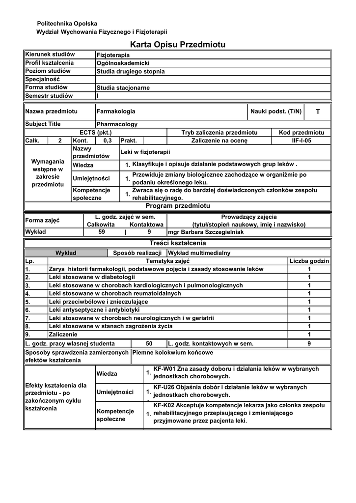 Politechnika Opolska Wydział Wychowania Fizycznego i Fizjoterapii Karta Opisu Przedmiotu Kierunek studiów Profil kształcenia Poziom studiów Specjalność Forma studiów Semestr studiów Fizjoterapia Ogólnoakademicki Studia drugiego stopnia Nazwa przedmiotu Farmakologia Subject Title Całk. 2 Wymagania wstępne w zakresie przedmiotu Studia stacjonarne I Nauki podst. (T/N) T Pharmacology ECTS (pkt.) Tryb zaliczenia przedmiotu Kod przedmiotu Kont. 0,3 Prakt. Zaliczenie na ocenę IIF-I-05 Nazwy Leki w fizjoterapii przedmiotów 1. Klasyfikuje i opisuje działanie podstawowych grup leków . Wiedza Umiejętności Kompetencje społeczne … Przewiduje zmiany biologicznee zachodzące w organiźmie po 1. podaniu określonego leku. Zwraca się o radę do bardziej doświadczonych członków zespołu 1. rehabilitacyjnego. Program przedmiotu Forma zajęć Wykład L. godz. zajęć w sem. Prowadzący zajęcia Całkowita Kontaktowa (tytuł/stopień naukowy, imię i nazwisko) 59 9 mgr Barbara Szczegielniak | Treści kształcenia Wykład Lp. 1. 2. 3. 4. 5. 6. 7. 8. 9. Sposób realizacji Wykład multimedialny Tematyka zajęć Zarys historii farmakologii, podstawowe pojęcia i zasady stosowanie leków Leki stosowane w diabetologii Leki stosowane w chorobach kardiologicznych i pulmonologicznych Leki stosowane w chorobach reumatoidalnych Leki przeciwbólowe i znieczulające Leki antyseptyczne i antybiotyki Leki stosowane w chorobach neurologicznych i w geriatrii Leki stosowane w stanach zagrożenia życia Zaliczenie Liczba godzin 1 1 1 1 1 1 1 1 1 L. godz. pracy własnej studenta 50 L. godz. kontaktowych w sem. 9 Sposoby sprawdzenia zamierzonych Piemne kolokwium końcowe efektów kształcenia KF-W01 Zna zasady doboru i działania leków w wybranych 1. Wiedza jednostkach chorobowych. Efekty kształcenia dla przedmiotu - po zakończonym cyklu kształcenia Umiejętności 1. 3. Kompetencje społeczne KF-U26 Objaśnia dobór i działanie leków w wybranych jednostkach chorobowych. KF-K02 Akceptuje kompetencje lekarza jako członka zespołu 1. rehabilitacyjnego przepisującego i zmieniającego przyjmowane przez pacjenta leki. Metody dydaktyczne: Wykład multimedialny Forma i warunki zaliczenia przedmiotu: Kolokwium zaliczeniowe w formie testu. Literatura podstawowa: [1] Kostkowski Herman - Farmakologia [2] Janiec - Farmakodynamika [3] Pawełczyk - Chemia leków [4] Kohlmunzer -Farmakognozja ______________ * niewłaściwe przekreślić ………………………………………………….. ………………………………………………………. (kierownik jednostki organizacyjnej/bezpośredni przełożony: pieczęć/podpis (Dziekan Wydziału pieczęć/podpis)