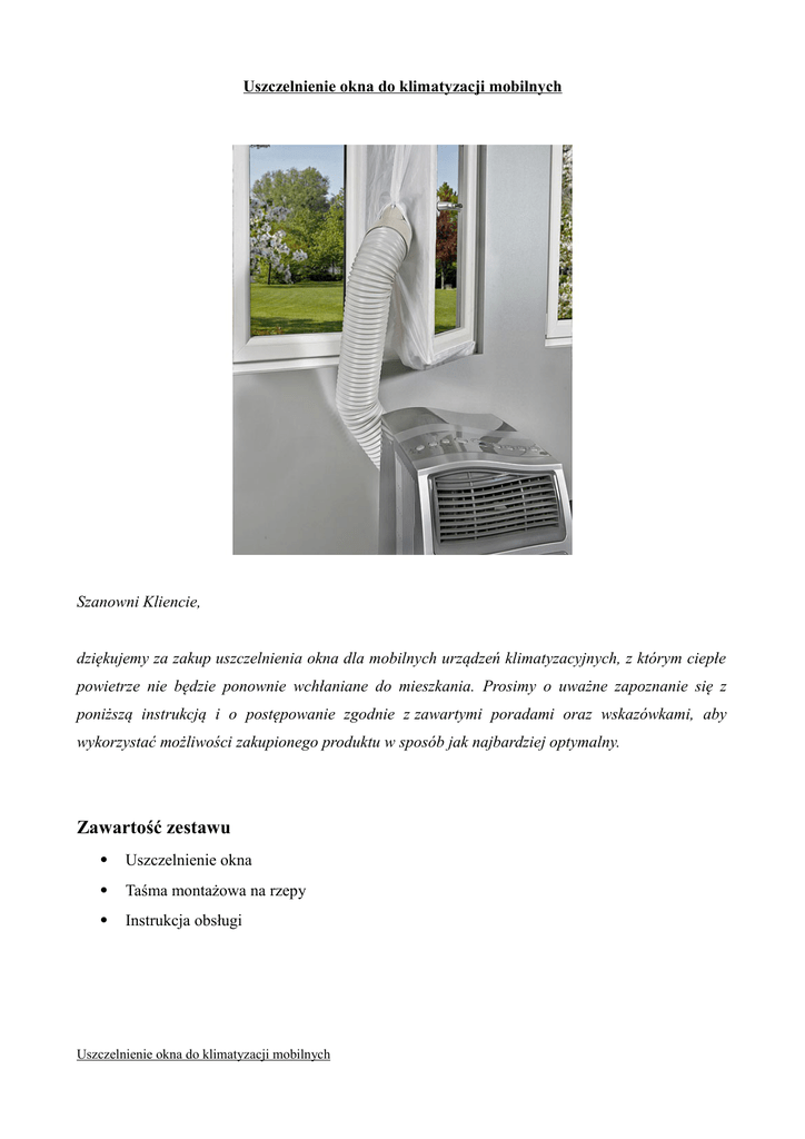 Uszczelnienie okna do klimatyzacji mobilnych Szanowni Kliencie, dziękujemy za zakup uszczelnienia okna dla mobilnych urządzeń klimatyzacyjnych, z którym ciepłe powietrze nie będzie ponownie wchłaniane do mieszkania. Prosimy o uważne zapoznanie się z poniższą instrukcją i o postępowanie zgodnie z zawartymi poradami oraz wskazówkami, aby wykorzystać możliwości zakupionego produktu w sposób jak najbardziej optymalny. Zawartość zestawu Uszczelnienie okna Taśma montażowa na rzepy Instrukcja obsługi Uszczelnienie okna do klimatyzacji mobilnych Montaż/korzystanie 1. Zaznacz środek uszczelnienia (na obrazku punkt M). 2. Oznacz środek ościeżnicy oraz skrzydła okiennego. Wskazówka Rysunek nr 2 przedstawia właściwe rozmieszczenie uszczelnienia przy otwartym oknie, rysunek nr 3 w oknie uchylonym, a rysunek nr 4 w otwartym oknie dachowym. 3. Taśmę montażową należy nakleić na przednią stronę skrzydła okiennego (na ogól o szerokości 1 cm) bądź na wewnętrznej powierzchni skrzydła okiennego, w którym usytuowany jest uchwyt okna. Uszczelnienie okna do klimatyzacji mobilnych 4. Należy rozpocząć w punkcie A, poprzez punkt B, na prawo i na lewo od wyznaczonego wcześniej środka M. 5. Po przyklejeniu uszczelnienia punkty A i B (styku danych stron z ramą i skrzydłem okna) powinny znajdować się dokładnie naprzeciwko siebie. 6. Podczas zamykania okna należy uważać, aby uszczelnienie nie znalazło się pomiędzy skrzydłem okna a ramą okienną, gdyż może to uszkodzić uszczelnienie. 7. Zamek najlepiej otworzyć w miejscu oznaczonym na rysunkach jako punkt S. Następnie należy przełożyć przez otwór koniec przewodu odprowadzającego ciepłe powietrze. Bezpieczeństwo i warunki gwarancji Niniejsza instrukcja ma na celu zapoznanie Państwa z prawidłowym korzystaniem z produktu. Należy przechowywać instrukcję w miejscu łatwo dostępnym, aby w razie wątpliwości zawsze móc sprawdzić potrzebne informacje. Samowolne modyfikacje obniżają poziom bezpieczeństwa produktu. UWAGA. Istnieje ryzyko obrażeń! Produkt należy przechowywać z dala od źródła ciepła Przy użyciu produktu należy zachować szczególną ostrożność Wszelkie prawa do wprowadzania zmian technicznych i eliminacji błędów są zastrzeżone. Dostarczone przez: Pearl.GmbH Pearl-Str. 1–3 D-79426 Buggingen Uszczelnienie okna do klimatyzacji mobilnych