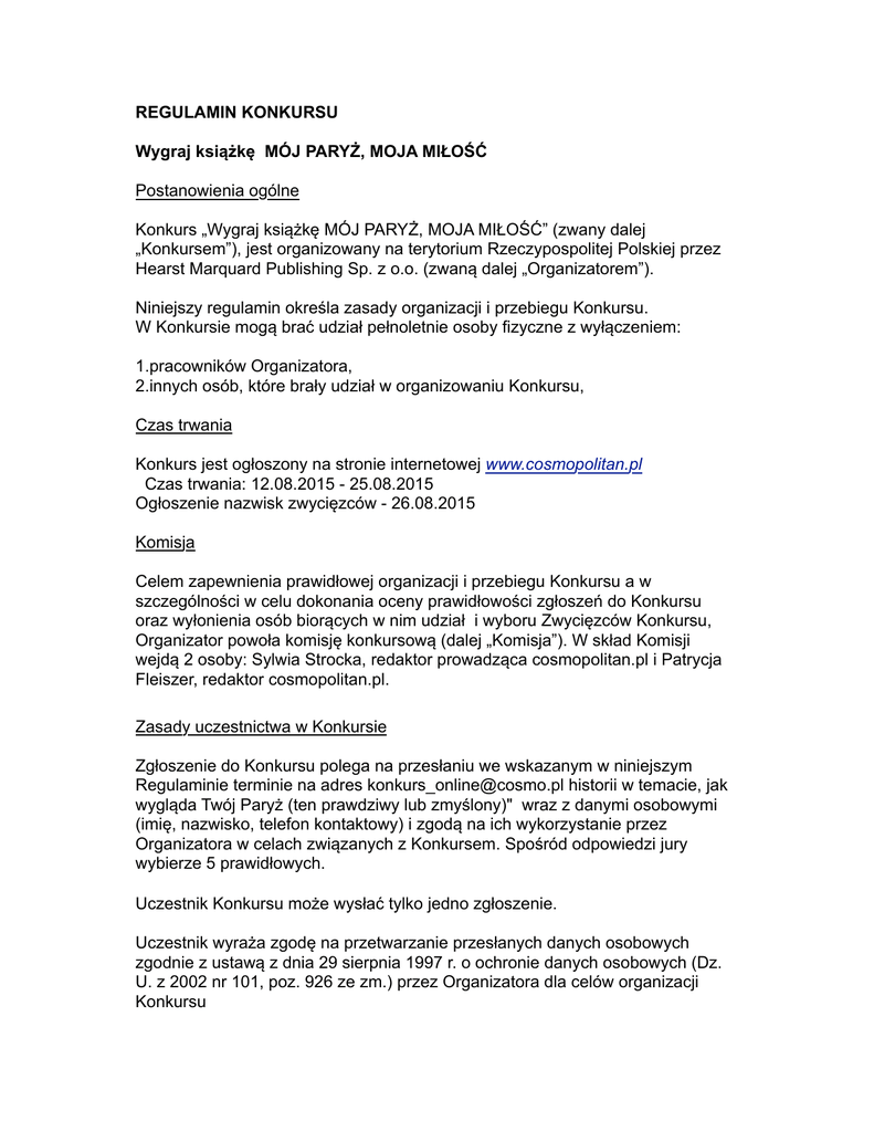 REGULAMIN KONKURSU Wygraj książkę MÓJ PARYŻ, MOJA MIŁOŚĆ Postanowienia ogólne Konkurs „Wygraj książkę MÓJ PARYŻ, MOJA MIŁOŚĆ” (zwany dalej „Konkursem”), jest organizowany na terytorium Rzeczypospolitej Polskiej przez Hearst Marquard Publishing Sp. z o.o. (zwaną dalej „Organizatorem”). Niniejszy regulamin określa zasady organizacji i przebiegu Konkursu. W Konkursie mogą brać udział pełnoletnie osoby fizyczne z wyłączeniem: 1.pracowników Organizatora, 2.innych osób, które brały udział w organizowaniu Konkursu, Czas trwania Konkurs jest ogłoszony na stronie internetowej www.cosmopolitan.pl Czas trwania: 12.08.2015 - 25.08.2015 Ogłoszenie nazwisk zwycięzców - 26.08.2015 Komisja Celem zapewnienia prawidłowej organizacji i przebiegu Konkursu a w szczególności w celu dokonania oceny prawidłowości zgłoszeń do Konkursu oraz wyłonienia osób biorących w nim udział i wyboru Zwycięzców Konkursu, Organizator powoła komisję konkursową (dalej „Komisja”). W skład Komisji wejdą 2 osoby: Sylwia Strocka, redaktor prowadząca cosmopolitan.pl i Patrycja Fleiszer, redaktor cosmopolitan.pl. Zasady uczestnictwa w Konkursie Zgłoszenie do Konkursu polega na przesłaniu we wskazanym w niniejszym Regulaminie terminie na adres [email protected] historii w temacie, jak wygląda Twój Paryż (ten prawdziwy lub zmyślony)" wraz z danymi osobowymi (imię, nazwisko, telefon kontaktowy) i zgodą na ich wykorzystanie przez Organizatora w celach związanych z Konkursem. Spośród odpowiedzi jury wybierze 5 prawidłowych. Uczestnik Konkursu może wysłać tylko jedno zgłoszenie. Uczestnik wyraża zgodę na przetwarzanie przesłanych danych osobowych zgodnie z ustawą z dnia 29 sierpnia 1997 r. o ochronie danych osobowych (Dz. U. z 2002 nr 101, poz. 926 ze zm.) przez Organizatora dla celów organizacji Konkursu Nagrody Nagrodą w Konkursie jest książka Pauliny Wnuk-Crepy „Mój Paryż moja miłość” Nagroda zostanie przesłana zwycięzcy pocztą na koszt Organizatora. Postanowienia końcowe Organizator zastrzega sobie prawo weryfikacji czy Uczestnicy biorący udział w Konkursie spełniają warunki określone w niniejszym regulaminie Konkursu. W tym celu Organizator może żądać złożenia określonych oświadczeń, podania określonych danych bądź przedłożenia określonych dokumentów, w tym zwłaszcza podania adresu zamieszkania lub zameldowania i numeru telefonu kontaktowego. Dane osobowe Poprzez zgłoszenie udziału w Konkursie Uczestnik wyraża zgodę i upoważnia Organizatora do przetwarzania jego danych osobowych, w zbiorze danych osobowych dla celów organizacji Konkursu, wyłonienia Laureatów Konkursu oraz wydania Nagród jak również do publikowania tych danych na stronie internetowej Organizatora. Dane osobowe podane przez uczestników konkursu są przetwarzane przez Organizatora, doraźnie, tj. wyłącznie w celu weryfikacji finalisty, wydania nagrody zwycięzcy i ewentualnie publicznego podania imienia i nazwiska zwycięzcy - nie dłużej niż przez okres przeprowadzania Konkursu. Uczestnicy Konkursu mają prawo wglądu do swoich danych osobowych oraz ich poprawiania. Prawo to może być wykonywane poprzez przesłanie odpowiedniego wniosku w formie pisemnej na adres Organizatora. Uczestnicy Konkursu wyrażają zgodę na otrzymywanie informacji o wszystkich zabawach, nagrodach i Konkursach specjalnych prowadzonych w ramach funkcjonowania Konkursu. Reklamacje Wszelkie reklamacje związane z Konkursem należy zgłaszać pisemnie do Organizatora, na jego podany powyżej adres, wraz ze szczegółowym uzasadnieniem najpóźniej do 14 dni od daty zakończenia Czasu Trwania Konkursu. Reklamacje związane z Konkursem rozstrzyga Komisja Sprawdzająca w składzie: Przewodniczący, Zastępca Przewodniczącego, Sekretarz w terminie 14 dni od daty wniesienia reklamacji. W przypadku przesłania reklamacji złożonej za pośrednictwem poczty, decyduje data doręczenia. Decyzja Komisji rozstrzygająca reklamację jest ostateczna i nie przysługuje od niej odwołanie. Składający reklamację zostaną powiadomieni o rozpatrzeniu reklamacji listem poleconym najpóźniej w ciągu 14 dni od daty rozpatrzenia reklamacji przez Komisję Sprawdzającą. Moc wiążąca Regulaminu Zgłaszając swój udział w Konkursie i biorąc w nim udział, Uczestnik Konkursu podporządkowuje się postanowieniom niniejszego regulaminu Konkursu i wyraża zgodę na jego treść i na związanie się warunkami Konkursu określonymi niniejszym Regulaminem. Wszelkie materiały promocyjno-reklamowe nie stanowią oferty w rozumieniu kodeksu cywilnego.