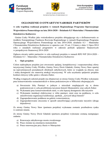 OGŁOSZENIE O OTWARTYM NABORZE PARTNERÓW w celu wspólnej realizacji projektu w ramach Regionalnego Programu Operacyjnego Województwa Pomorskiego na lata 2014-2020 – Działanie 8.3 Materialne i Niematerialne Dziedzictwo Kulturowe Gmina Cedry Wielkie jako wnioskodawca projektu ubiegającego się o dofinansowanie ze środków Europejskiego Funduszu Rozwoju Regionalnego w ramach Regionalnego Programu Operacyjnego Województwa Pomorskiego na lata 2014-2020, działanie 8.3 – Materialne i Niematerialne Dziedzictwo Kulturowe w oparciu o art. 33 ust. 2 Ustawy z dnia 11 lipca 2014 roku o zasadach realizacji programów w zakresie polityki spójności finansowych w perspektywie finansowej 2014-2020 Ogłasza otwarty nabór partnerów w celu realizacji projektu w ramach RPO WP 2014-2020 – Działanie 8.3 – Materialne i Niematerialne Dziedzictwo Kulturowe I. Opis projektu Celem nadrzędnym projektu jest stworzenie spójnej, kompleksowej i rozpoznawalnej oferty turystycznej Gminy Cedry Wielkie, Gminy Nowy Dwór Gdański, Gminy Nowy Staw opartej na najważniejszych posiadanych obiektach zabytkowych, które ze względu na obecny stan i niską dostępność nie stanowią atrakcji turystycznej. W celu uzyskania spójności projektu konkurs dotyczy tylko gmin z obszaru Żuław. Według wstępnych założeń projekt ma obejmować ze strony Gminy Cedry Wielkie wykonanie prac konserwatorsko restauratorskich w domu podcieniowym w Miłocinie obejmujących: a) Stworzenie Izby Pamięci w jednym z mieszkań znajdujących się w domu podcieniowym w celu przybliżenia turystom historii Mennonitów oraz całych Żuław b) Wykonanie prac konserwatorskich sieni, w celu lepszej dostępności dla turystów c) Wykonanie instalacji elektrycznej w izbie pamięci, sieni oraz na poddaszu, w celu umożliwienia organizacji konferencji, spotkań, „żywych lekcji historii” d) Zagospodarowanie poddasza na galerie wstawienniczą e) Zagospodarowanie otoczenia w sposób umożliwiający przebywanie turystów (droga dojazdowa) Ze strony Gminy Nowy Staw (partnera projektu) wykonana zostanie przebudowa rynku w centrum miasta. Ze strony Gminy Nowy Dwór Gdański (partnera projektu) wykonane zostaną następujące zadania: a) Renowacja zabytkowego mostu zwodzonego b) Prace ziemne na cmentarzu menonickim c) Prace renowacyjne przy śluzie w Marzęcinie 1 Dzięki działaniom podjętym przez Gminę Cedry Wielkie, gminy partnerskie oraz potencjalnych partnerów stworzona zostanie kompleksowa, rozpoznawalna oferta turystyczna oparta na charakterystycznych walorach dziedzictwa kulturowego. W konsekwencji stworzone zostaną warunki dla rozwoju gospodarczego tych obszarów co przyczyni się do wzrostu zatrudnienia oraz bardziej zrównoważonego wykorzystania posiadanych walorów o wysokim potencjale turystycznym. Projekty ubiegające się o dofinansowanie w ramach Działania 8.3 powinny być projektami partnerskimi, realizowanymi we współpracy pomiędzy instytucjami na różnych szczeblach i z różnych dziedzin działalności. W celu stworzenie spójnego projektu, odpowiadającego na potrzeby Gminy i zapewniającego osiągnięcie założonych celów, wskazane jest nawiązanie współpracy z podmiotami, których działania mają lub mogłyby mieć wpływ m.in. na wzrost atrakcyjności turystycznej w Gminach Cedry Wielkie, Nowy Dwór Gdański, Gminy Nowy Staw oraz gmin z obszaru Żuław. II. Spodziewany czas realizacji projektu: III kwartał 2016 – III kwartał 2018 Typy instytucji, z jakimi możliwe jest utworzenie partnerstwa w celu realizacji projektu: III. Zgodnie ze „Szczegółowym opisem osi priorytetowych RPO WP 2014 – 2020” beneficjentami pomocy mogą być: jednostki samorządu terytorialnego i ich jednostki organizacyjne; związki i stowarzyszenia jednostek samorządu terytorialnego; organizacje pozarządowe; instytucje kultury; instytucje edukacyjnej; szkoły wyższe; przedsiębiorcy (w tym organizatorzy turystyczni); kościoły i związki wyznaniowe; ROT/LOT. IV. Typy projektów możliwych do realizacji w ramach Działania 8.3; a) prace restauratorskie, prace konserwatorskie oraz adaptacja budynków, budowli i innych obiektów o znaczeniu historycznym (w tym obiektów archeologicznych, z wyłączeniem budynków administracji publicznej), nadanie im nowych ogólnodostępnych funkcji użytkowych, kulturowych oraz turystycznych, w tym także zabezpieczenie obiektów dziedzictwa kulturowego na wypadek zagrożeń; b) prace restauratorskie, prace konserwatorskie oraz adaptacja zespołów fortyfikacyjnych oraz budowli obronnych i nadanie im nowych ogólnodostępnych funkcji użytkowych, kulturowych oraz turystycznych; c) prace restauratorskie, prace konserwatorskie i zagospodarowanie ogólnodostępnych założeń parkowych oraz zabytków sztuki inżynieryjnej, kompleksowych założeń przemysłowych i folwarcznych wraz z nadaniem im nowych ogólnodostępnych funkcji kulturowych i turystycznych; a) b) c) d) e) f) g) h) 2 d) prace restauratorskie, prace konserwatorskie zabytkowych budynków sakralnych stanowiących atrakcję turystyczną; e) kompleksowe zagospodarowanie przestrzeni publicznych wraz z małą architekturą i infrastrukturą towarzyszącą w ramach układów urbanistycznych i ruralistycznych wpisanych do rejestru zabytków; f) udostępnienie zasobów kultury z wykorzystaniem nowoczesnych technologii informacyjno – komunikacyjnych ( w szczególności digitalizacja zasobów, tworzenie nowych treści cyfrowych) V. Warunki wymagane od partnerów: 1. Spełnienie definicji partnera zawartej w „Zasadach wdrażania Regionalnego Programu Operacyjnego Województwa Pomorskiego na lata 2014-2020” „Partnerstwo oznacza zaangażowanie we wspólną realizację projektu co najmniej dwóch samodzielnych, niezależnych podmiotów, wymienionych we wniosku o dofinansowanie projektu, których udział jest uzasadniony, konieczny i niezbędny, gdyż może przyczynić się do osiągnięcia celów projektu w wymiarze większym ni
