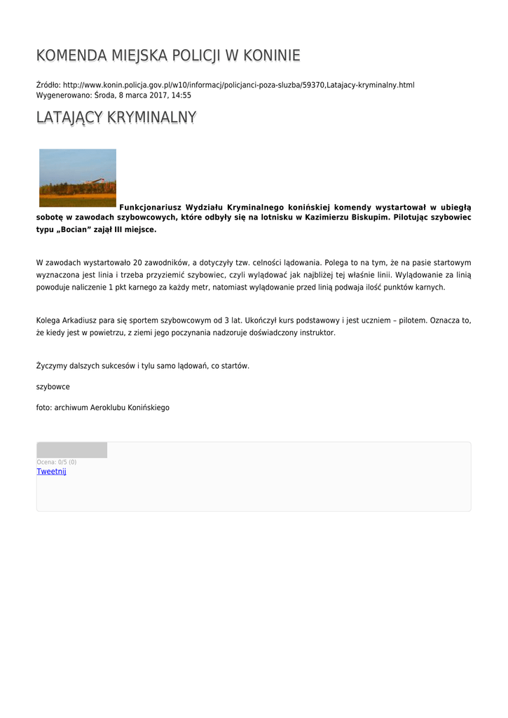 KOMENDA MIEJSKA POLICJI W KONINIE Źródło: http://www.konin.policja.gov.pl/w10/informacj/policjanci-poza-sluzba/59370,Latajacy-kryminalny.html Wygenerowano: Środa, 8 marca 2017, 14:55 LATAJĄCY KRYMINALNY Funkcjonariusz Wydziału Kryminalnego konińskiej komendy wystartował w ubiegłą sobotę w zawodach szybowcowych, które odbyły się na lotnisku w Kazimierzu Biskupim. Pilotując szybowiec typu „Bocian” zajął III miejsce. W zawodach wystartowało 20 zawodników, a dotyczyły tzw. celności lądowania. Polega to na tym, że na pasie startowym wyznaczona jest linia i trzeba przyziemić szybowiec, czyli wylądować jak najbliżej tej właśnie linii. Wylądowanie za linią powoduje naliczenie 1 pkt karnego za każdy metr, natomiast wylądowanie przed linią podwaja ilość punktów karnych. Kolega Arkadiusz para się sportem szybowcowym od 3 lat. Ukończył kurs podstawowy i jest uczniem – pilotem. Oznacza to, że kiedy jest w powietrzu, z ziemi jego poczynania nadzoruje doświadczony instruktor. Życzymy dalszych sukcesów i tylu samo lądowań, co startów. szybowce foto: archiwum Aeroklubu Konińskiego Ocena: 0/5 (0) Tweetnij