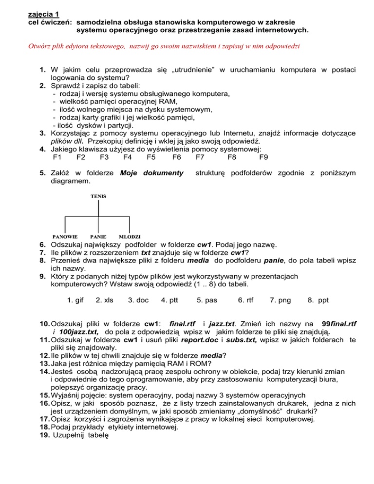 zajęcia 1 cel ćwiczeń: samodzielna obsługa stanowiska komputerowego w zakresie systemu operacyjnego oraz przestrzeganie zasad internetowych. Otwórz plik edytora tekstowego, nazwij go swoim nazwiskiem i zapisuj w nim odpowiedzi 1. W jakim celu przeprowadza się „utrudnienie” w uruchamianiu komputera w postaci logowania do systemu? 2. Sprawdź i zapisz do tabeli: - rodzaj i wersję systemu obsługiwanego komputera, - wielkość pamięci operacyjnej RAM, - ilość wolnego miejsca na dysku systemowym, - rodzaj karty grafiki i jej wielkość pamięci, - ilość dysków i partycji. 3. Korzystając z pomocy systemu operacyjnego lub Internetu, znajdź informacje dotyczące plików dll. Przekopiuj definicję i wklej ją jako swoją odpowiedź. 4. Jakiego klawisza użyjesz do wyświetlenia pomocy systemowej: F1 F2 F3 F4 F5 F6 F7 F8 F9 5. Załóż w folderze Moje dokumenty diagramem. strukturę podfolderów zgodnie z poniższym TENIS PANOWIE PANIE MLODZI 6. Odszukaj największy podfolder w folderze cw1. Podaj jego nazwę. 7. Ile plików z rozszerzeniem txt znajduje się w folderze cw1? 8. Przenieś dwa największe pliki z folderu media do podfolderu panie, do pola tabeli wpisz ich nazwy. 9. Który z podanych niżej typów plików jest wykorzystywany w prezentacjach komputerowych? Wstaw swoją odpowiedź (1 .. 8) do tabeli. 1. gif 2. xls 3. doc 4. ptt 5. pas 6. rtf 7. png 8. ppt 10. Odszukaj pliki w folderze cw1: final.rtf i jazz.txt. Zmień ich nazwy na 99final.rtf i 100jazz.txt, do pola z odpowiedzią wpisz w jakim folderze te pliki się znajdują. 11. Odszukaj w folderze cw1 i usuń pliki report.doc i subs.txt, wpisz w jakich folderach te pliki się znajdowały. 12. Ile plików w tej chwili znajduje się w folderze media? 13. Jaka jest różnica między pamięcią RAM i ROM? 14. Jesteś osobą nadzorującą pracę zespołu ochrony w obiekcie, podaj trzy kierunki zmian i odpowiednie do tego oprogramowanie, aby przy zastosowaniu komputeryzacji biura, polepszyć organizację pracy. 15. Wyjaśnij pojęcie: system operacyjny, podaj nazwy 3 systemów operacyjnych 16. Opisz, w jaki sposób poznasz, że z listy trzech zainstalowanych drukarek, jedna z nich jest urządzeniem domyślnym, w jaki sposób zmieniamy „domyślność” drukarki? 17. Opisz korzyści i zagrożenia wynikające z pracy w lokalnej sieci komputerowej. 18. Podaj przykłady etykiety internetowej. 19. Uzupełnij tabelę grupa programów tekstowe graficzne Audio filmowe internetowe arkusze kalkulacyjne baza danych programy typ plików