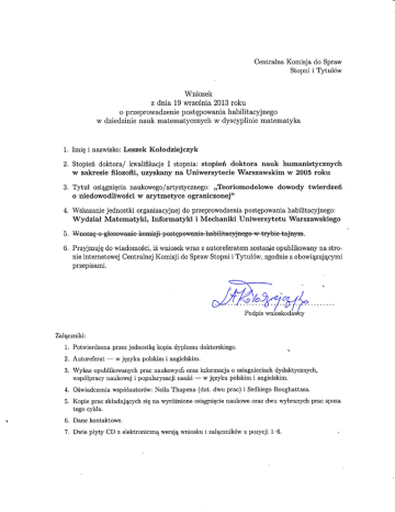 Centralna Komisja do Spraw Stopni i Ętułów Wniosek z dnia 19 wTześnia 2013 roku o przeplowadzenie postępowania habilitacyjnego w dziedzinie nauk matematycznych w dyscyplinie matematyka 1. Imię i nazwisko: Leszek Kołodziejczyk 2. Stopień doktora/ kwalifikacje I stopnia: stopień doktora nauk humanistycznych w zakresie fflozofli, uzyskany na Uniwersytecie Warszawskim w 2005 roku Tytuł osiągnięcia naukowego/artystycznego: ,rTeoriomodelowe dowody twierdzeń o niedowodliwości w arytmetyce ograniczonej'' Wskazanie jednostki organizacyjnej do przeprowadzenia postępowania habilitacyjnego: Wydział Matematyki, Informatyki i Mechaniki Irniwersytetu Warszawskiego Wrresgę e głesełvaiłiekemłsji pestępawaida habilita€yj*eto 6. w trybie t&jnym. Przyjmuję do wiadomości, iż wniosek wraz z autoreferatem zostanie opublikowany na stro. nie internetowej Centralnej Komisji do Spraw Stopni i T1'tułów, zgodnie z obowiązującymi przepisami. ZaŁącznikil 1. Potwierdzona przez jednostkę kopia dyplomu doktorskiego. 2. Autoreferat - w języku polskim i angielskim. 3. Wykaa opublikowanych prac naukowycń oraz informacja o osiagnieciach dydaktycznych' współpracy naukowej i popularyzacji nauki - w języku polskim i angielskim. 4. oświadczenia współautorów: Neila Thapena (dot. dwu prac) i Sedkiego Boughattasa. 5. Kopie prac składających się na wyróżnioue osiągnięcie naukowe oraz dwu wybranych prac spoza tego cyklu. 6. Dane kontaktowe. 7. Dwie płyty CD z elektroniczną wersją wniosku i za|ączn\ków z pozycji 1-6.