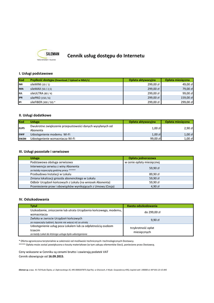 Cennik usług dostępu do Internetu I. Usługi podstawowe Kod IMI IMA IUL IPR IFI Prędkość dostępu (Download / Upload w Mbit/s) sileMINI (10 / 1) sileMAX (50 / 2,5) sileULTRA (80 / 4) silePRO (150 / 6) sileFIBER (300 / 50) * Opłata aktywacyjna 299,00 zł 299,00 zł 299,00 zł 299,00 zł 299,00 zł Opłata miesięczna 49,00 zł 79,00 zł 99,00 zł 159,00 zł 299,00 zł Opłata aktywacyjna Opłata miesięczna II. Usługi dodatkowe Kod EUPS EWIF EWZM Usługa Dwukrotne zwiększenie przepustowości danych wysyłanych od Abonenta Udostępnienie modemu Wi-Fi Udostępnienie wzmacniacza Wi-Fi 1,00 zł 2,90 zł 1,00 zł 99,00 zł 1,00 zł 1,00 zł III. Usługi pozostałe i serwisowe Usługa Podstawowa obsługa serwisowa Interwencja serwisu z winy Abonenta za każdą rozpoczętą godzinę pracy ***** Przebudowa Instalacji w Lokalu Zmiana lokalizacji gniazda abonenckiego w Lokalu Odbiór Urządzeń końcowych z Lokalu (na wniosek Abonenta) Przeniesienie praw i obowiązków wynikających z Umowy (Cesja) Opłata jednorazowa w cenie opłaty miesięcznej 59,90 zł 89,90 zł 59,90 zł 59,90 zł 4,90 zł IV. Odszkodowania Tytuł Uszkodzenie, zniszczenie lub utrata Urządzenia końcowego, modemu, wzmacniacza Zwłoka w zwrocie Urządzeń końcowych za rozpoczęty tydzień, łącznie nie więcej niż za utratę Udostępnienie usług poza Lokalem lub za odpłatnością osobom trzecim za każdy Lokal do którego usługa była udostępniona Kwota odszkodowania do 299,00 zł 9,90 zł trzykrotność opłat miesięcznych * Oferta ograniczona terytorialnie w zależności od możliwości technicznych i technologicznych Dostawcy. ***** Opłata może zostać powiększona o koszty materiałowe (w tym zakupu elementów Sieci), poniesione przez Dostawcę. Ceny wskazane w Cenniku są cenami brutto i zawierają podatek VAT Cennik obowiązuje od 16.09.2015. Sileman sp. z o.o. 41-710 Ruda Śląska, ul. Dąbrowskiego 35, KRS 0000207875 (Sąd Rej. w Gliwicach, X Wydz. Gospodarczy KRS), kapitał zakł. 190000 zł, NIP 641-23-15-845