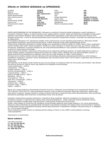 Oferta nr 293819 (DZIAŁKA na SPRZEDAŻ) Id oferty SWO ID Rodzaj umowy Oferta bezpośrednia Stan prawny gruntu Cena Powierzchnia działki Cena za m2 Przeznaczenie działki Rynek 293819 293819 Bez wyłączności tak Własność 146 900 PLN 1130 130 PLN Budowlana Wtórny Prąd Kanalizacja Woda Gaz Droga dojazdowa Ujęcie wody Rodzaj kanalizacji Ogrodzenie Obecna zabudowa działki tak tak tak tak Kostka brukowa Miejska w drodze Miejska na działce Brak Brak OFERTA BEZPOŚREDNIA 0% OD KUPUJĄCEGO. Oferujemy w okolicach Szczecina działki budowlane w pełni uzbrojone w niezwykle urokliwym miejscu, w którym panuje cisza i spokój. Jednym z takich miejsc jest Kobylanka, przepiękna miejscowość położona nad jeziorem Miedwie, która pozostaje w bezpośrednim sąsiedztwie miast takich jak przytoczony Szczecin oraz Stargard Szczeciński, a mimo to oferuje poszukiwany przez wszystkich bezpośredni kontakt z przyrodą oraz doskonałe warunki do odpoczynku. W kompleksie oferujemy 127 uzbrojonych działek, które przeznaczone są pod zabudowę jednorodzinną. Oferowane działki łączą idealną lokalizację, nowoczesną infrastrukturę, a także atrakcyjne ceny metra kwadratowego gruntu. Powierzchnie budowlane oferowanych działek wahają się w przedziale od 1000 do 1600 m2, dzięki czemu możesz swobodnie wybrać działkę, która spełni Twoje wymagania. Działki są w pełni uzbrojone w media takie jak, prąd, gaz ziemny, wodę oraz kanalizację. Dodatkowo na terenie znajduje się sieć dróg wewnątrzosiedlowych wraz systemem oświetleniowym zbudowanym w oparciu o nowoczesne technologie. Duża powierzchnia działek, nowoczesna infrastruktura oraz znakomita lokalizacja sprawia, że działki Kobylanka to jedyny w swoim rodzaju projekt i znakomita inwestycja dla Ciebie lub Twojej rodziny. Bliskość lasu oraz jeziora Miedwie sprawia, że działki koło Szczecina Kobylanka są miejscem, które od razu zrobi wrażenie na Tobie i Twoich bliskich. Dla tego terenu zostały wydane warunki zabudowy które przewidują zabudowę zabudowę jednorodzinną, wolno-stojącą z poddaszem użytkowym i garażem, dachy dwuspadowe (kąt nachylenia połaci dachu 35-45 stopni) i kopertowe (kąt nachylenia połaci dachu 30-40 stopni) Lokalizacja: Jeśli będziesz chciał dostać się do miasta do pracy lub na zakupy, to wystarczy tylko 20 minut jazdy samochodem, aby dotrzeć do centrum Szczecina i tylko 8 minut, aby dojechać do Stargardu Szczecińskiego. szkoła podstawowa – 1350 m urząd gminy – 1350 m ośrodek zdrowia – 1300 m kościół rzymskokatolicki – 1200 m urząd pocztowy – 1200 m gminny ośrodek kultury – 600 m biblioteka – 600 m straż pożarna – 600 m teatr letni i promenada – 2300 m restauracje – 2300 m stadnina koni – 3600 m przystań i plaża – 3500 m szpital – 11000 m Biorąc pod uwagę lokalizację (bezpośrednia bliskość Szczecina i Stargardu Szczecińskiego) oraz wyposażenie działek, cena 130 zł (brutto z 23% VAT) za 1 metr kwadratowy sprawia, że jest to obecnie niezwykle atrakcyjna inwestycja i jedyna tego typu oferta w regionie. Kupując działkę na możesz również skorzystać z preferencyjnej oferty deweloperskiej, która przewiduje postawienie gotowego domu pod klucz w doskonałej relacji ceny do jakości. Kompleks mieszkaniowy posiada utwardzone i oświetlone drogi osiedlowe. Obecnie prowadzone są intensywne prace budowlane związane z zakończeniem budowy dróg wewnątrzosiedlowych . Dzięki niezwykle prężnej działalności gminy, przyszli mieszkańcy osiedla będą mogli korzystać z nowoczesnej infrastruktury technicznej. Szybki i łatwy dojazd ze Szczecina oraz Stargardu Szczecińskiego zapewnia nowa droga krajowa nr 10, zaś po planowanym włączeniu gminy Kobylanka do projektowanej metropolii szczecińskiej prowadzić tam będzie także linia komunikacji miejskiej. O atrakcyjności terenu niewątpliwie decyduje również jego lokalizacja w sąsiedztwie rozległych obszarów leśnych, w odległości ok. 1 km od jeziora Miedwie. Gmina Kobylanka została uznana za najlepszą gminę wiejską w Polsce w roku 2008 w samorządowym rankingu „Rzeczypospolitej”. Zapraszamy na prezentację. Dane maklera Arka Nieruchomości tel. tel. 91 433 59 85, tel. 91 433 52 49, tel. tel. 512 080 803, tel. 508 382 979 Świat nieruchomości Świat nieruchomości Powered by TCPDF (www.tcpdf.org)