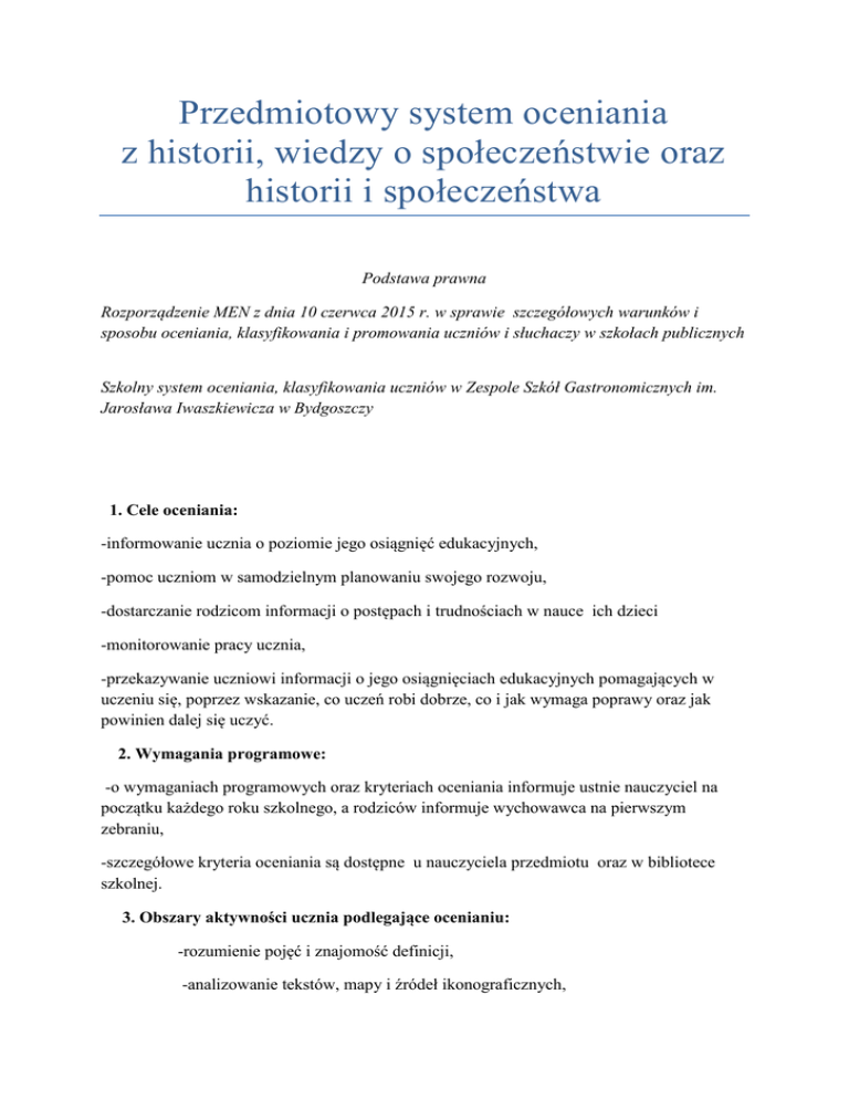 Przedmiotowy system oceniania z historii, wiedzy o społeczeństwie oraz historii i społeczeństwa Podstawa prawna Rozporządzenie MEN z dnia 10 czerwca 2015 r. w sprawie szczegółowych warunków i sposobu oceniania, klasyfikowania i promowania uczniów i słuchaczy w szkołach publicznych Szkolny system oceniania, klasyfikowania uczniów w Zespole Szkół Gastronomicznych im. Jarosława Iwaszkiewicza w Bydgoszczy 1. Cele oceniania: -informowanie ucznia o poziomie jego osiągnięć edukacyjnych, -pomoc uczniom w samodzielnym planowaniu swojego rozwoju, -dostarczanie rodzicom informacji o postępach i trudnościach w nauce ich dzieci -monitorowanie pracy ucznia, -przekazywanie uczniowi informacji o jego osiągnięciach edukacyjnych pomagających w uczeniu się, poprzez wskazanie, co uczeń robi dobrze, co i jak wymaga poprawy oraz jak powinien dalej się uczyć. 2. Wymagania programowe: -o wymaganiach programowych oraz kryteriach oceniania informuje ustnie nauczyciel na początku każdego roku szkolnego, a rodziców informuje wychowawca na pierwszym zebraniu, -szczegółowe kryteria oceniania są dostępne u nauczyciela przedmiotu oraz w bibliotece szkolnej. 3. Obszary aktywności ucznia podlegające ocenianiu: -rozumienie pojęć i znajomość definicji, -analizowanie tekstów, mapy i źródeł ikonograficznych, -aktywność na lekcjach, -praca w grupie, -udział w projektach edukacyjnych, -prace dodatkowe. 4. Sposoby sprawdzania osiągnięć ucznia: -test kontrolny (obejmuje materiał z jednego okresu, może wystąpić dwa razy w ciągu roku i winien być zapowiedziany z dwutygodniowym wyprzedzeniem), -praca klasowa (obejmuje maksymalnie treść trzech działów programu nauczania, zaplanowana na całą jednostkę lekcyjną, zapowiedziana dwa tygodnie wcześniej), - sprawdzian (obejmuje maksymalnie treść jednego działu programu nauczania, termin i zakres problemowy materiału podaje nauczyciel z tygodniowym wyprzedzeniem), -kartkówka (obejmuje zakres treściowy od 1 do 4 zajęć edukacyjnych, może wystąpić bez zapowiedzi), -wypowiedzi ustne (zakres treściowy maksymalnie do trzech ostatnich tematów lekcyjnych, omawianych maksymalnie na pięciu jednostkach lekcyjnych), obejmują zakres treściowy maksymalnie do trzech ostatnich tematów lekcyjnych (omawianych maksymalnie na pięciu jednostkach lekcyjnych), może wystąpić na każdej lekcji bez wcześniejszego uprzedzenia ucznia, -prace domowe - w formie dłuższej lub krótszej wypowiedzi – referatu, opisu, notatki, wypracowania, albo w formie odpowiedzi na postawione pytania; przy ocenie pisemnej pracy domowej uwzględnia się: zgodność z tematem pracy, poprawność merytoryczną, zawartość rzeczową, wkład pracy ucznia, kreatywność, -aktywność na lekcji- uczeń ma obowiązek aktywnie uczestniczyć w lekcjach i angażować się we wszelkie czynności edukacyjne podejmowane na zajęciach przedmiotowych, za aktywne uczestniczenie w lekcji – zgłaszanie się do odpowiedzi, pracę w grupie, zgłaszanie pomysłów i rozwiązań postawionych problemów uczeń może otrzymywać plusy, albo za szczególne zaangażowanie nawet ocenę dobrą lub bardzo dobrą wpisaną do dziennika. Otrzymane trzy plusy w semestrze skutkują na koniec każdego semestru oceną bardzo dobrą; natomiast dwa plusy – oceną dobrą, zaś jeden plus w rozliczeniu semestralnym daje ocenę dostateczną, brak jakiejkolwiek pracy ucznia na lekcji, pomimo kontroli i zwracania uwagi przez nauczyciela oraz niewykonywanie ćwiczeń i zadań może skutkować oceną niedostateczną wpisaną na danej lekcji do dziennika, -udział w konkursach i olimpiadach przedmiotowych, -prace dodatkowa, -realizacja projektów edukacyjnych. 5. Zasady organizacyjne oceniania: -nauczyciel systematycznie sprawdza wiedzę uczniów i wpisuje oceny do dziennika, -z jednej formy sprawdzania osiągnięć edukacyjnych uczeń może uzyskać tylko jedną ocenę, -uczeń powinien otrzymać minimum cztery oceny w semestrze, -oceny są jawne dla ucznia, -na wniosek ucznia lub jego rodziców nauczyciel uzasadnia ustaloną ocenę ( uzasadnienie jest przekazywane w formie ustnej podczas ustalonego wcześniej spotkania z wnioskodawcą), -na życzenie rodziców nauczyciel udostępnia prace do wglądu na swoim dyżurze, -w przypadku nieuzasadnionej nieobecności ucznia na teście, pracy klasowej lub sprawdzianie, nauczyciel ma prawo sprawdzenia jego wiedzy na kolejnej lekcji, -nauczyciel ma prawo przerwać pisanie pracy uczniowi lub całej klasie, może wystawić ocenę niedostateczną, jeżeli w trakcie pracy klasowej, sprawdzianu lub testu ma miejsce złamanie regulaminu ( np. korzystanie z niedozwolonych źródeł) bez możliwości poprawiania oceny, -brak pracy domowej, brak zeszytu przedmiotowego może być podstawą do ustalenia bieżącej oceny niedostatecznej, -uczeń po przebyciu kilkudniowej choroby ( minimum siedmiodniowej) ma obowiązek w ciągu tygodnia uzupełnić wiadomości, w przypadku krótszej nieobecności usprawiedliwionej uczeń jest zobowiązany uzupełnić wiadomości w ciągu dwóch dni, nie zwalnia to ucznia z bieżącego przygotowania do lekcji. 6. Sposób ustalenia ocen bieżących, śródrocznych i rocznych: -punkty z prac pisemnych (sprawdzianów, prac klasowych i testów) przelicza się według następującej skali procentowej: Procent punktów Ocena 91-100 + wykonanie dodatkowych zadań wskazanych przez nauczyciela 91-100 76-90 51-75 40-50 0-39 celujący bardzo dobry dobry dostateczny dopuszczający niedostateczny -oceny śródroczna i roczna nie jest średnią arytmetyczną, -przy wystawieniu oceny końcowej uwzględniana jest ocena semestralna. W przypadku wątpliwości co do oceny końcowej decydującą rolę odgrywają oceny z prac klasowych, sprawdzianów i testów. Ocenę niedostateczną może otrzymać uczeń, który z wszystkich prac pisemnych (sprawdziany, prace klasowe, testy ) otrzymał oceny niedostateczne, mimo iż ma inne oceny pozytywne np. za 