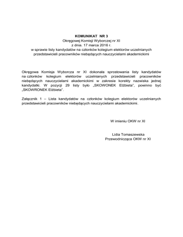 KOMUNIKAT NR 3 Okręgowej Komisji Wyborczej nr XI z dnia. 17 marca 2016 r. w sprawie listy kandydatów na członków kolegium elektorów uczelnianych przedstawicieli pracowników niebędących nauczycielami akademickimi Okręgowa Komisja Wyborcza nr XI dokonała sprostowania listy kandydatów na członków kolegium elektorów uczelnianych przedstawicieli pracowników niebędących nauczycielami akademickimi w zakresie korekty nazwiska jednej kandydatki. W pozycji 29 listy było „SKOWONEK Elżbieta”, powinno być „SKOWRONEK Elżbieta”. Załącznik 1 – Lista kandydatów na członków kolegium elektorów uczelnianych przedstawicieli pracowników niebędących nauczycielami akademickimi. W imieniu OKW nr XI Lidia Tomaszewska Przewodnicząca OKW nr XI