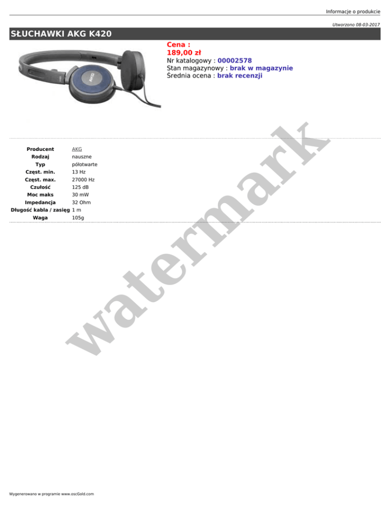 Informacje o produkcie Utworzono 08-03-2017 SŁUCHAWKI AKG K420 Cena : 189,00 zł Producent Rodzaj Typ AKG nauszne półotwarte Częst. min. 13 Hz Częst. max. 27000 Hz Czułość 125 dB Moc maks 30 mW Impedancja 32 Ohm Długość kabla / zasięg 1 m 105g w at Waga er m ar k Nr katalogowy : 00002578 Stan magazynowy : brak w magazynie Średnia ocena : brak recenzji Wygenerowano w programie www.oscGold.com