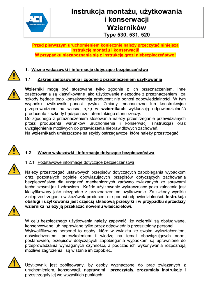 Instrukcja montażu, użytkowania i konserwacji Wzierników Type 530, 531, 520 Przed pierwszym uruchomieniem koniecznie należy przeczytać niniejszą instrukcję montażu i konserwacji! W przypadku niezapoznania się z instrukcją grozi niebezpieczeństwo! 1. Ważne wskazówki i informacje dotyczące bezpieczeństwa 1.1 Zakres zastosowania i zgodne z przeznaczeniem użytkowanie Wzierniki mogą być stosowane tylko zgodnie z ich przeznaczeniem. Inne zastosowania są klasyfikowane jako użytkowanie niezgodne z przeznaczeniem i za szkody będące tego konsekwencją producent nie ponosi odpowiedzialności. W tym wypadku użytkownik ponosi ryzyko. Zmiany mechaniczne lub konstrukcyjne przeprowadzone na własną rękę w wziernikach wykluczają odpowiedzialność producenta z szkody będące rezultatem takiego stanu rzeczy. Do zgodnego z przeznaczeniem stosowania należy przestrzeganie przewidzianych przez producenta warunków uruchomienia i konserwacji (instrukcja) oraz uwzględnienie możliwych do przewidzenia nieprawidłowych zachowań. Na wziernikach umieszczone są szyldy ostrzegawcze, które należy przestrzegać. 1.2 Ważne wskazówki i informacje dotyczące bezpieczeństwa 1.2.1 Podstawowe informacje dotyczące bezpieczeństwa Należy przestrzegać ustawowych przepisów dotyczących zapobiegania wypadkom oraz pozostałych ogólnie obowiązujących przepisów dotyczących zachowania bezpieczeństwa dla urządzeń mechanicznych zarówno związanych ze sprawami technicznymi jak i zdrowiem. Każde użytkowanie wykraczające poza zalecenia jest klasyfikowany jako niezgodne z przeznaczeniem użytkowanie. Za szkody wynikłe z nieprzestrzegania wskazówek producent nie ponosi odpowiedzialności. Instrukcja obsługi i użytkowania jest częścią składową przesyłki i w przypadku sprzedaży wziernika należy ją przekazać nowemu właścicielowi. W celu bezpiecznego użytkowania należy zapewnić, że wzierniki są obsługiwane, konserwowane lub naprawiane tylko przez odpowiednio przeszkolony personel. Wykwalifikowany personel to osoby, które w związku ze swoim wykształceniem, doświadczeniem, przeszkoleniem i wiedzą na temat obowiązujących norm, postanowień, przepisów dotyczących zapobiegania wypadkom są uprawnione do przeprowadzania wymaganych czynności, a podczas ich wykonywania rozpoznają możliwe zagrożenia i są w stanie im zapobiec. Użytkownik jest zobligowany, by osoby wyznaczone do prac związanych z uruchomieniem, konserwacji, naprawami przeczytały, zrozumiały instrukcję i przestrzegały jej we wszystkich punktach: Instrukcja montażu, użytkowania i konserwacji Wzierników Type 530, 531, 520 - aby uniknąć zagrożenia dla zdrowia i życia użytkownika i osób trzecich i - wykluczyć przestoje i szkody dla środowiska powstałe w wyniku nieprawidłowego użytkowania. Zakres odpowiedzialności w odniesieniu do bezpieczeństwa wśród pracowników musi być jasno ustalony i dotrzymywany. Prace z wziernikami mogą odbywać się tylko przy wyłączonym urządzeniu ewntualnie przy niepodłączonych przewodach. W miejscach, w których przewód jest otwarty lub może być wypełniany należy umieścić wskazówkę z informacją o pracach z wziernikami. Po zakończeniu prac konserwacyjnych należy ponownie zmontować wszystkie zdemontowane urządzenia ochronne. Urządzenia ochronne i ich działanie muszą zostać sprawdzone przez rzeczoznawcę przed uruchomieniem maszyny. Roszczenie gwarancyjne wygasza, jeśli: - szkody powstają w wyniku nieprawidłowego użytkowania, szkody powstają w wyniku niewłaściwego składowania, naprawy bądź ingerencje są dokonywane przez nieuprawnione osoby, stosuje się części dodatkowe i zamienne niekompatybilne z wziernikami, stosowane są nieoryginalne części zamienne. O awarii należy poinformować natychmiast po jej wykryciu. Wzierniki muszą być odpowiednio oznakowane. Uszkodzenia należy natychmiast usuwać, aby utrzymywać jak najmniejszy zakres usterek i nie zagrażać bezpiecznej eksploatacji maszyny. W wypadku niedotrzymania powyższego wygasa prawo do roszczenia gwarancyjnego. Zmiany w myśl ulepszeń technicznych może dokonywać jedynie producent. 1.2.2 Ogólne wskazówki bezpieczeństwa Niniejsze wskazówki bezpieczeństwa nie uprawniają do roszczenia kompletności W razie pytań i problemów należy skontaktować się z producentem. Wzierniki są skonstruowane zgodnie z najnowszym stanem techniki i są wysyłane w bezpieczny sposób dla ich eksploatacji. Instrukcja montażu, użytkowania i konserwacji Wzierników Type 530, 531, 520 Wzierniki mogą być stosowane i eksploatowane tylko w ramach postanowień umowy dostawy i świadczeń. Dodatkowe wyposażanie, zmiany, przebudowy wzierników są niedozwolone. W takich wypadkach należy koniecznie skontaktować się z producentem. 1.2.3. Szczególne zasady bezpieczeństwa Należy przestrzegać wskazówek np. tabliczek znamionowych, wskazówek ostrzegawczych umieszczonych na wziernikach. Nie może znajdować się na nich farba bądź brud. Brakujące szyldy należy zastąpić nowymi. Obchodzenie się z wziernikami/armaturami wymaga szczególnego podejścia: Należy przestrzegać obowiązujące przepisy bezpieczeństwa - w szczególności dotyczące przewodów rurowych ciśnienia i temperatury. Przed pierwszym uruchomieniem przestrzegać punktu 4! Podczas czyszczenia i prac konserwacyjnych przestrzegać punktów 5 i 6! Wszystkie prace montażowe należy przeprowadzać wyłącznie bez dopływu ciśnienia i w ostygniętym stanie. Dokładnie odciąć dopływy, przy przeciwciśnieniu a także przewody odpływowe. Stosować tylko oryginalne części zamienne. Uwaga: W czasie eksploatacji armatury wziernikowe są pod wpływem ciśnienia wewnętrznego i zazwyczaj gorące! W czasie prac konserwacyjnych podczas eksploatacji istnieje ryzyko ciężkich poparzeń i sparzeń środkami żrącymi przez wydostający się środek. Należy zawsze nosić ubranie i okulary ochronne! Instrukcja 