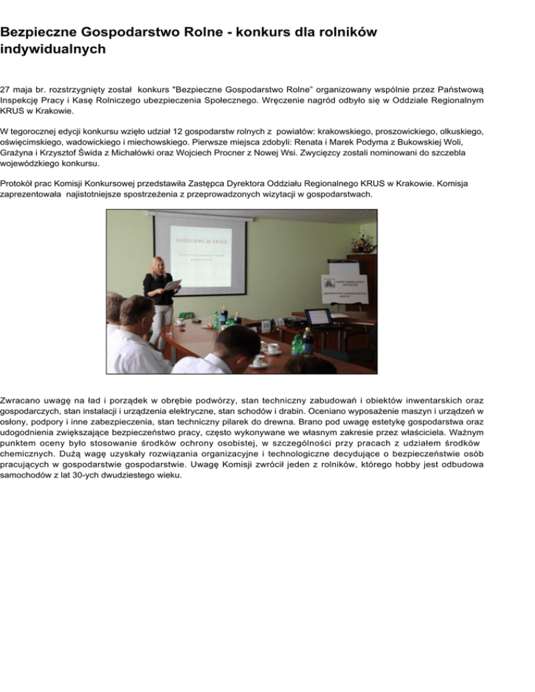 Bezpieczne Gospodarstwo Rolne - konkurs dla rolników indywidualnych 27 maja br. rozstrzygnięty został konkurs "Bezpieczne Gospodarstwo Rolne” organizowany wspólnie przez Państwową Inspekcję Pracy i Kasę Rolniczego ubezpieczenia Społecznego. Wręczenie nagród odbyło się w Oddziale Regionalnym KRUS w Krakowie. W tegorocznej edycji konkursu wzięło udział 12 gospodarstw rolnych z powiatów: krakowskiego, proszowickiego, olkuskiego, oświęcimskiego, wadowickiego i miechowskiego. Pierwsze miejsca zdobyli: Renata i Marek Podyma z Bukowskiej Woli, Grażyna i Krzysztof Świda z Michałówki oraz Wojciech Procner z Nowej Wsi. Zwycięzcy zostali nominowani do szczebla wojewódzkiego konkursu. Protokół prac Komisji Konkursowej przedstawiła Zastępca Dyrektora Oddziału Regionalnego KRUS w Krakowie. Komisja zaprezentowała najistotniejsze spostrzeżenia z przeprowadzonych wizytacji w gospodarstwach. Zwracano uwagę na ład i porządek w obrębie podwórzy, stan techniczny zabudowań i obiektów inwentarskich oraz gospodarczych, stan instalacji i urządzenia elektryczne, stan schodów i drabin. Oceniano wyposażenie maszyn i urządzeń w osłony, podpory i inne zabezpieczenia, stan techniczny pilarek do drewna. Brano pod uwagę estetykę gospodarstwa oraz udogodnienia zwiększające bezpieczeństwo pracy, często wykonywane we własnym zakresie przez właściciela. Ważnym punktem oceny było stosowanie środków ochrony osobistej, w szczególności przy pracach z udziałem środków chemicznych. Dużą wagę uzyskały rozwiązania organizacyjne i technologiczne decydujące o bezpieczeństwie osób pracujących w gospodarstwie gospodarstwie. Uwagę Komisji zwrócił jeden z rolników, którego hobby jest odbudowa samochodów z lat 30-ych dwudziestego wieku. Nagrody zwycięzcom - wysokiej jakości klucze maszynowe, pilarki do drewna, prostowniki rozruchowe, spawarki, szlifierki, kaski i rękawice - wręczyła Zastępca Okręgowego Inspektora Pracy w Krakowie Ewa Staniszewska. Swoje refleksje na temat konkursu wypowiedział, uczestniczący w pracach Komisji od 12 lat inspektor pracy OIP Kraków Leszek Skoczek podkreślił duży postęp w wyposażeniu, technologii oraz estetyce gospodarstw. Finał etapu wojewódzkiego Konkursu Bezpieczne Gospodarstwo Rolne odbył się 13 lipca podczas Podhalańskiej Wystawy Zwierząt Hodowlanych w Ludźmierzu k. Nowego Targu. Na tym etapie rywalizowały ze sobą po trzy gospodarstwa, które zdobyły pierwsze, drugie i trzecie miejsce na etapie regionalnym w Nowym Sączu, Krakowie i Tarnowie. Także i tym razem zwycięzcą zostali Renata i Marek Podyma z Bukowskiej Woli. Małżeństwo posiada gospodarstwo o powierzchni 48 ha o profilu roślinno - zwierzęcym. Prowadzona jest hodowla trzody chlewnej w ilości 2000 sztuk rocznie w zabudowaniach w pełni zautomatyzowanych. Uprawiana jest kukurydza i zboża na potrzeby produkcji zwierzęcej, gromadzone w 5 zbiornikach o pojemności 105 ton. W gospodarstwie znajduje się budynek przygotowalni pasz, wiaty garażowe na cztery ciągniki rolnicze, kombajn zbożowy, maszyny uprawowe i narzędzie rolnicze, beczkowóz do gnojowicy o pojemności 14 tysięcy litrów. Rzadko spotykanym urządzeniem jest samochód ciężarowy przystosowany do przewozu zwierząt na dwóch poziomach. Przed zwycięzcami kolejny etap konkursu – na poziomie ogólnopolskim – życzymy powodzenia.