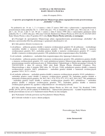 UCHWAŁA NR 390/XXI/2016 RADY MIASTA PŁOCKA z dnia 30 sierpnia 2016 r. w sprawie: przystąpienia do sporządzenia Miejscowego planu zagospodarowania przestrzennego „Kobiałka” w Płocku. Na podstawie art. 14 ust. 1, 2 i 4 ustawy z dnia 27 marca 2003 roku o planowaniu i zagospodarowaniu przestrzennym (tekst jednolity Dz. U. z 2016 roku poz. 778, ze zmianami: poz.904 i poz. 961) oraz art. 7 ust. 1 pkt 1, art. 18 ust. 2 pkt 5 i art. 40 ust. 1 ustawy z dnia 8 marca 1990 roku o samorządzie gminnym (tekst jednolity Dz. U. z 2016 roku poz. 446) oraz Uchwały Budżetowej Miasta Płocka na 2016 rok Nr 252/XIV/2015 Rady Miasta Płocka z dnia 29 grudnia 2015 roku Rada Miasta Płocka uchwala, co następuje: § 1. Przystąpić do sporządzenia Miejscowego planu zagospodarowania przestrzennego „Kobiałka” dla obszaru o powierzchni 60,6 ha, położonego w granicach określonych w §2. § 2. Jako granice obszaru wyznacza się: 1) od północy – północna granica działki o numerze ewidencyjnym gruntów 82 do północno – wschodniego narożnika działki o numerze ewidencyjnym gruntów 85/2, północna granica działki o numerze ewidencyjnym gruntów 86/1, zachodnia granica działki o numerze ewidencyjnym gruntów 87 i części działki o numerze ewidencyjnym gruntów 100, południowa linia rozgraniczająca ulicy Kobiałka; 2) od wschodu – południowo – zachodnia linia rozgraniczająca ulicy Ignacego Łukasiewicza; 3) od południa – północna granica działki o numerze ewidencyjnym gruntów 206, południowa granica działki o numerze ewidencyjnym gruntów 122, część południowej granicy Miejscowego planu zagospodarowania przestrzennego terenów położonych przy ul. Dobrzyńskiej i Zglenickiego w Płocku przyjętego Uchwałą Nr 530/XXVII/04 z dnia 28 czerwca 2004 roku Rady Miasta Płocka (Dziennik Urzędowy Woj. Mazowieckiego z dnia 4 sierpnia 2004 roku, Nr 194 poz. 5168), południowa granica działki o numerze ewidencyjnym gruntów 446/5, południowo - zachodnia granica działek o numerach ewidencyjnych gruntów: 418/1, 417/1 i 416/4; 4) od zachodu: północno – zachodnia granica działki o numerze ewidencyjnym gruntów 416/4, południowo – zachodnia granica części działki o numerze ewidencyjnym gruntów 94, zachodnia granica działek o numerach ewidencyjnych gruntów: 94, 96/2, 96/1, 97/6, 97/4, 97/3, 97/2, 84/5, 84/4, 84/2, 798, południowo – zachodnia granica części działki o numerze ewidencyjnym gruntów 80/1, południowo – zachodnia granica działki o numerze ewidencyjnym gruntów 79/1, zachodnia granica działki o numerze ewidencyjnym gruntów 82, zgodnie z załącznikiem nr 1 do niniejszej uchwały. § 3. Jako źródło finansowania ustalić Budżet Miasta Płocka na 2016 rok, Dział 710, Rozdział 71004, §4300, §4170, §4110, §4120 zadanie 01/WRM.III/G – Opracowania planistyczne – wydatki bezpośrednie oraz środki przewidziane na ten cel w budżetach miasta Płocka na lata następne. § 4. Wykonanie Uchwały powierza się Prezydentowi Miasta Płocka. § 5. Uchwała wchodzi w życie z dniem podjęcia. Przewodniczący Rady Miasta Płocka Artur Jaroszewski Id: 78F2E7D4-498D-49BC-9DAB-269ACD3F1C97. Uchwalony Strona 1 20/13 45/5 47/12 20/66 2/2 47/14 47/15 48/5 49/10 Zał cznik do Uchwały Nr 390/XXI/2016 Rady Miasta Płocka z dnia 30 sierpnia 2016 roku 49/16 20/68 51/8 49/17 47/8 47/2 D 47/5 łu ga 49/2 47/17 20/94 Łukasiewicza 6 48/7 49/12 7 49/15 8 9 16 51/10 50/1 52/1 47/10 47/6 48/3 49/4 19 49/6 26/4 49/8 49/7 79/1 88/29 790/1 798 26/6 32 88/31 55/5 88/32 33 26/7 34/1 88/27 88/42 74 90/1 88/28 55/3 88/33 93 55/15 34/5 137 D 147 73 Maszewska 135/7 ob r zy 84/4 72 86/4 86/3 85/4 88/34 88/24 88/21 91 88/8 88/22 71 54 85/5 a 99/3 97/3 88/35 88/12 88/10 88/18 85/10 Budynki 38/2 146 Kobiałka 97/5 102/1 102/2 107 102/3 99/5 105 106/2 98 102/4 96/1 151/3 108 103 102/5 111 115 112 57 95 123 on rw ze 124 127/2 Parowa 213 y rz 120/1 sk go ie M yc ed z 7 446/6 2 Na 5/1 11/2 119 1 fa M 4/5 527/4 of eh r fe w Tu 419/8 a im a 4/13 447/1 525/2 ia łko ws ki ej ego 221/20 221/18 sk i eg o 1221 98/24 98/31 527/3 ws ki Wy sp 33 446/2 239/1 110/4 Asnyka 221/21 221/14 222 3/1 526/8 541/2 6/20 540/1 14 ie D bro j k ie ws n Ko 251/2 203/4 k nic op iej go arp Na S k 221/24 o ki e aln a i eg ac 528/1 sk w Sło y ł cz Ga 2/16 520/1 526/4 Zal e 340 363/17 Ja minowa ho en 519 220/3 11/5 na a bi 235/3 221/4 Mi o dow m Za u ał Ch 219/3 191/1 da 159/23 12 No rw i d Ju 218 214/1 8 127/1 go ie a ym 217 216 215/2 214/2 a ad ni k ec 234 229/1 215/3 126/1 K 156/1 Sz p it 208 207/1 o eg D ow yb 227 225 125 C 158/6 go ie k s 118 126/2 o eg ki ls a 116 113 102/6 Po 800 515 Granice nieruchomo ci 88/15 109 148/5 w kto Tra Granica Miejscowego planu zagospodarowania przestrzennego "Kobiałka" w Płocku 56 sk 67 630 53 51/6 790/2 88/37 86/1 76 19 51/5 49/9 88/1 26/5 31 49/5 48/4 26/2 203/5 369/6 369/2 0 80 160 320 480 640 800 Metrów