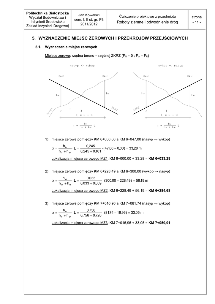 Politechnika Białostocka Wydział Budownictwa i Inżynierii Środowiska Zakład Inżynierii Drogowej Jan Kowalski sem. I, II st. gr. P3 2011/2012 Ćwiczenie projektowe z przedmiotu Roboty ziemne i odwodnienie dróg 5. WYZNACZENIE MIEJSC ZEROWYCH I PRZEKROJÓW PRZEJŚCIOWYCH 5.1. Wyznaczenie miejsc zerowych Miejsce zerowe: rzędna terenu = rzędnej ZKRZ (FN = 0 ; Fw = FR) · 1) miejsce zerowe pomiędzy KM 6+000,00 a KM 6+047,00 (nasyp → wykop) x= hn 0,245 ⋅L = ⋅ ( 47,00 − 0,00 ) = 33,28 m hn + h w 0,245 + 0,101 Lokalizacja miejsca zerowego MZ1: KM 6+000,00 + 33,28 = KM 6+033,28 2) miejsce zerowe pomiędzy KM 6+228,49 a KM 6+300,00 (wykop → nasyp) x= hw 0,033 ⋅L = ⋅ (300,00 − 228,49 ) = 56,19 m h w + hn 0,033 + 0,009 Lokalizacja miejsca zerowego MZ2: KM 6+228,49 + 56,19 = KM 6+284,68 3) miejsce zerowe pomiędzy KM 7+016,96 a KM 7+081,74 (nasyp → wykop) x= hn 0,756 ⋅L = ⋅ (81,74 − 16,96 ) = 33,05 m hn + h w 0,756 + 0,726 Lokalizacja miejsca zerowego MZ3: KM 7+016,96 + 33,05 = KM 7+050,01 · strona - 11 -
