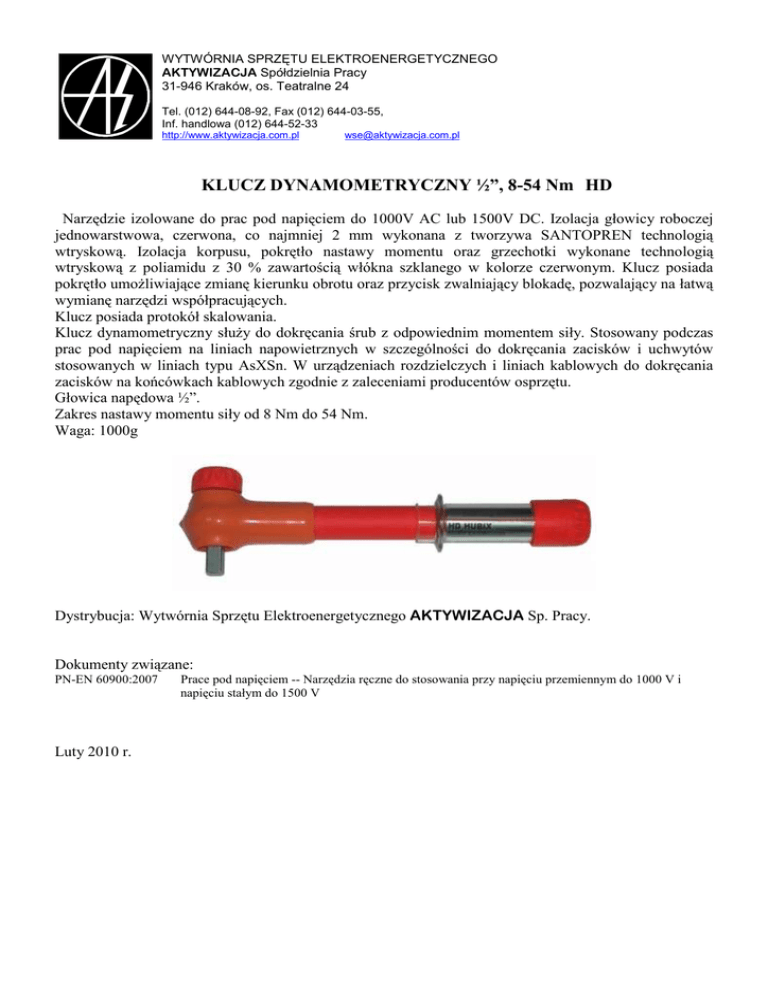 WYTWÓRNIA SPRZĘTU ELEKTROENERGETYCZNEGO AKTYWIZACJA Spółdzielnia Pracy 31-946 Kraków, os. Teatralne 24 Tel. (012) 644-08-92, Fax (012) 644-03-55, Inf. handlowa (012) 644-52-33 http://www.aktywizacja.com.pl [email protected] KLUCZ DYNAMOMETRYCZNY ½”, 8-54 Nm HD Narzędzie izolowane do prac pod napięciem do 1000V AC lub 1500V DC. Izolacja głowicy roboczej jednowarstwowa, czerwona, co najmniej 2 mm wykonana z tworzywa SANTOPREN technologią wtryskową. Izolacja korpusu, pokrętło nastawy momentu oraz grzechotki wykonane technologią wtryskową z poliamidu z 30 % zawartością włókna szklanego w kolorze czerwonym. Klucz posiada pokrętło umoŜliwiające zmianę kierunku obrotu oraz przycisk zwalniający blokadę, pozwalający na łatwą wymianę narzędzi współpracujących. Klucz posiada protokół skalowania. Klucz dynamometryczny słuŜy do dokręcania śrub z odpowiednim momentem siły. Stosowany podczas prac pod napięciem na liniach napowietrznych w szczególności do dokręcania zacisków i uchwytów stosowanych w liniach typu AsXSn. W urządzeniach rozdzielczych i liniach kablowych do dokręcania zacisków na końcówkach kablowych zgodnie z zaleceniami producentów osprzętu. Głowica napędowa ½”. Zakres nastawy momentu siły od 8 Nm do 54 Nm. Waga: 1000g Dystrybucja: Wytwórnia Sprzętu Elektroenergetycznego AKTYWIZACJA Sp. Pracy. Dokumenty związane: PN-EN 60900:2007 Prace pod napięciem -- Narzędzia ręczne do stosowania przy napięciu przemiennym do 1000 V i napięciu stałym do 1500 V Luty 2010 r. Wydanie V – waŜne od 08.2006r. 1