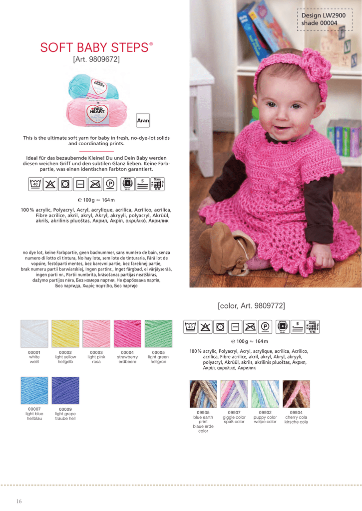 Design LW2900 shade 00004 SOft BABy StepS ® [Art. 9809672] This is the ultimate soft yarn for baby in fresh, no-dye-lot solids and coordinating prints. Ideal für das bezaubernde Kleine! Du und Dein Baby werden diesen weichen Griff und den subtilen Glanz lieben. Keine Farbpartie, was einen identischen Farbton garantiert. 100 g 164 m 100 % acrylic, Polyacryl, Acryl, acrylique, acrilica, Acrílico, acrílica, Fibre acrilice, akril, akryl, Akryl, akryyli, polyacryl, Akrüül, akrils, akrilinis pluoštas, Акрил, Акріл, ακρυλικό, Акрилик no dye lot, keine Farbpartie, geen badnummer, sans numéro de bain, senza numero di lotto di tintura, No hay lote, sem lote de tinturaria, Fără lot de vopsire, festőparti mentes, bez barevní partie, bez farebnej partie, brak numeru partii barwiarskiej, Ingen partinr., Inget färgbad, ei värjäyserää, ingen parti nr., Partii numbrita, krāsošanas partijas neatšķiras, dažymo partijos nėra, Без номера партии, Не фарбована партія, Без партида, ωρίς παρτίδα, Без партиjе [color, Art. 9809772] 100 g 164 m 16 00001 white weiß 00002 light yellow hellgelb 00007 light blue hellblau 00009 light grape traube hell 00003 light pink rosa 00004 strawberry erdbeere 00005 light green hellgrün 100 % acrylic, Polyacryl, Acryl, acrylique, acrilica, Acrílico, acrílica, Fibre acrilice, akril, akryl, Akryl, akryyli, polyacryl, Akrüül, akrils, akrilinis pluoštas, Акрил, Акріл, ακρυλικό, Акрилик 09935 blue earth print blaue erde color 09937 giggle color spaß color 09932 puppy color welpe color 09934 cherry cola kirsche cola