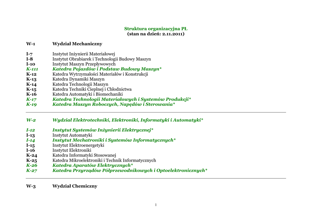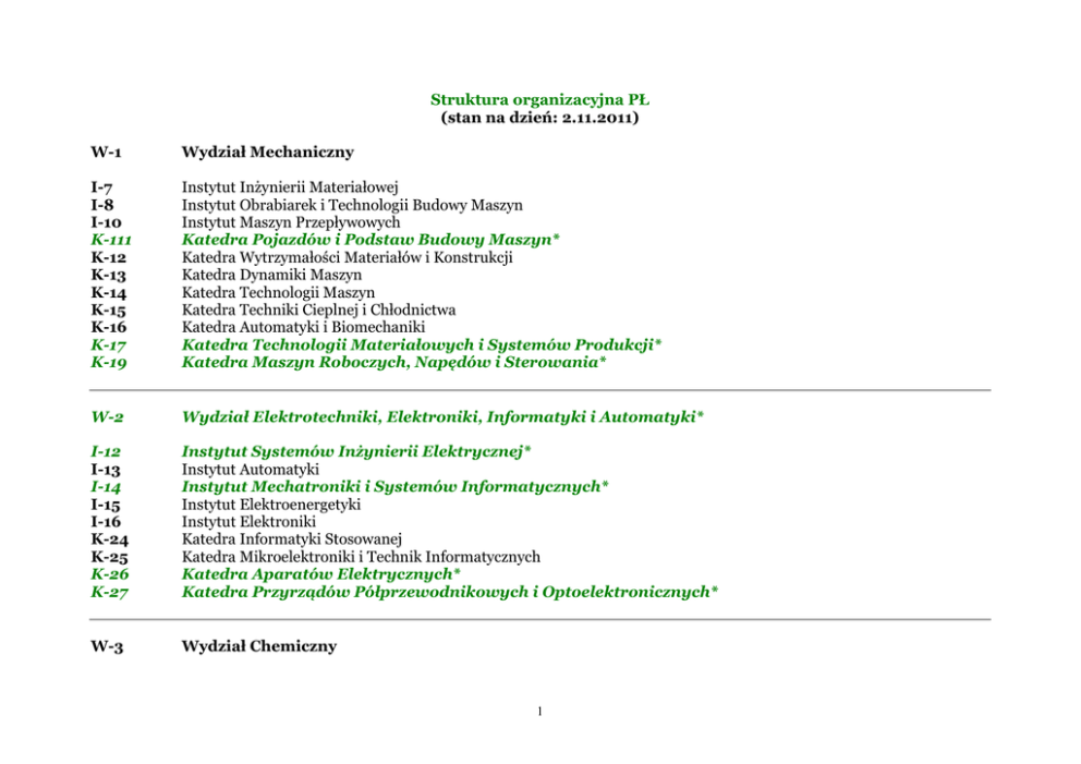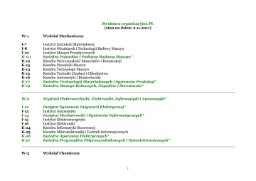 Struktura organizacyjna PŁ (stan na dzień: 2.11.2011) W-1 Wydział Mechaniczny I-7 I-8 I-10 K-111 K-12 K-13 K-14 K-15 K-16 K-17 K-19 Instytut Inżynierii Materiałowej Instytut Obrabiarek i Technologii Budowy Maszyn Instytut Maszyn Przepływowych Katedra Pojazdów i Podstaw Budowy Maszyn* Katedra Wytrzymałości Materiałów i Konstrukcji Katedra Dynamiki Maszyn Katedra Technologii Maszyn Katedra Techniki Cieplnej i Chłodnictwa Katedra Automatyki i Biomechaniki Katedra Technologii Materiałowych i Systemów Produkcji* Katedra Maszyn Roboczych, Napędów i Sterowania* W-2 Wydział Elektrotechniki, Elektroniki, Informatyki i Automatyki* I-12 I-13 I-14 I-15 I-16 K-24 K-25 K-26 K-27 Instytut Systemów Inżynierii Elektrycznej* Instytut Automatyki Instytut Mechatroniki i Systemów Informatycznych* Instytut Elektroenergetyki Instytut Elektroniki Katedra Informatyki Stosowanej Katedra Mikroelektroniki i Technik Informatycznych Katedra Aparatów Elektrycznych* Katedra Przyrządów Półprzewodnikowych i Optoelektronicznych* W-3 Wydział Chemiczny 1 I-17 I-18 I-19 I-20 K-32 Instytut Chemii Ogólnej i Ekologicznej Instytut Chemii Organicznej Międzyresortowy Instytut Techniki Radiacyjnej Instytut Technologii Polimerów i Barwników* Katedra Fizyki Molekularnej W-4 Wydział Technologii Materiałowych i Wzornictwa Tekstyliów* I-41 K-41 K-46 K-48 K-411 K-412 K-414 Instytut Architektury Tekstyliów* Katedra Włókien Sztucznych Katedra Dziewiarstwa* Katedra Materiałoznawstwa, Towaroznawstwa i Metrologii Włókienniczej* Katedra Mechaniki i Informatyki Technicznej* Katedra Mechaniki Maszyn Włókienniczych Katedra Odzieżownictwa i Tekstroniki* Université de la Mode = Studia Podyplomowe “Moda i Wzornictwo” W-5 Wydział Biotechnologii i Nauk o Żywności* I-28 I-29 I-30 I-31 Instytut Podstaw Chemii Żywności Instytut Biochemii Technicznej Instytut Chemicznej Technologii Żywności Instytut Technologii Fermentacji i Mikrobiologii W-6 Wydział Budownictwa, Architektury i Inżynierii Środowiska I-35 Instytut Architektury i Urbanistyki 2 I-611 K-61 K-62 K-63 K-65 K-66 K-67 K-68 Instytut Inżynierii Środowiska* Katedra Mechaniki Materiałów Katedra Fizyki Budowli i Materiałów Budowlanych Katedra Mechaniki Konstrukcji Katedra Budownictwa Betonowego Katedra Geotechniki i Budowli Inżynierskich Katedra Geodezji, Kartografii Środowiska i Geometrii Wykreślnej Katedra Techniki Ogrzewczej i Wentylacyjnej W-7 Wydział Fizyki Technicznej, Informatyki i Matematyki Stosowanej I-1 I-2 I-3 Instytut Informatyki Instytut Matematyki Instytut Fizyki W-9 Wydział Organizacji i Zarządzania I-910 K-91 K-94 K-95 K-99 Instytut Nauk Społecznych i Zarządzania Technologiami* Katedra Zarządzania* Katedra Zarządzania Produkcją i Logistyki* Katedra Integracji Europejskiej i Marketingu Międzynarodowego* Katedra Systemów Zarządzania i Innowacji* W-10 Wydział Inżynierii Procesowej i Ochrony Środowiska K-101 K-102 K-103 K-104 Katedra Aparatury Procesowej Katedra Inżynierii Chemicznej Katedra Inżynierii Bioprocesowej Katedra Systemów Inżynierii Środowiska 3 K-105 K-106 K-107 Katedra Procesów Cieplnych i Dyfuzyjnych Katedra Termodynamiki Procesowej Katedra Inżynierii Bezpieczeństwa Pracy* Jednostki pozawydziałowe PŁ B B B B B B Biblioteka Politechniki Łódzkiej* Biblioteka Budownictwa i Architektury Biblioteka Chemiczna Biblioteka Biotechnologii i Nauk o Żywności* Biblioteka Elektrotechniki Biblioteka Mechaniki CKU CMF Centrum Edukacji Ustawicznej Centrum Nauczania Matematyki i Fizyki* I-4 IFE Instytut Papiernictwa i Poligrafii Centrum Kształcenia Międzynarodowego Kolegium Gospodarki Przestrzennej* ŁUD Łódzki Uniwersytet Dziecięcy ODB Zamiejscowy Ośrodek Dydaktyczny w Bełchatowie Adres: Zespół Szkół Ponadgimnazjalnych nr 3 w Bełchatowie ul. Czapliniecka 96 97-400 Bełchatów ODO Zamiejscowy Ośrodek Dydaktyczny w Ostrowie Wielkopolskim 4 Adres: Zespół Szkół Technicznych ul. Poznańska 43 63-400 Ostrów Wielkopolski ODS Zamiejscowy Ośrodek Dydaktyczny w Sieradzu Adres: ul. Plac Wolności 3 98-200 Sieradz OZO Ośrodek Zapobiegania Zanieczyszczeniu Środowiska* Publiczne Liceum Ogólnokształcące PŁ* R RA RNK RNL RSN Administracja Rektorska Administracja Ogólna (AO symbol w bazie BIBLIO, symbol właściwy to RA) Centrum Komputerowe Centrum Diagnostyki i Terapii Laserowej – Niepubliczny Zakład Opieki Zdrowotnej* Biuro ds. Obsługi Osób Niepełnosprawnych* S-2 S-3 Studium Języków Obcych* Studium Wychowania Fizycznego i Sportu UTW Uniwersytet Trzeciego Wieku Politechniki Łódzkiej* 5 *Historia zmian w strukturze organizacyjnej PŁ od roku 2002: 2002 ROK 9 1 stycznia 2002 roku na Wydziale Inżynierii i Marketingu Tekstyliów połączono Katedrę Architektury Tekstyliów (K-043) z Katedrą Technologii i Budowy Tkanin (K-045 - istniejącą do 31 grudnia 2001 roku). Katedra powstała z połączenia tych dwóch nosi nazwę Katedry Architektury Tekstyliów o symbolu K-043. 9 Od 1 stycznia 2002 roku na Wydziale Inżynierii i Marketingu Tekstyliów Katedra Odzieżownictwa i Systemów Pomiarowych (K-047 – istniejąca do 31 grudnia 2001 roku) dzieli się na dwie katedry: Katedrę Odzieżownictwa o symbolu K-045 i Katedrę Automatyzacji Procesów Włókienniczych o symbolu K047. 9 1 lipca 2002 roku na Wydziale Organizacji i Zarządzania została utworzona nowa katedra o nazwie: Katedra Zarządzania Produkcją o symbolu K-094. 9 Od roku akademickiego 2002/2003 zmieniła się dotychczasowa nazwa Wydziału Chemii Spożywczej i Biotechnologii na Wydział Biotechnologii i Nauk o Żywności. 2003 ROK 9 Od 1 stycznia 2003 roku zmieniła się dotychczasowa nazwa Instytutu Maszyn Elektrycznych i Transformatorów (I-14) na Instytut Mechatroniki i Systemów Informatycznych. 9 1 października 2003 roku na Wydziale Mechanicznym został zniesiony Instytut Konstrukcji Maszyn o symbolu I-06. Na Wydziale Mechanicznym zostały utworzone 2 nowe katedry: Katedra Konstrukcji i Eksploatacji Maszyn o symbolu 