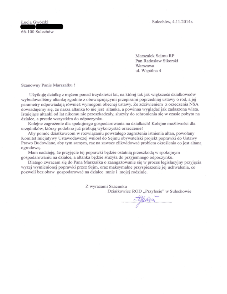 Sulechów, 4.11.20I4r. Łucja Gwóżdź Osiedle ZaciszegBll3 66-100 Sulechów Marszałek Sejmu RP pan Radosław sikorski Warszawa ul. Wspólna 4 Szanowny Panie Marszałku ! Ufikuję działkę zmężemponad trzydzieści lato na której tak jak większośćdziałkowców wybudowaliśmy altankę zgodnie z obowią7ującymi przepisami poprzedniej ustawy o rod, a jej parameĘ odpowiadająrówniez wymogom obecnej ustawy. Ze zdziwieniem z orzeczeniaNSA dowiadujemy się, że nasza altanka to nie jest altanka, a powinna wyglądaó jakzńaszona wiata. Istniejące altanki od lat nikomu nieprzeszkadzaĘ słuZyły do schronienia się w czasie pobytrr na dzińce, aprzede wszystkim do odpoczynku. Kolejne zagrożeńe dla spokojnego gospodarowania nadzińkach! Kolejne mozliwościdla urzędników, którzy podobno już próbuj ą wyk otzy s1oró orzeczenię|. Aby pomóc działkowcom w rozwi@aniu powstałego zagrożeńa istnienia altan, powołany Komitet Inicjatywy Ustawodawczej wniósł do Sejmu obywatelski projekt poprawki do Ustawy Prawo Budowlane, aby tym samym, raznazawszę zlikwidować problem określenia co jest altaną ogrodową. Mam nadzieję, że przyjęcie Ę poprawki będzie ostatniąprzeszkodąw spokojnym gospodarowani u na dzińce, a altanka będzie słuĘłado przyj emnego odpoczynku. Dlatego zv.łracam się do Pana Marszałka o zaangńowuie się w proce§ legislacyjny przyjęcia lłyżejwymienionej poprawki ptzez Sejm, oraz maksymalne przyspieszenie jej uchwalenia, co pozwoli bez obaw gospodarowaó nadziaŁcę mnie i mojej rodzinie. Zwyrazarli Szacunku Działkowiec ROD ,,Przylesie" w Sulechowie .-iAl l n ........:...%l&k ł// V