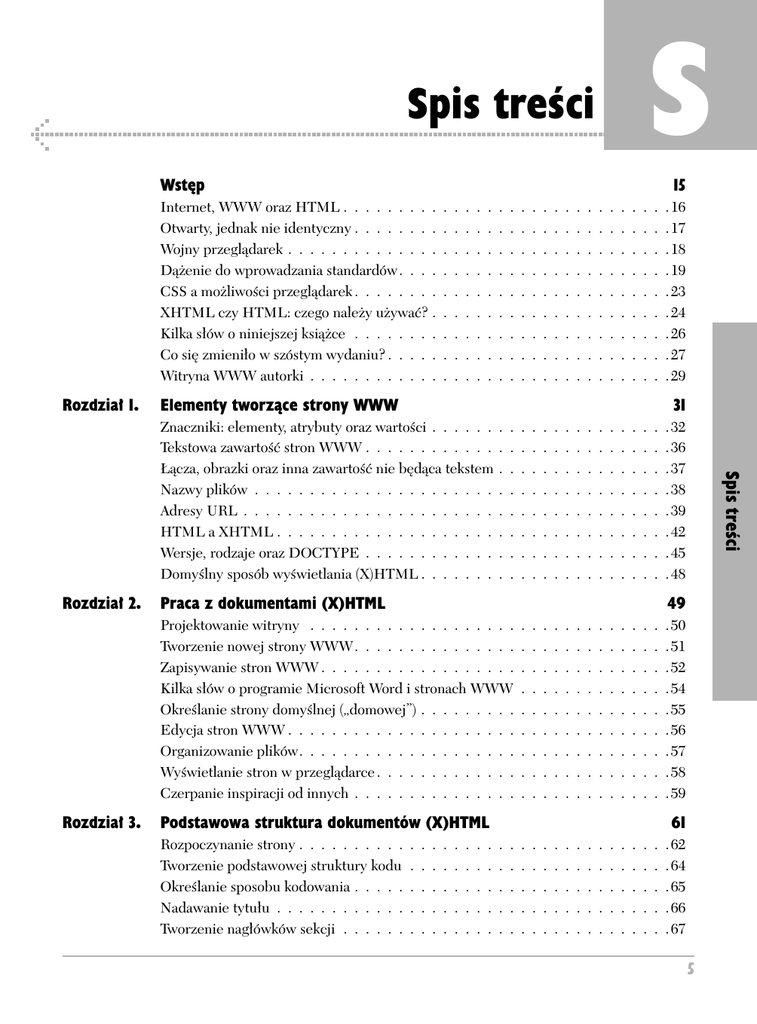 S Spis treści Wstęp 15 Internet, WWW oraz HTML . . . . . . . . . . . . . . . . . . . . . . . . . . . . . . Otwarty, jednak nie identyczny . . . . . . . . . . . . . . . . . . . . . . . . . . . . Wojny przeglądarek . . . . . . . . . . . . . . . . . . . . . . . . . . . . . . . . . . . Dążenie do wprowadzania standardów . . . . . . . . . . . . . . . . . . . . . . . . CSS a możliwości przeglądarek . . . . . . . . . . . . . . . . . . . . . . . . . . . . XHTML czy HTML: czego należy używać? . . . . . . . . . . . . . . . . . . . . . . Kilka słów o niniejszej książce . . . . . . . . . . . . . . . . . . . . . . . . . . . . . Co się zmieniło w szóstym wydaniu? . . . . . . . . . . . . . . . . . . . . . . . . . Witryna WWW autorki . . . . . . . . . . . . . . . . . . . . . . . . . . . . . . . . . Rozdział 1. Elementy tworzące strony WWW 16 17 18 19 23 24 26 27 29 31 Rozdział 2. Praca z dokumentami (X)HTML 49 Projektowanie witryny . . . . . . . . . . . . . . . . . . . . . . . . . . . . . . . . . Tworzenie nowej strony WWW . . . . . . . . . . . . . . . . . . . . . . . . . . . . Zapisywanie stron WWW . . . . . . . . . . . . . . . . . . . . . . . . . . . . . . . Kilka słów o programie Microsoft Word i stronach WWW . . . . . . . . . . . . . . Określanie strony domyślnej („domowej”) . . . . . . . . . . . . . . . . . . . . . . . Edycja stron WWW . . . . . . . . . . . . . . . . . . . . . . . . . . . . . . . . . . Organizowanie plików . . . . . . . . . . . . . . . . . . . . . . . . . . . . . . . . . Wyświetlanie stron w przeglądarce . . . . . . . . . . . . . . . . . . . . . . . . . . Czerpanie inspiracji od innych . . . . . . . . . . . . . . . . . . . . . . . . . . . . . Rozdział 3. Podstawowa struktura dokumentów (X)HTML Rozpoczynanie strony . . . . . . . . . . . Tworzenie podstawowej struktury kodu . Określanie sposobu kodowania . . . . . . Nadawanie tytułu . . . . . . . . . . . . . Tworzenie nagłówków sekcji . . . . . . . Spis treści Znaczniki: elementy, atrybuty oraz wartości . . . . . . . . . . . . . . . . . . . . . . 32 Tekstowa zawartość stron WWW . . . . . . . . . . . . . . . . . . . . . . . . . . . . 36 Łącza, obrazki oraz inna zawartość nie będąca tekstem . . . . . . . . . . . . . . . . 37 Nazwy plików . . . . . . . . . . . . . . . . . . . . . . . . . . . . . . . . . . . . . . 38 Adresy URL . . . . . . . . . . . . . . . . . . . . . . . . . . . . . . . . . . . . . . . 39 HTML a XHTML . . . . . . . . . . . . . . . . . . . . . . . . . . . . . . . . . . . . 42 Wersje, rodzaje oraz DOCTYPE . . . . . . . . . . . . . . . . . . . . . . . . . . . . 45 Domyślny sposób wyświetlania (X)HTML . . . . . . . . . . . . . . . . . . . . . . 48 . . . . . . . . . . . . . . . . . . . . . . . . . . . . . . . . . . . . . . . . 50 51 52 54 55 56 57 58 59 61 . . . . . . . . . . . . . . . . . . . . . . . . . . . . . . . . . . . . . . . . . . . . . . . . . . . . . . . . . . . . . . . . . . . . . . . . . . . 62 64 65 66 67 Spis treści Rozpoczynanie nowego akapitu . . . . . . . . . . . . . . . . . . . . . . . . . . . . Nazywanie elementów . . . . . . . . . . . . . . . . . . . . . . . . . . . . . . . . . Podział strony na działy . . . . . . . . . . . . . . . . . . . . . . . . . . . . . . . . . Tworzenie obszarów wewnątrzwierszowych . . . . . . . . . . . . . . . . . . . . . . Tworzenie nowych wierszy . . . . . . . . . . . . . . . . . . . . . . . . . . . . . . . Dodawanie komentarzy . . . . . . . . . . . . . . . . . . . . . . . . . . . . . . . . . Nadawanie nazw elementom stron . . . . . . . . . . . . . . . . . . . . . . . . . . . Rozdział 4. Podstawy formatowania tekstu Spis treści Tworzenie tekstu pogrubionego oraz kursywy . . . . . . . . . . . . . . . . . . . . . Zmiana wielkości tekstu . . . . . . . . . . . . . . . . . . . . . . . . . . . . . . . . Stosowanie czcionki o stałej szerokości znaków . . . . . . . . . . . . . . . . . . . . Stosowanie tekstu preformatowanego . . . . . . . . . . . . . . . . . . . . . . . . . Cytaty . . . . . . . . . . . . . . . . . . . . . . . . . . . . . . . . . . . . . . . . . . Tworzenie indeksów dolnych i górnych . . . . . . . . . . . . . . . . . . . . . . . . Oznaczanie zmodyfikowanego tekstu . . . . . . . . . . . . . . . . . . . . . . . . . Wyjaśnianie skrótów . . . . . . . . . . . . . . . . . . . . . . . . . . . . . . . . . . Wyśrodkowywanie zawartości strony . . . . . . . . . . . . . . . . . . . . . . . . . Rozdział 5. Obrazy 68 69 70 71 72 73 74 75 76 77 78 80 81 83 84 85 86 87 O obrazach tworzonych na potrzeby stron WWW . . . . . . . . . . . . . . . . . . 88 Zdobywanie obrazów . . . . . . . . . . . . . . . . . . . . . . . . . . . . . . . . . . 92 Wybór programu do edycji grafiki . . . . . . . . . . . . . . . . . . . . . . . . . . . 93 Polecenie Zapisz dla Weba . . . . . . . . . . . . . . . . . . . . . . . . . . . . . . . 94 Wstawianie ilustracji na stronę . . . . . . . . . . . . . . . . . . . . . . . . . . . . . 96 Tekst zastępczy . . . . . . . . . . . . . . . . . . . . . . . . . . . . . . . . . . . . . 97 Określanie wymiarów obrazu w celu jego szybszego wyświetlenia . . . . . . . . . . 99 Skalowanie ilustracji . . . . . . . . . . . . . . . . . . . . . . . . . . . . . . . . . . 101 Zmniejszanie wymiarów obrazu . . . . . . . . . . . . . . . . . . . . . . . . . . . 103 Otaczanie obrazów tekstem . . . . . . . . . . . . . . . . . . . . . . . . . . . . . . 105 Zakończenie otaczania tekstem . . . . . . . . . . . . . . . . . . . . . . . . . . . . 107 Zwiększanie odstępu wokół obrazów . . . . . . . . . . . . . . . . . . . . . . . . . 108 Wyrównywanie obrazków . . . . . . . . . . . . . . . . . . . . . . . . . . . . . . . 109 Poziome linie . . . . . . . . . . . . . . . . . . . . . . . . . . . . . . . . . . . . . . 110 Dodawanie ikony witryny . . . . . . . . . . . . . . . . . . . . . . . . . . . . . . . 111 Rozdział 6. Łącza Tworzenie łączy do innych stron . . . . . . . . . . . . . . . . . . . . . . . . . . . 