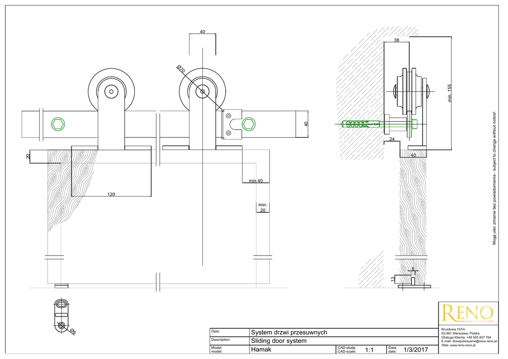 40 38 24 20 40 min 40 120 min. 20 Mogą ulec zmianie bez powiadomienia - subject to change without notice! 40 min. 155 Ø 70 13 6 Ø6 Opis: Description: Model: model: System drzwi przesuwnych Sliding door system Hamak CAD-skalę: CAD-scale: 1:1 Data: date: 1/3/2017 Bruzdowa 107m 02-991 Warszawa, Polska Obsługa Klienta: +48 505 837 764 E-mail: [email protected] Web: www.reno-reno.pl