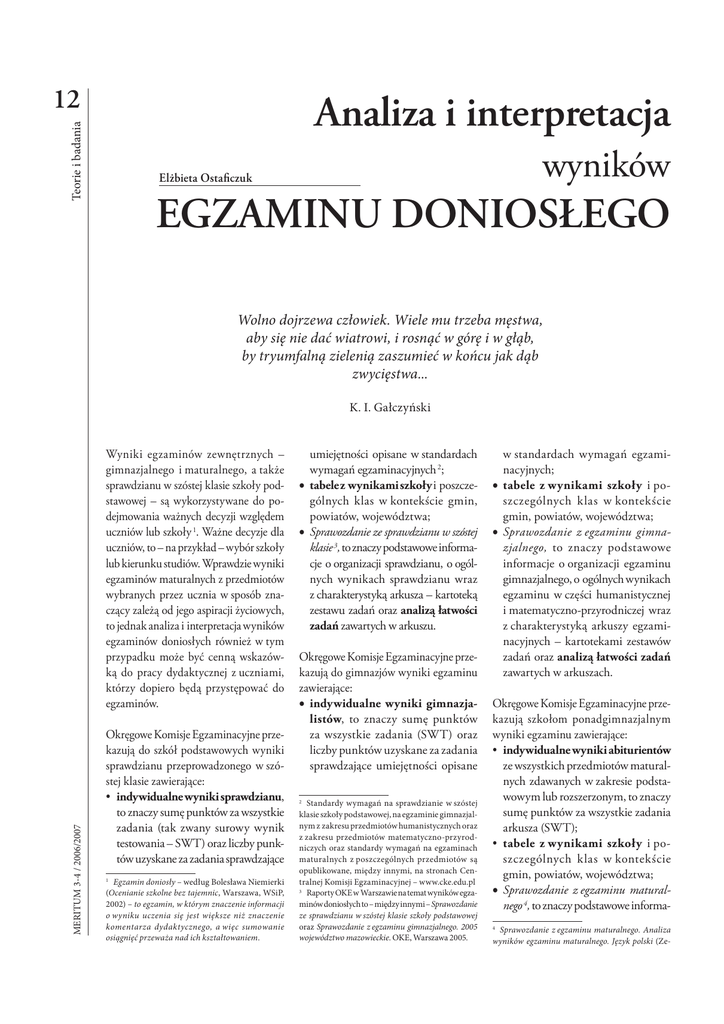 12 Teorie i badania Analiza i interpretacja wyników Elżbieta Ostaficzuk EGZAMINU DONIOSŁEGO Wolno dojrzewa człowiek. Wiele mu trzeba męstwa, aby się nie dać wiatrowi, i rosnąć w górę i w głąb, by tryumfalną zielenią zaszumieć w końcu jak dąb zwycięstwa... K. I. Gałczyński MERITUM 3-4 / 2006/2007 Wyniki egzaminów zewnętrznych – gimnazjalnego i maturalnego, a także sprawdzianu w szóstej klasie szkoły podstawowej – są wykorzystywane do podejmowania ważnych decyzji względem uczniów lub szkoły 1. Ważne decyzje dla uczniów, to – na przykład – wybór szkoły lub kierunku studiów. Wprawdzie wyniki egzaminów maturalnych z przedmiotów wybranych przez ucznia w sposób znaczący zależą od jego aspiracji życiowych, to jednak analiza i interpretacja wyników egzaminów doniosłych również w tym przypadku może być cenną wskazówką do pracy dydaktycznej z uczniami, którzy dopiero będą przystępować do egzaminów. Okręgowe Komisje Egzaminacyjne przekazują do szkół podstawowych wyniki sprawdzianu przeprowadzonego w szóstej klasie zawierające: • indywidualne wyniki sprawdzianu, to znaczy sumę punktów za wszystkie zadania (tak zwany surowy wynik testowania – SWT) oraz liczby punktów uzyskane za zadania sprawdzające Egzamin doniosły – według Bolesława Niemierki (Ocenianie szkolne bez tajemnic, Warszawa, WSiP, 2002) – to egzamin, w którym znaczenie informacji o wyniku uczenia się jest większe niż znaczenie komentarza dydaktycznego, a więc sumowanie osiągnięć przeważa nad ich kształtowaniem. umiejętności opisane w standardach wymagań egzaminacyjnych 2; • tabele z wynikami szkoły i poszczególnych klas w kontekście gmin, powiatów, województwa; • Sprawozdanie ze sprawdzianu w szóstej klasie 3, to znaczy podstawowe informacje o organizacji sprawdzianu, o ogólnych wynikach sprawdzianu wraz z charakterystyką arkusza – kartoteką zestawu zadań oraz analizą łatwości zadań zawartych w arkuszu. Okręgowe Komisje Egzaminacyjne przekazują do gimnazjów wyniki egzaminu zawierające: • indywidualne wyniki gimnazjalistów, to znaczy sumę punktów za wszystkie zadania (SWT) oraz liczby punktów uzyskane za zadania sprawdzające umiejętności opisane Standardy wymagań na sprawdzianie w szóstej klasie szkoły podstawowej, na egzaminie gimnazjalnym z zakresu przedmiotów humanistycznych oraz z zakresu przedmiotów matematyczno-przyrodniczych oraz standardy wymagań na egzaminach maturalnych z poszczególnych przedmiotów są opublikowane, między innymi, na stronach Centralnej Komisji Egzaminacyjnej – www.cke.edu.pl Raporty OKE w Warszawie na temat wyników egzaminów doniosłych to – między innymi – Sprawozdanie ze sprawdzianu w szóstej klasie szkoły podstawowej oraz Sprawozdanie z egzaminu gimnazjalnego. 2005 województwo mazowieckie. OKE, Warszawa 2005. w standardach wymagań egzaminacyjnych; • tabele z wynikami szkoły i poszczególnych klas w kontekście gmin, powiatów, województwa; • Sprawozdanie z egzaminu gimnazjalnego, to znaczy podstawowe informacje o organizacji egzaminu gimnazjalnego, o ogólnych wynikach egzaminu w części humanistycznej i matematyczno-przyrodniczej wraz z charakterystyką arkuszy egzaminacyjnych – kartotekami zestawów zadań oraz analizą łatwości zadań zawartych w arkuszach. Okręgowe Komisje Egzaminacyjne przekazują szkołom ponadgimnazjalnym wyniki egzaminu zawierające: • indywidualne wyniki abiturientów ze wszystkich przedmiotów maturalnych zdawanych w zakresie podstawowym lub rozszerzonym, to znaczy sumę punktów za wszystkie zadania arkusza (SWT); • tabele z wynikami szkoły i poszczególnych klas w kontekście gmin, powiatów, województwa; • Sprawozdanie z egzaminu maturalnego 4, to znaczy podstawowe informa Sprawozdanie z egzaminu maturalnego. Analiza wyników egzaminu maturalnego. Język polski (Ze W prezentowanym artykule – w celu ułatwienia wydobycia interesujących informacji i pełniejszego wykorzystania wyników egzaminów – podjęto próbę przedstawienia podstawowych pojęć statystycznych. W części pierwszej, poświęconej analizie indywidualnych wyników egzaminacyjnych, przedstawiono różne sposoby prezentacji danych empirycznych (1.1) oraz opisu ich struktury, a mianowicie – miary tendencji centralnej (1.2), a także miary rozproszenia (1.3). Część druga jest poświęcona interpretacji wyników egzaminu zewnętrznego, w tym interpretacji wyników pod kątem poziomu kompetencji egzaminowanego zespołu uczniów (2.1). Prognozowanie rozwoju uczniów, na podstawie wyników egzaminów zewnętrznych, stanowi kolejne ważne wyzwanie badawcze stojące przed środowiskiem oświatowym 5. szyt 1); Języki obce (Zeszyt 2); Historia, Historia sztuki, Historia muzyki, Wiedza o społeczeństwie, Wiedza o tańcu (Zeszyt 3); Matematyka, Fizyka i astronomia, Informatyka (Zeszyt 4); Biologia, Chemia, Geografia (Zeszyt 5). 2005 województwo mazowieckie. OKE Warszawa 2005. W niniejszym numerze „Meritum” opisany został polski projekt badawczy nad edukacyjną wartością 1.1. Prezentacja danych empirycznych Zbieranie, klasyfikowanie, opis oraz interpretacja danych uzyskiwanych w badaniach sondażowych oraz eksperymentalnych stanowią główne zagadnienia, którymi zajmuje się statystyka opisowa 6 . Teorie i badania Bezpośrednie rozpatrywanie nieusystematyzowanych w żaden sposób wyników egzaminów zewnętrznych nie jest działaniem ani sensownym, ani nawet możliwym. Konieczna jest klasyfikacja, opis i zastosowanie reguł prawomocnego wnioskowania. Statystyka – dziedzina wiedzy zajmująca się właśnie zbieraniem, klasyfikowaniem, opisem oraz interpretacją danych uzyskiwanych w badaniach eksperymentalnych – dostarcza odpowiedniego warsztatu pojęciowego i praktycznej metodologii. Dzięki temu statystyka umożliwia poznanie bogactwa informacji zawartych w wynikach egzaminów zewnętrznych. Jest to dziedzina wiedzy może trudn