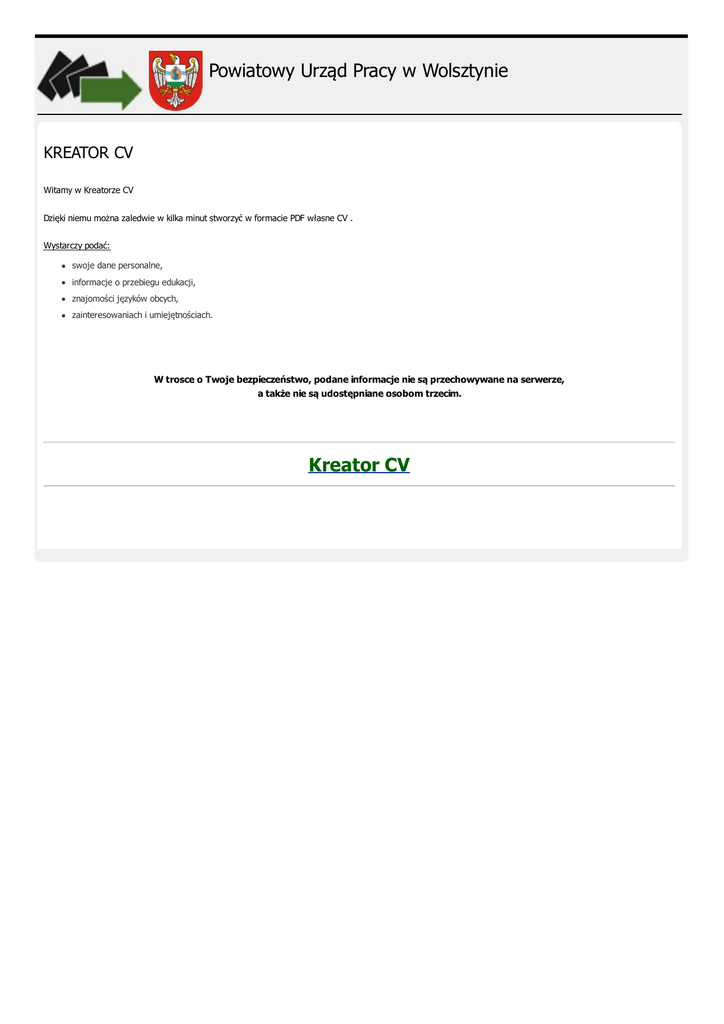Powiatowy Urząd Pracy w Wolsztynie KREATOR CV Witamy w Kreatorze CV Dzięki niemu można zaledwie w kilka minut stworzyć w formacie PDF własne CV . Wystarczy podać: swoje dane personalne, informacje o przebiegu edukacji, znajomości języków obcych, zainteresowaniach i umiejętnościach. W trosce o Twoje bezpieczeństwo, podane informacje nie są przechowywane na serwerze, a także nie są udostępniane osobom trzecim. Kreator CV