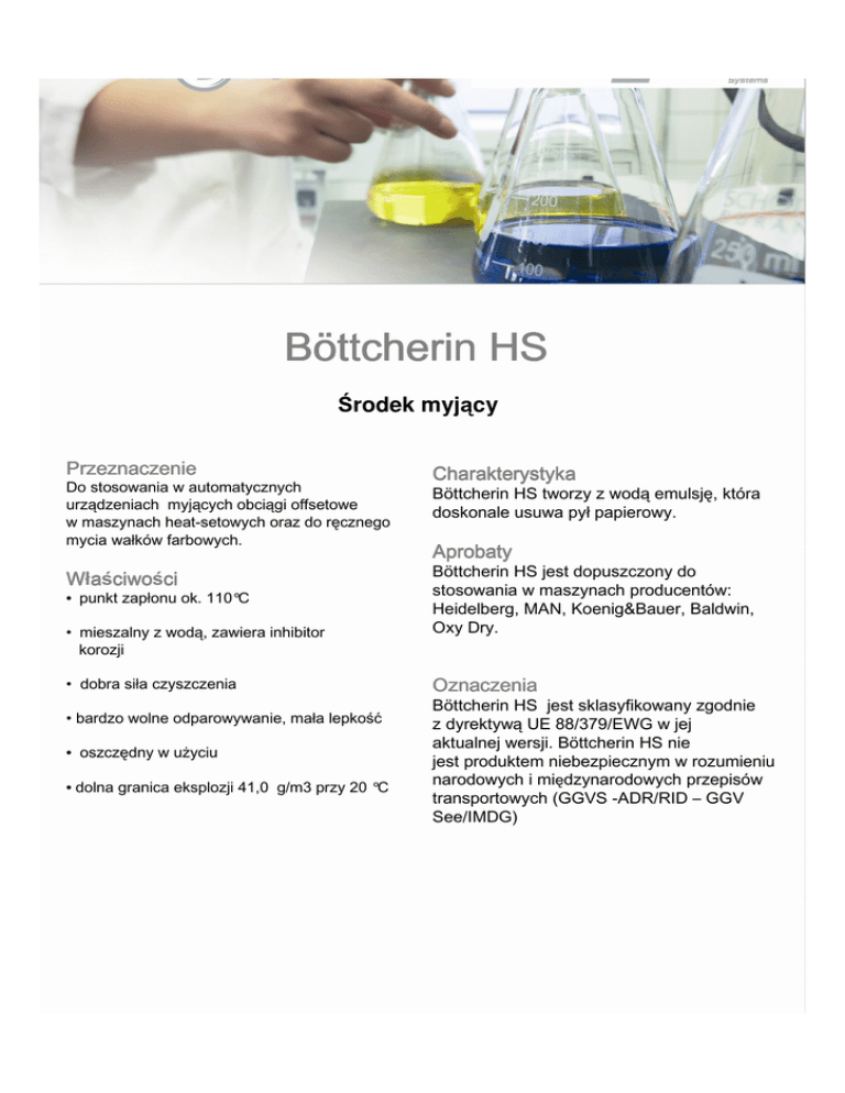 Böttcherin HS Środek myjący Przeznaczenie Charakterystyka Do stosowania w automatycznych urządzeniach myjących obciągi offsetowe w maszynach heat-setowych oraz do ręcznego mycia wałków farbowych. Böttcherin HS tworzy z wodą emulsję, która doskonale usuwa pył papierowy. Wła aściwo ciwości ciwo ci Böttcherin HS jest dopuszczony do stosowania w maszynach producentów: Heidelberg, MAN, Koenig&Bauer, Baldwin, Oxy Dry. • punkt zapłonu ok. 110°C • mieszalny z wodą, zawiera inhibitor korozji • dobra siła czyszczenia • bardzo wolne odparowywanie, mała lepkość • oszczędny w użyciu • dolna granica eksplozji 41,0 g/m3 przy 20 °C Aprobaty Oznaczenia Böttcherin HS jest sklasyfikowany zgodnie z dyrektywą UE 88/379/EWG w jej aktualnej wersji. Böttcherin HS nie jest produktem niebezpiecznym w rozumieniu narodowych i międzynarodowych przepisów transportowych (GGVS -ADR/RID – GGV See/IMDG)
