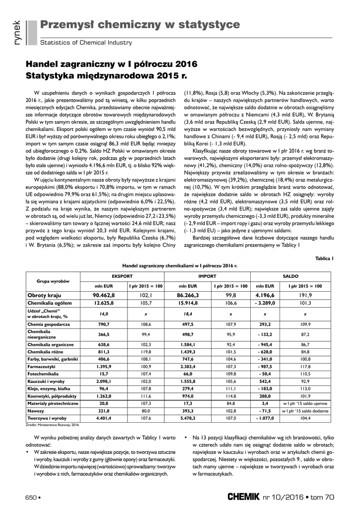 rynek Przemysł chemiczny w statystyce Statistics of Chemical Industry Handel zagraniczny w I półroczu 2016 Statystyka międzynarodowa 2015 r. W uzupełnieniu danych o wynikach gospodarczych I półrocza 2016 r., jakie prezentowaliśmy pod tą winietą, w kilku poprzednich miesięcznych edycjach Chemika, przedstawiamy obecnie najważniejsze informacje dotyczące obrotów towarowych międzynarodowych Polski w tym samym okresie, ze szczególnym uwzględnieniem handlu chemikaliami. Eksport polski ogółem w tym czasie wyniósł 90,5 mld EUR i był wyższy od porównywalnego okresu roku ubiegłego o 2,1%; import w tym samym czasie osiągnął 86,3 mld EUR będąc mniejszy od ubiegłorocznego o 0,2%. Saldo HZ Polski w omawianym okresie było dodatnie (drugi kolejny rok, podczas gdy w poprzednich latach było stale ujemne) i wyniosło 4.196,6 mln EUR, tj. o blisko 92% większe od dodatniego salda w I płr 2015 r. W ujęciu kontynentalnym nasze obroty były najwyższe z krajami europejskimi (88,0% eksportu i 70,8% importu, w tym w ramach UE odpowiednio 79,9% oraz 61,5%); na drugim miejscu uplasowała się wymiana z krajami azjatyckimi (odpowiednio 6,0% i 22,5%). Z podziału na kraje wynika, że naszym największym partnerem w obrotach są, od wielu już lat, Niemcy (odpowiednio 27,2 i 23,5%) – skierowaliśmy tam towary o łącznej wartości 24,6 mld EUR; nasz przywóz z tego kraju wyniósł 20,3 mld EUR. Kolejnymi krajami, pod względem wielkości eksportu, były Republika Czeska (6,7%) i W. Brytania (6,5%); w zakresie zaś importu były kolejno Chiny (11,8%), Rosja (5,8) oraz Włochy (5,3%). Na zakończenie przeglądu krajów – naszych największych partnerów handlowych, warto odnotować, że największe saldo dodatnie w obrotach osiągnęliśmy w omawianym półroczu z Niemcami (4,3 mld EUR), W. Brytanią (3,6 mld oraz Republiką Czeską (2,9 mld EUR). Salda ujemne, najwyższe w wartościach bezwzględnych, przyniosły nam wymiany handlowe z Chinami (- 9,4 mld EUR), Rosją (- 2,5 mld) oraz Republiką Korei (- 1,3 mld EUR). Klasyfikując nasze obroty towarowe w I płr 2016 r. wg branż towarowych, największymi eksporterami były: przemysł elektromaszynowy (41,2%), chemiczny (14,0%) oraz rolno-spożywczy (12,8%). Największy przywóz zrealizowaliśmy w tym okresie w branżach: elektromaszynowej (39,2%), chemicznej (18,4%) oraz metalurgicznej (10,7%). W tym krótkim przeglądzie branż warto odnotować, że największe dodatnie saldo w obrotach HZ osiągnęły: wyroby różne (4,2 mld EUR), elektromaszynowe (3,5 mld EUR) oraz rolno-spożywcze (3,4 mld EUR); największe zaś saldo ujemne zajęły wyroby przemysłu chemicznego (-3,3 mld EUR), produkty mineralne (- 2,9 mld EUR – import ropy i gazu) oraz wyroby przemysłu lekkiego (- 1,3 mld EU) – jako jedyne z ujemnymi saldami. Bardziej szczegółowe dane liczbowe dotyczące naszego handlu zagranicznego chemikaliami prezentujemy w Tablicy 1 Tablica 1 Handel zagraniczny chemikaliami w I półroczu 2016 r. Grupa wyrobów EKSPORT IMPORT mln EUR I płr 2015 = 100 mln EUR Obroty kraju 90.462,8 102,1 86.266,3 Chemikalia ogółem 12.625,8 105,7 15.914,8 Udział „Chemii” w obrotach kraju, % 14,0 x 18,4 Chemia gospodarcza 790,7 108,6 Chemikalia nieorganiczne 366,5 Chemikalia organiczne Chemikalia różne Farby, barwniki, garbniki Farmaceutyki Fotochemikalia Kauczuki i wyroby Kleje, enzymy, białka SALDO I płr 2015 = 100 mln EUR I płr 2015 = 100 99,8 4.196,6 191,9 106,6 - 3.289,0 101,3 x x x 497,5 107,9 293,2 109,9 99,4 498,7 95,9 - 132,2 87,2 638,6 102,3 1.584,1 92,4 - 945,4 86,7 811,3 119,8 1.439,3 101,5 - 628,0 84,8 406,6 108,1 747,6 104,6 - 341,0 100,8 1.395,9 100,9 2.383,4 107,3 - 987,5 117,8 15,7 107,4 66,0 109,8 - 50,4 110,5 2.098,1 102,0 1.555,8 105,6 542,4 92,9 96,4 107,8 279,4 111,1 - 183,0 113,0 Kosmetyki, półprodukty 1.262,0 111,6 974,0 114,8 288,0 101,9 Materiały pirotechniczne 20,8 107,3 17,3 84,8 3,4 w I płr ‘15 saldo ujemne Nawozy Tworzywa i wyroby 321,8 80,0 393,3 102,8 - 71,5 w I płr ‘15 saldo dodatnie 4.401,4 107,6 5.478,3 107,0 - 1.077,0 104,4 Źródło: Ministerstwo Rozwoju 2016 W wyniku pobieżnej analizy danych zawartych w Tablicy 1 warto odnotować: • W zakresie eksportu, nasze największe pozycje, to tworzywa sztuczne i wyroby, kauczuk i wyroby z gumy (głównie opony) oraz farmaceutyki. W dziedzinie importu najwięcej (wartościowo) sprowadzamy: tworzyw i wyrobów z nich, farmaceutyków oraz chemikaliów organicznych. 650 • • Na 13 pozycji klasyfikacji chemikaliów wg ich branżowości, tylko w czterech udało nam się osiągnąć dodatnie saldo w obrotach; największe w kauczuku i wyrobach oraz w artykułach chemii gospodarczej. Niestety w większości, pozostałych 9., saldo w obrotach mamy ujemne – największe w tworzywach i wyrobach oraz w farmaceutykach. nr 10/2016 • tom 70 *** Główny Urząd Statystyczny opublikował niedawno opracowanie pt. „Sytuacja makroekonomiczna w Polsce na tle procesów w gospodarce światowej w 2015 r.” Z interesującego materiału wybraliśmy dla naszych Czytelników szereg informacji, które w skrócie prezentujemy poniżej. Przytaczamy głównie dane dotyczące sytuacji międzynarodowej, bowiem informacje tego typu nt. sytuacji krajowej niejednokrotnie prezentowaliśmy pod tą winietą, w poprzednich miesiącach: • Gospodarka światowa w minionym roku, mierzona rocznym wzrostem PKB (produktu krajowego brutto) wobec roku poprzedniego, rozwijała się w tempie 3,1% – było to o 0,3 pkt.% wolniej niż w roku poprzednim (3,4%). Tempo to było jednak dość nierównomierne w poszczególnych najważniejszych gospodarczych regionach świata. Znacząco poprawiła się sytuacja w Unii Europejskiej (zmiana wskaźnika wzrostu PKB z 0,9 w 2014 r. do 1,6% w minionym roku); określoną stabilność wykazała gospodarka USA – od lat wskaźnik wzrostu PKB powyżej 2%; natomiast w Chinach, mimo nadal wysokiego wskaźnika wzrostu PKB, jego poziom od kilku lat obniża s