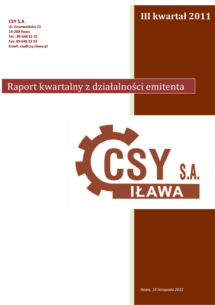 CSY S.A. III kwartał 2011 Ul. Grunwaldzka 13 14-200 Iława Tel.: 89 648 21 31 Fax: 89 648 23 32 Email: [email protected] Raport kwartalny z działalności emitenta Iława, 14 listopada 2011 Raport kwartalny z działalności emitenta – III kwartał 2011 SPIS TREŚCI: I. Wybrane dane finansowe II. Istotne czynniki mające wpływ na osiągnięte wyniki finansowe Spółki III. Stopień realizacji strategii w obszarze rozwoju prowadzonej działalności w szczególności poprzez podejmowane działania innowacyjne w przedsiębiorstwie. IV. Plany i przewidywania na kolejny kwartał. 2 Raport kwartalny z działalności emitenta – III kwartał 2011 I. Wybrane dane finansowe WYBRANE DANE FINANSOWE 1. 2. 3. 4. 5. 6. 7. 8. 9. [w zł] 2 736 211,38 2 863 603,48 -127 392,10 -60 646,17 62 925,30 19 523,89 191 740,56 -232 862,84 -205 502,84 Przychody netto ze sprzedaży Koszty sprzedanych produktów Zysk/strata ze sprzedaży Zysk/ strata na działalności operacyjnej Amortyzacja Przychody finansowe Koszty finansowe Zysk/strata brutto Zysk/strata netto Stan na dzień 1. 2. 3. 4. 5. 6. 7. 8. 9. 10. 11. 12. III kwartał 2011 /okres od 01-07-2011 do 30-09-2011/ Aktywa trwałe Rzeczowe aktywa trwałe Należności długoterminowe Inwestycje długoterminowe Aktywa obrotowe Należności krótkoterminowe Inwestycje krótkoterminowe Środki pieniężne i inne aktywa pieniężne Kapitał własny Kapitał zakładowy Zobowiązania długoterminowe Zobowiązania krótkoterminowe 30.09.2011 31.12.2010 [w zł] [w zł] 7 789 706,49 2 803 634,65 0,00 4 970 549,84 4 400 564,20 2 594 912,66 365 400,00 42 921,54 7 358 068,43 7 200 000,00 1 796 015,31 3 036 186,95 3 7 788 596,27 2 801 547,43 0,00 4 970 549,84 4 388 223,01 2 056 163,55 718 200,00 38 034,61 7 339 623,39 7 200 000,00 1 378 958,13 3 458 237,76 III kwartał 2010 /okres od 01-07-2010 do 30-09-2010/ [w zł] 2 477 753,76 2 445 219,79 32 533,97 38 382,58 40 340,90 -457 513,89 9 269,77 -428 401,08 -341 532,08 30.09.2010 8 053 362,41 2 532 360,41 0,00 5 503 000,00 3 573 303,08 2 113 700,70 0,00 50 465,34 5 685 284,66 4 940 000,00 1 365 588,01 4 575 792,82 Raport kwartalny z działalności emitenta – III kwartał 2011 II. Istotne czynniki mające wpływ na osiągnięte wyniki finansowe Spółki Na wyniki finansowe osiągnięte przez spółkę w trzecim kwartale 2011r. miały wpływ systematyczne przychody ze sprzedaży wyrobów i usług stanowiących podstawową działalność spółki tj.: 1. produkcja części i akcesoriów do pojazdów silnikowych 2. obróbka metali i nakładanie powłok na metale 3. sprzedaż hurtowa i detaliczna części i akcesoriów do pojazdów silnikowych 4. produkcja konstrukcji stalowych i ich części. W trzecim kwartale spółka odnotowała 10% wzrost przychodów ze sprzedaży w porównaniu do analogicznego okresu roku ubiegłego. Przychody netto ze sprzedaży w kolejnych miesiącach kwartału kształtowały się następująco: Lipiec 2011 965 tys. zł Sierpień 2011 726 tys. zł Wrzesień 2011 1 045 tys. zł W trzecim kwartale 2011r. Spółka CSY S.A. odnotowała ujemny wynik na działalności operacyjnej w kwocie 60,6 tys. zł, natomiast wynik netto wyniósł 205,5 tys. zł straty. Na wynik finansowy netto wpłynęła głównie aktualizacja wartości posiadanych akcji o kodzie KDPW (ISIN) PLRSYSA00014. 4 Raport kwartalny z działalności emitenta – III kwartał 2011 III. Stopień realizacji strategii w obszarze rozwoju prowadzonej działalności w szczególności poprzez podejmowane działania innowacyjne w przedsiębiorstwie. Zarząd CSY S.A. realizował przyjęte przez Spółkę założenia określone w strategii i polityce rozwoju. Spółka sukcesywnie rozszerza obszar swojej działalności na rynku krajowym poprzez pozyskiwanie nowych klientów i koncentrację na produkcji wysoko rentownych wyrobów. Znacznie zwiększa się też udział na rynku zachodnim poprzez sprzedaż części i komponentów do maszyn i urządzeń budowlanych oraz drogowych. Spółka zmierza do końcowego rozliczenia wydatków poniesionych w ramach projektu „Wzrost innowacyjności Iławskich Zakładów Części Samochodowych Sp. z o.o.” współfinansowanego z Europejskiego Funduszu Rozwoju Regionalnego w ramach Regionalnego Programu Operacyjnego Warmia i Mazury na lata 2007-2013. Wypłata dotacji w kwocie 479 tys. zł spodziewana jest w IV kwartale br. po uzyskaniu pozytywnego wyniku kontroli Warmińsko-Mazurskiej Agencji Rozwoju Regionalnego S.A. w Olsztynie w zakresie poprawnej realizacji w/w projektu. Zakupione w ramach projektu obrabiarki sterowane numerycznie realizują założone zadania produkcyjne, dając możliwość produkowania skomplikowanych i precyzyjnych wyrobów o wysokiej jakości. Kontynuując działalność mającą na celu wzrost konkurencyjności Spółka poczyniła kroki w celu zakupienia kolejnego (trzeciego w ciągu ostatnich czterech lat) centrum frezarsko-wiertarskiego, które zapewni możliwość kompleksowej i terminowej obsługi zamówień na wyroby w szczególności przeznaczone do maszyn budowlanych i drogowych na rynek francuski wymagający od Spółki coraz lepszej jakości wyrobów w niewygórowanych cenach. 5 Raport kwartalny z działalności emitenta – III kwartał 2011 IV. Plany i przewidywania na kolejny kwartał W kolejnym kwartale CSY S.A. dzięki współpracy z rynkiem francuskim planuje uruchomić produkcję kolejnych wyrobów do maszyn budowlanych i drogowych. Bazując na zamówieniach otrzymanych od francuskiego kontrahenta w III kwartale przewidujemy, że w IV kwartale osiągniemy sprzedaż dla naszego czołowego kontrahenta na poziomie sprzedaży za trzy kwartały br. łącznie. Kładąc nacisk na umacnianie pozycji CSY S.A. na rynku producentów części zamiennych do pojazdów użytkowych produkcji zachodniej nieustannie rozwijamy współpracę z największymi krajowymi dystrybutorami tych części poszerzając asortyment o kolejne produkty. W IV kwartale br. Spółka zamierza również sfinalizować zak