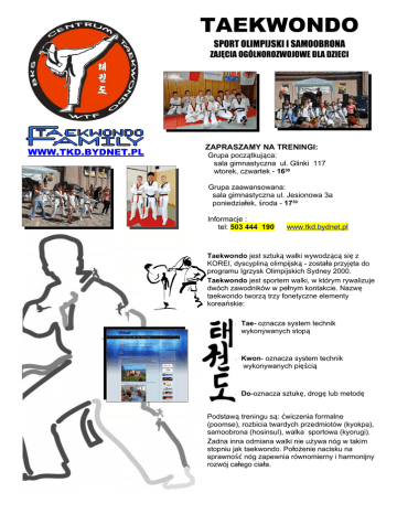 TAEKWONDO SPORT OLIMPIJSKI I SAMOOBRONA ZAJĘCIA OGÓLNOROZWOJOWE DLA DZIECI WWW.TKD.BYDNET.PL ZAPRASZAMY NA TRENINGI: Grupa początkująca: sala gimnastyczna ul. Glinki 117 wtorek, czwartek - 1630 Grupa zaawansowana: sala gimnastyczna ul. Jesionowa 3a poniedziałek, środa - 1730 Informacje : tel: 503 444 190 www.tkd.bydnet.pl Taekwondo jest sztuką walki wywodzącą się z KOREI, dyscypliną olimpijską - została przyjęta do programu Igrzysk Olimpijskich Sydney 2000. Taekwondo jest sportem walki, w którym rywalizuje dwóch zawodników w pełnym kontakcie. Nazwę taekwondo tworzą trzy fonetyczne elementy koreańskie: • Tae- oznacza system technik wykonywanych stopą • Kwon- oznacza system technik wykonywanych pięścią • Do-oznacza sztukę, drogę lub metodę Podstawą treningu są: ćwiczenia formalne (poomse), rozbicia twardych przedmiotów (kyokpa), samoobrona (hosinsul), walka sportowa (kyorugi). Żadna inna odmiana walki nie używa nóg w takim stopniu jak taekwondo. Położenie nacisku na sprawność nóg zapewnia równomierny i harmonijny rozwój całego ciała.