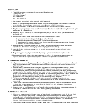 I. REGULAMIN 1. Właścicielem strony projektlato.pl, zwanej dalej Serwisem, jest Agencja JeyJey Ul. Daszyńskiego 7 61-415 Poznań NIP: 783-158-56-79 1. Serwis służy zamawianiu usług zwanych dalej Atrakcjami. 2. Usługi są wykonywane przez Agencję JeyJey lub przez osoby fizyczne lub prawne oraz jednostki organizacyjne nieposiadające osobowości prawnej zwane dalej Wykonawcami. 3. Osoba zamawiająca Atrakcje za pośrednictwem Serwisu będzie dalej nazywana Klientem. 4. Użytkownik, przeglądający treści zawarte na stronach Serwisu ma możliwość ich wydrukowania tylko i wyłącznie na użytek własny. 5. Logotypy, zdjęcia oraz opisy są własnością poszczególnych firm i nie mogą być użyte do celów komercyjnych. 6. Adres e-mail Klienta może zostać wykorzystany do następujących celów: przesłanie wiadomości potwierdzającej zakup Atrakcji. przesłanie wiadomości zawierającej kupon na ofertę specjalną powiadomień o nowych ofertach oraz ofertach specjalnych zamieszczonych w Serwisie kontaktu z Administratorem Serwisu. 7. Agencja JeyJey zastrzega sobie prawo do zmiany cen usług znajdujących się w ofercie bez uprzedzenia. Zmiana cen nie dotyczy zamówień przyjętych do realizacji. 8. Agencja JeyJey zastrzega sobie prawo do wycofania poszczególnych pozycji z oferty bez uprzedzenia. 9. Regulaminy poszczególnych atrakcji dostępne są w opisach atrakcji oraz u wykonawców. 10.Regulaminy Atrakcji, które wykonywane są przez inne firmy niż Agencja JeyJey dostępne są u wykonawców, którzy odpowiadają za jakość wykonania bezpośrednio przed Klientem. II. ZAMAWIANIE i PŁATNOŚĆ 1. Aby zarezerwować atrakcję poprzez Serwis należy podać ilość osób, preferowany termin wykonania oraz dane zamawiającego a następnie dokonać płatności zaliczki poprzez system bezpiecznych płatności PayU. 2. Potwierdzenie zamówienia Atrakcji zostanie wysłane po poprawnej weryfikacji płatności. Klient zostanie poinformowany poprzez e-mail oraz SMS o poprawności złożonego zamówienia. 3. Po potwierdzeniu płatności Wykonawca Atrakcji skontaktuje się telefonicznie celem potwierdzenia dostępności terminu i godziny podanej jako preferowana. Serwis zobowiązuje się dołożyć wszelkich starań, aby realizacja Atrakcji nastąpiła w terminie jak najbardziej dogodnym dla Klienta, niemniej nie jest w stanie zagwarantować realizacji Atrakcji w konkretnym dniu. Serwis nie gwarantuje dostępności wybranego terminu i nie jest to podstawa do złożenia reklamacji. 4. Wykonawca zaproponuje najbliższy możliwy termin, uwzględniając preferencje klienta. Po wspólnych ustaleniach termin zostaje zarezerwowany. Od tej chwili nie ma możliwości zmiany rezerwacji. 5. Jeżeli żaden z terminów zaproponowanych przez Wykonawcę nie spełni oczekiwań Klienta, może wykorzystać wpłaconą zaliczkę na poczet innej Atrakcji. W tym celu należy się skontaktować bezpośrednio z obsługą Serwisu. 6. Bezpośrednio po potwierdzeniu terminu Atrakcji realizowana jest dostawa kodu uprawniającego do skorzystania z Atrakcji na SMS oraz adres mailowy podany przez Klienta. III. REALIZACJA ATRAKCJI 1. Klient oraz wszystkie osoby biorące udział w Atrakcji mają obowiązek stosowania się do instrukcji, zaleceń, regulaminów, wskazówek i poleceń Wykonawcy. W odniesieniu do Atrakcji, których realizacja może zależeć od określonego wieku lub posiadania określonych uprawnień jak np. prawo jazdy, Wykonawca ma prawo sprawdzić te okoliczności. Odmowa okazania w/w dokumentów stanowi dla Wykonawcy podstawę odmowy realizacji Atrakcji. 2. Wykonawca może odmówić realizacji Atrakcji, jeżeli Klient lub osoby biorące w niej udział nie stosują się do jego poleceń lub jeżeli znajduje się w stanie po użyciu alkoholu, środków odurzających lub z uwagi na stan zdrowia lub kondycję psychofizyczną. 3. Wykonawca może także zażądać podpisania przez Klienta oraz osoby biorące udział w atrakcji dodatkowego oświadczenia, jeżeli jest to związane z ochroną zdrowia lub bezpieczeństwa podczas realizacji 4. W przypadku Atrakcji, których realizacja może zależeć od warunków pogodowych, Wykonawca może odmówić realizacji Atrakcji, w sytuacji kiedy według jego oceny mogłoby to zagrażać zdrowiu lub życiu Klienta. Wówczas Klient ustala nowy termin realizacji Atrakcji bezpośrednio z Wykonawcą. W takiej sytuacji Agencja JeyJey nie pokrywa kosztów, jakie poniósł Klient w związku z realizacją Atrakcji, zwłaszcza takich jak koszty transportu i zakwaterowania.. 5. Postanowienia powyższego punktu 4. stosuje się odpowiednio do sytuacji kiedy do niezrealizowania Atrakcji doszło z przyczyn technicznych niezależnych od Agencji JeyJey, takich jak w szczególności awarie maszyn i urządzeń. IV. ODSTĄPIENIE OD UMOWY i REKLAMACJE 1. W każdym wypadku, w ciągu 10 dni od otrzymania potwierdzenia zamówienia, jeżeli Atrakcjanie została jeszcze zarezerwowana lub zrealizowana, Klient może odstąpić od umowy i zrezygnować z realizacji Atrakcji bez podania przyczyn, zawiadamiając o tym Agencję JeyJey pisemnie na adres [email protected] i pod warunkiem okazania dowodem zakupu wystawionym za dokonanie danej przedpłaty. 2. Agencja JeyJey zobowiązuje się rozpatrzyć w terminie 10 dni od dnia doręczenia, każdą pisemnie zgłoszoną reklamację kierując się ochroną słusznego interesu Klienta 3. Agecnja JeyJey zastrzega sobie możliwość odstąpienia od zawartej z Klientem umowy w sytuacji, kiedy realizacja Atrakcji okazałaby się niemożliwa lub łączyłaby się z rażąco wysokimi kosztami wówczas Klientowi zwracana jest cała uiszczona przedpłata, o ile nie zdecyduje się on na przedstawioną mu przez Agencję JeyJey ofertę specjalną. 4. Za przypadki siły wyższej w szczególności uważane będą sytuacje, kiedy nie może dojść do realizacji Atrakcji, lub byłoby to połączone z rażąco wysokimi kosztami, z powodów niezależnych od Agencji JeyJey, ta