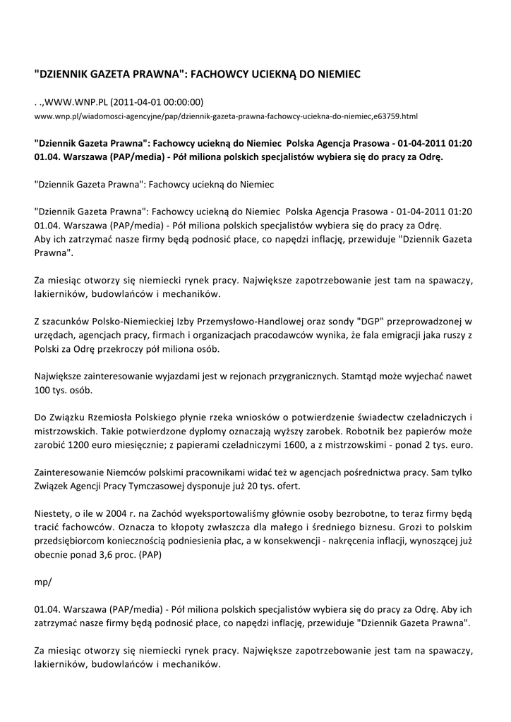 "DZIENNIK GAZETA PRAWNA": FACHOWCY UCIEKNĄ DO NIEMIEC . .,WWW.WNP.PL (2011-04-01 00:00:00) www.wnp.pl/wiadomosci-agencyjne/pap/dziennik-gazeta-prawna-fachowcy-uciekna-do-niemiec,e63759.html "Dziennik Gazeta Prawna": Fachowcy uciekną do Niemiec Polska Agencja Prasowa - 01-04-2011 01:20 01.04. Warszawa (PAP/media) - Pół miliona polskich specjalistów wybiera się do pracy za Odrę. "Dziennik Gazeta Prawna": Fachowcy uciekną do Niemiec "Dziennik Gazeta Prawna": Fachowcy uciekną do Niemiec Polska Agencja Prasowa - 01-04-2011 01:20 01.04. Warszawa (PAP/media) - Pół miliona polskich specjalistów wybiera się do pracy za Odrę. Aby ich zatrzymać nasze firmy będą podnosić płace, co napędzi inflację, przewiduje "Dziennik Gazeta Prawna". Za miesiąc otworzy się niemiecki rynek pracy. Największe zapotrzebowanie jest tam na spawaczy, lakierników, budowlańców i mechaników. Z szacunków Polsko-Niemieckiej Izby Przemysłowo-Handlowej oraz sondy "DGP" przeprowadzonej w urzędach, agencjach pracy, firmach i organizacjach pracodawców wynika, że fala emigracji jaka ruszy z Polski za Odrę przekroczy pół miliona osób. Największe zainteresowanie wyjazdami jest w rejonach przygranicznych. Stamtąd może wyjechać nawet 100 tys. osób. Do Związku Rzemiosła Polskiego płynie rzeka wniosków o potwierdzenie świadectw czeladniczych i mistrzowskich. Takie potwierdzone dyplomy oznaczają wyższy zarobek. Robotnik bez papierów może zarobić 1200 euro miesięcznie; z papierami czeladniczymi 1600, a z mistrzowskimi - ponad 2 tys. euro. Zainteresowanie Niemców polskimi pracownikami widać też w agencjach pośrednictwa pracy. Sam tylko Związek Agencji Pracy Tymczasowej dysponuje już 20 tys. ofert. Niestety, o ile w 2004 r. na Zachód wyeksportowaliśmy głównie osoby bezrobotne, to teraz firmy będą tracić fachowców. Oznacza to kłopoty zwłaszcza dla małego i średniego biznesu. Grozi to polskim przedsiębiorcom koniecznością podniesienia płac, a w konsekwencji - nakręcenia inflacji, wynoszącej już obecnie ponad 3,6 proc. (PAP) mp/ 01.04. Warszawa (PAP/media) - Pół miliona polskich specjalistów wybiera się do pracy za Odrę. Aby ich zatrzymać nasze firmy będą podnosić płace, co napędzi inflację, przewiduje "Dziennik Gazeta Prawna". Za miesiąc otworzy się niemiecki rynek pracy. Największe zapotrzebowanie jest tam na spawaczy, lakierników, budowlańców i mechaników. Z szacunków Polsko-Niemieckiej Izby Przemysłowo-Handlowej oraz sondy "DGP" przeprowadzonej w urzędach, agencjach pracy, firmach i organizacjach pracodawców wynika, że fala emigracji jaka ruszy z Polski za Odrę przekroczy pół miliona osób. Największe zainteresowanie wyjazdami jest w rejonach przygranicznych. Stamtąd może wyjechać nawet 100 tys. osób. Do Związku Rzemiosła Polskiego płynie rzeka wniosków o potwierdzenie świadectw czeladniczych i mistrzowskich. Takie potwierdzone dyplomy oznaczają wyższy zarobek. Robotnik bez papierów może zarobić 1200 euro miesięcznie; z papierami czeladniczymi 1600, a z mistrzowskimi - ponad 2 tys. euro. Zainteresowanie Niemców polskimi pracownikami widać też w agencjach pośrednictwa pracy. Sam tylko Związek Agencji Pracy Tymczasowej dysponuje już 20 tys. ofert. Niestety, o ile w 2004 r. na Zachód wyeksportowaliśmy głównie osoby bezrobotne, to teraz firmy będą tracić fachowców. Oznacza to kłopoty zwłaszcza dla małego i średniego biznesu. Grozi to polskim przedsiębiorcom koniecznością podniesienia płac, a w konsekwencji - nakręcenia inflacji, wynoszącej już obecnie ponad 3,6 proc. (PAP) mp/