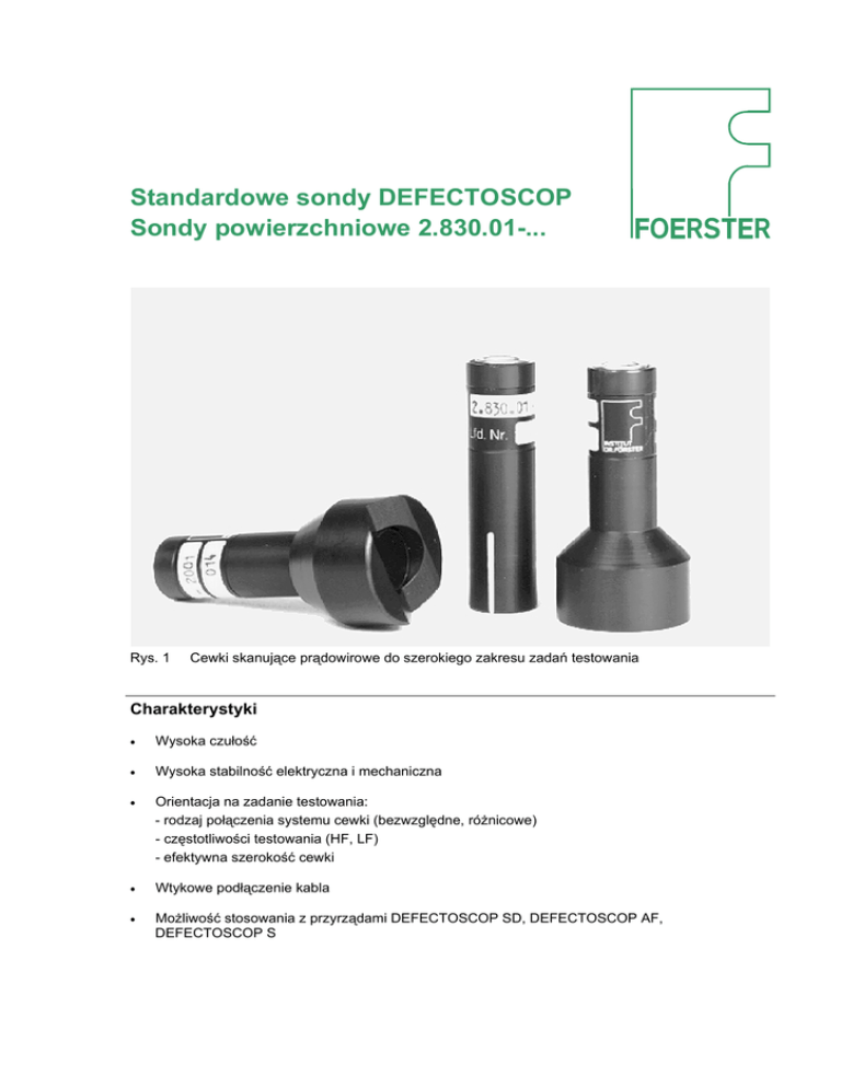 Standardowe sondy DEFECTOSCOP Sondy powierzchniowe 2.830.01-... Rys. 1 Cewki skanujące prądowirowe do szerokiego zakresu zadań testowania Charakterystyki Wysoka czułość Wysoka stabilność elektryczna i mechaniczna Orientacja na zadanie testowania: - rodzaj połączenia systemu cewki (bezwzględne, różnicowe) - częstotliwości testowania (HF, LF) - efektywna szerokość cewki Wtykowe podłączenie kabla Możliwość stosowania z przyrządami DEFECTOSCOP SD, DEFECTOSCOP AF, DEFECTOSCOP S Zastosowanie Ręczne wykrywanie pęknięć podczas prac kontrolnych i konserwacyjnych Określanie przewodności elektrycznej metali Określanie zawartości ferrytu w stalach austenitycznych Pomiar grubości nieprzewodzących powłok na bazie materiału nieferromagnetycznego Określanie stanu korozji powierzchniowej Wykrywanie "pomieszania materiału" Zadania czujnikowe, np. wskazywanie: - materiał obecny" - "zmiana geometrii" - "stan materiału". Dane techniczne Typ cewki: Układ cewek skanujących według DIN 54140 część 1 1. Metoda refleksyjna, system parametryczny bezwzględny 2. Metoda refleksyjna, system parametryczny różnicowy Wymiary Sonda bezwzględna HF Sonda bezwzględna LF Sonda różnicowa HF Sonda różnicowa LF 2 12 12 12 12 Sonda bezwzględna LF Sonda różnicowa LF 25 25 2.830 134 149 9 - 08/92 Prąd pierwotny Zakres częstotliwości Efektywna szerokość BW Szerokość toru BS Kompensacja szczeliny KA Rozdzielczość głębokości rowka KNT Rozdzielczość przestrzenna KO Długość wady wzorcowej KL Rdzeń cewki Masa Ekranowanie Prąd pierwotny Zakres częstotliwości Efektywna szerokość BW Szerokość toru BS Kompensacja szczeliny KA Rozdzielczość głębokości rowka KNT Rozdzielczość przestrzenna KO Długość wady wzorcowej KL Rdzeń cewki Masa Ekranowanie Sonda bezwzględna HF 12 102 161 3 Sonda bezwzględna LF 12 108 209 4 Sonda bezwzględna LF 25 102 169 9 max. 1,4 10 do 1000 6 10 1,2 ≥5 5 13 Nie ok. 15 Nie max. 1,4 0,1 do 10 6 10 1,2 ≥5 5 14 Nie ok. 15 Nie max. 1,4 0,1 do 10 9 19 1,6 ≥5 5 29 Nie ok. 20 Nie Sonda różnicowa LF 12 102 176 1 Sonda różnicowa LF 12 102 183 4 Sonda różnicowa LF 25 108 214 0 max. 1,4 10 do 1000 6 max. 1,4 0,1 do 10 6 max. 1,4 0,1 do 10 8,5 0,75 ≥5 5 0,75 ≥5 5 1,2 ≥5 8 Tak ok. 15 Nie Tak ok. 15 Nie Nie ok. 20 Nie Jednostka A kHz mm mm mm mm mm mm g Jednostka A kHz mm mm mm mm mm mm g Instrukcje dotyczące zamawiania Opis Nr części Nr zamówienia Sonda bezwzględna HF 12 2.830.01-2001 102 161 3 Sonda bezwzględna LF 12 2.830.01-2011 108 209 4 Sonda bezwzględna LF 25 2.830.01-2031 102 169 9 Sonda różnicowa HF 12 2.830.01-2101 102 176 1 Sonda różnicowa LF 12 2.830.01-2111 102 183 4 Sonda różnicowa LF 25 2.830.01-2131 108 214 0 Kabel sondy, długość 3 m 2.832.01-9902 132 216 8 2.830 134 149 9 - 08/92 3 W razie wystąpienia szczególnych problemów prosimy o kontakt z firmą: FOERSTER INSTRUMENTS INCORPORATED 140 Industry Drive RIDC Park West Pittsburgh, PA 15275-1028 Tel.: (412) 788-8976 Fax: (412) 788-8984 E-mail: [email protected] Informacje i ilustracje mogą ulec zmianie. Nr zamówienia: Wydanie: 4 134 149 9 08/92 2.830 134 149 9 - 08/92